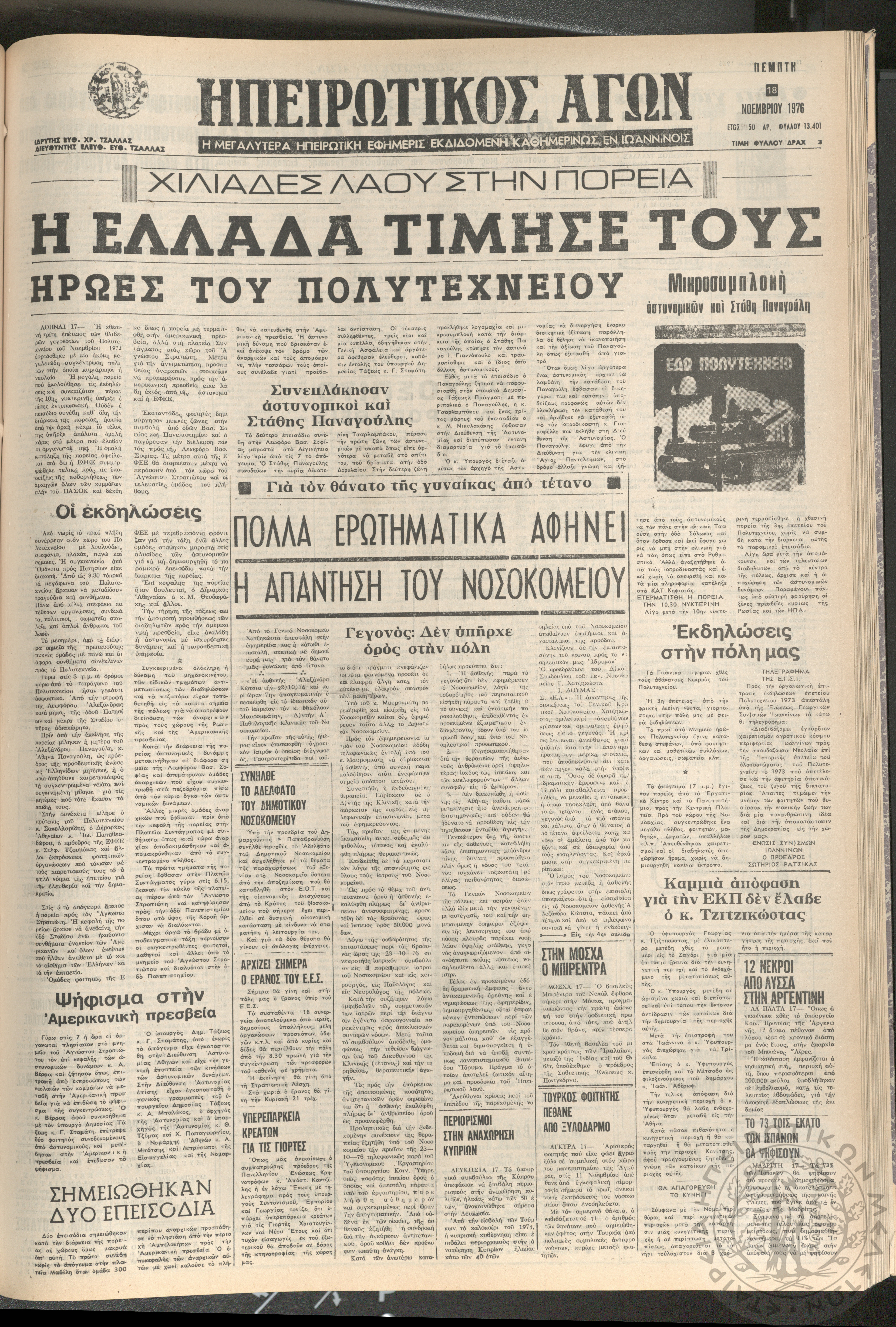 Ηπειρωτικός Αγών: η μεγαλυτέρα ηπειρωτική εφημερίς εκδιδόμενη καθημερινώς εν Ιωαννίνοις 1976 (φ. 13401)Έτος 50, φ. 13401...