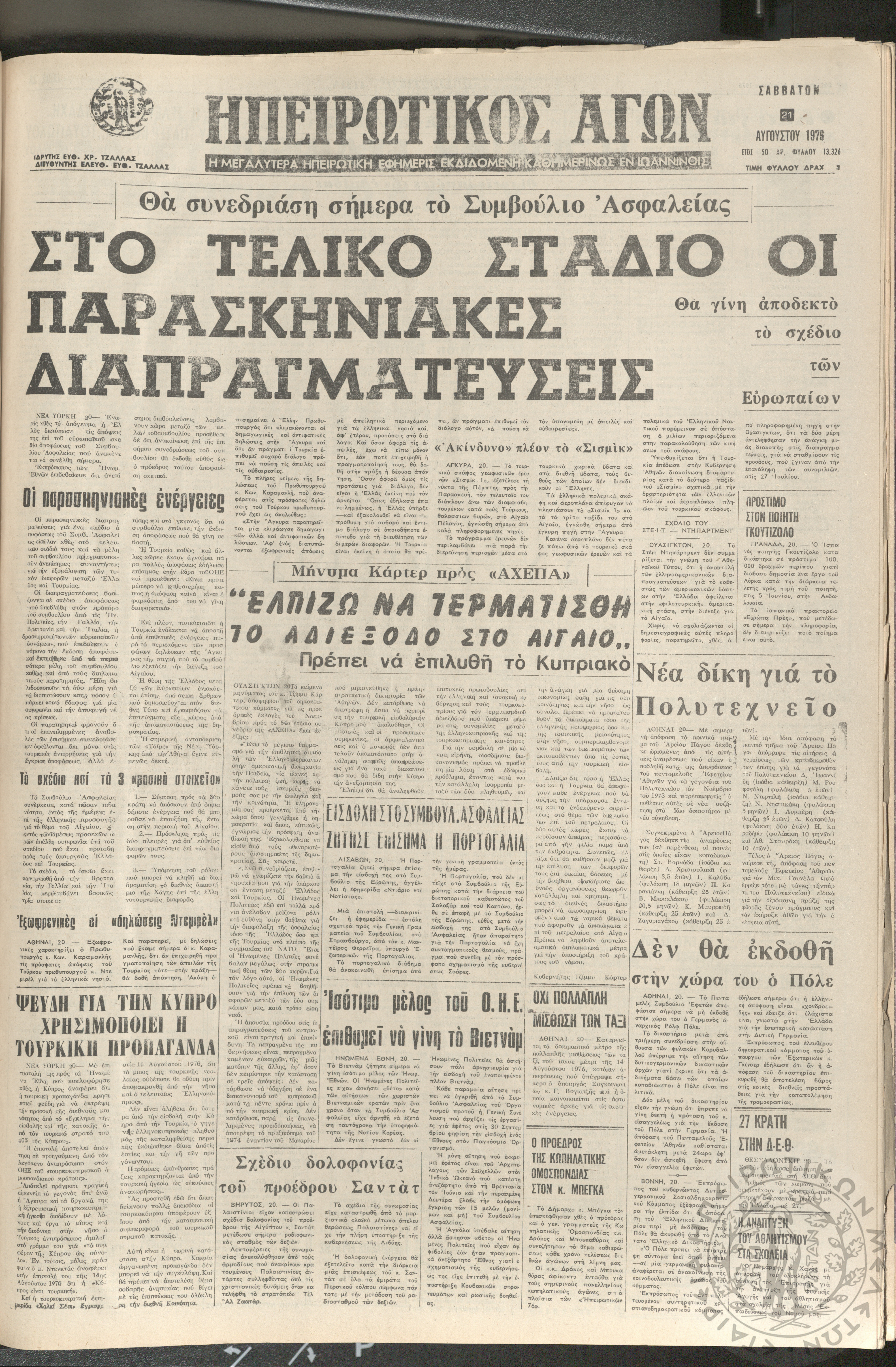Ηπειρωτικός Αγών: η μεγαλυτέρα ηπειρωτική εφημερίς εκδιδόμενη καθημερινώς εν Ιωαννίνοις 1976 (φ. 13326)Έτος 50, φ. 13326...