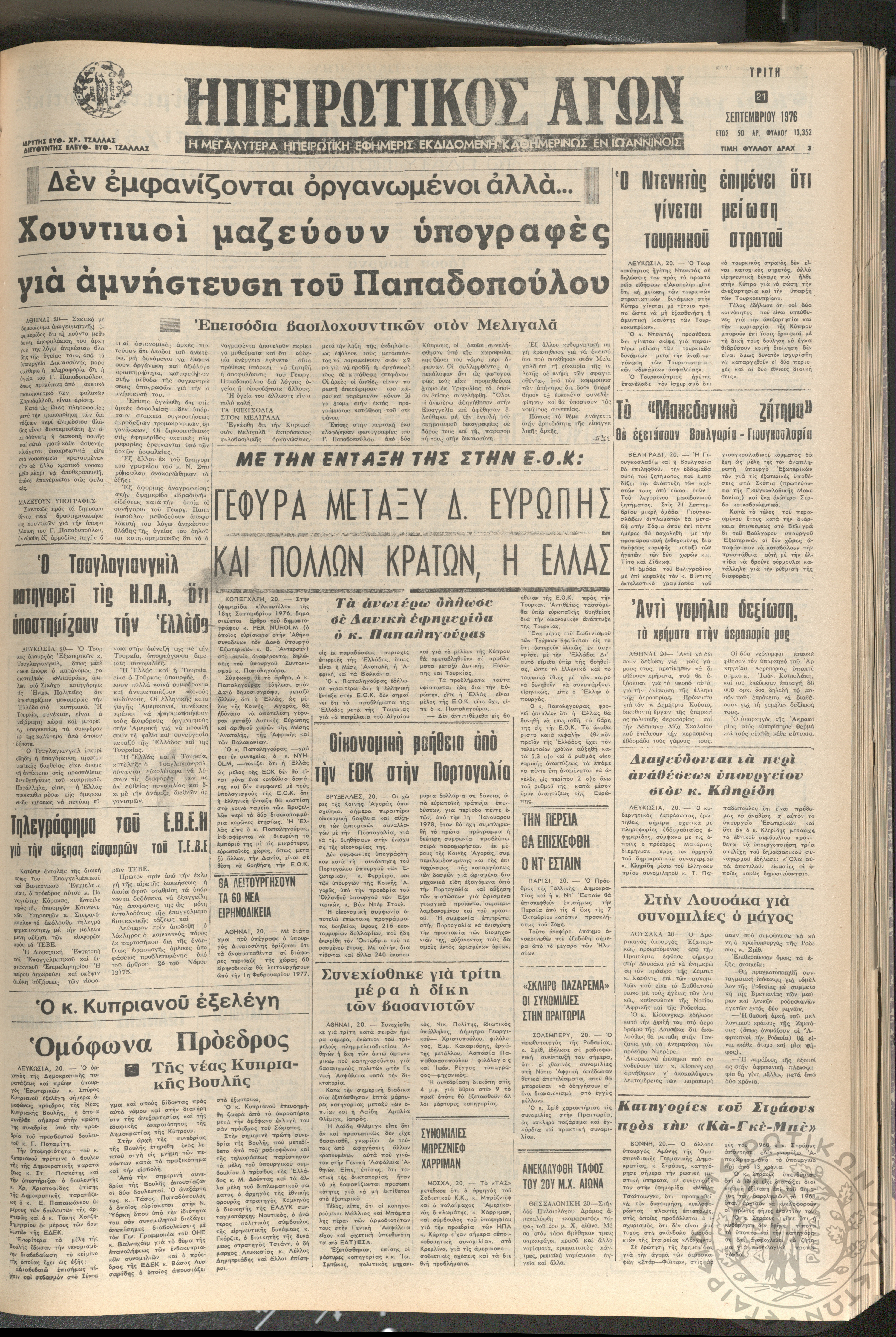 Ηπειρωτικός Αγών: η μεγαλυτέρα ηπειρωτική εφημερίς εκδιδόμενη καθημερινώς εν Ιωαννίνοις 1976 (φ. 13352)Έτος 50, φ. 13352...