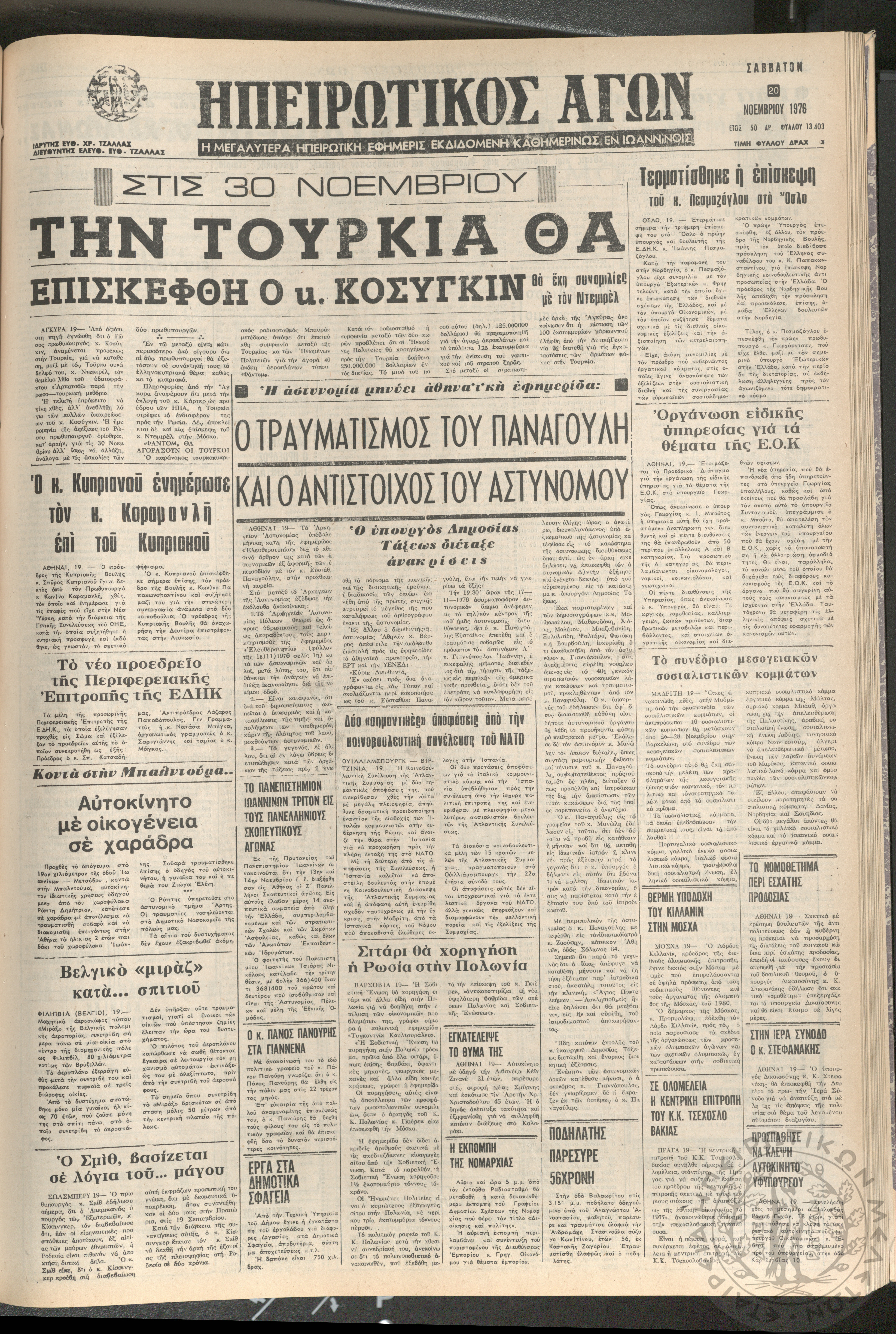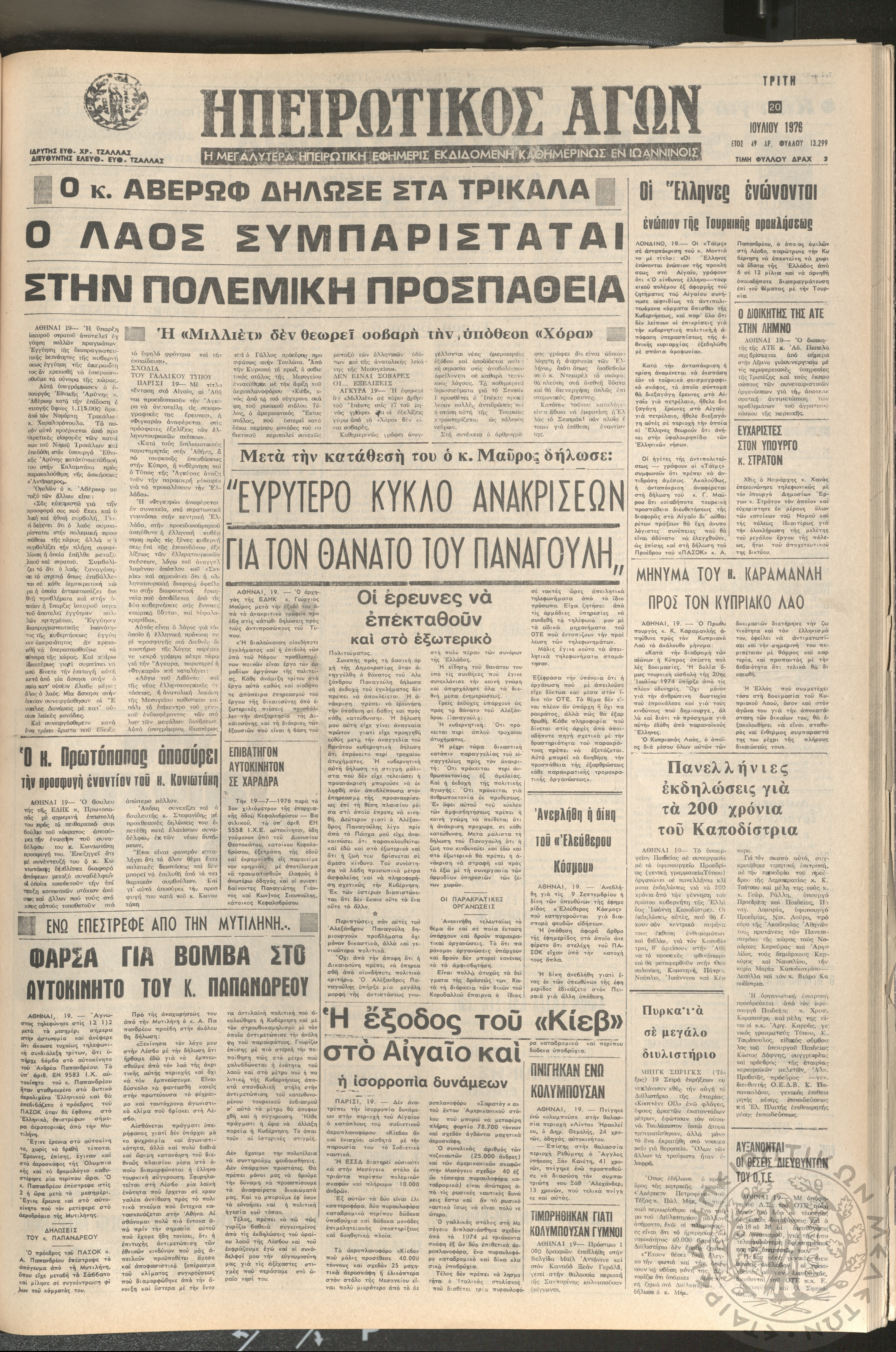 Ηπειρωτικός Αγών: η μεγαλυτέρα ηπειρωτική εφημερίς εκδιδόμενη καθημερινώς εν Ιωαννίνοις 1976 (φ. 13300)Έτος 49, φ. 13300...