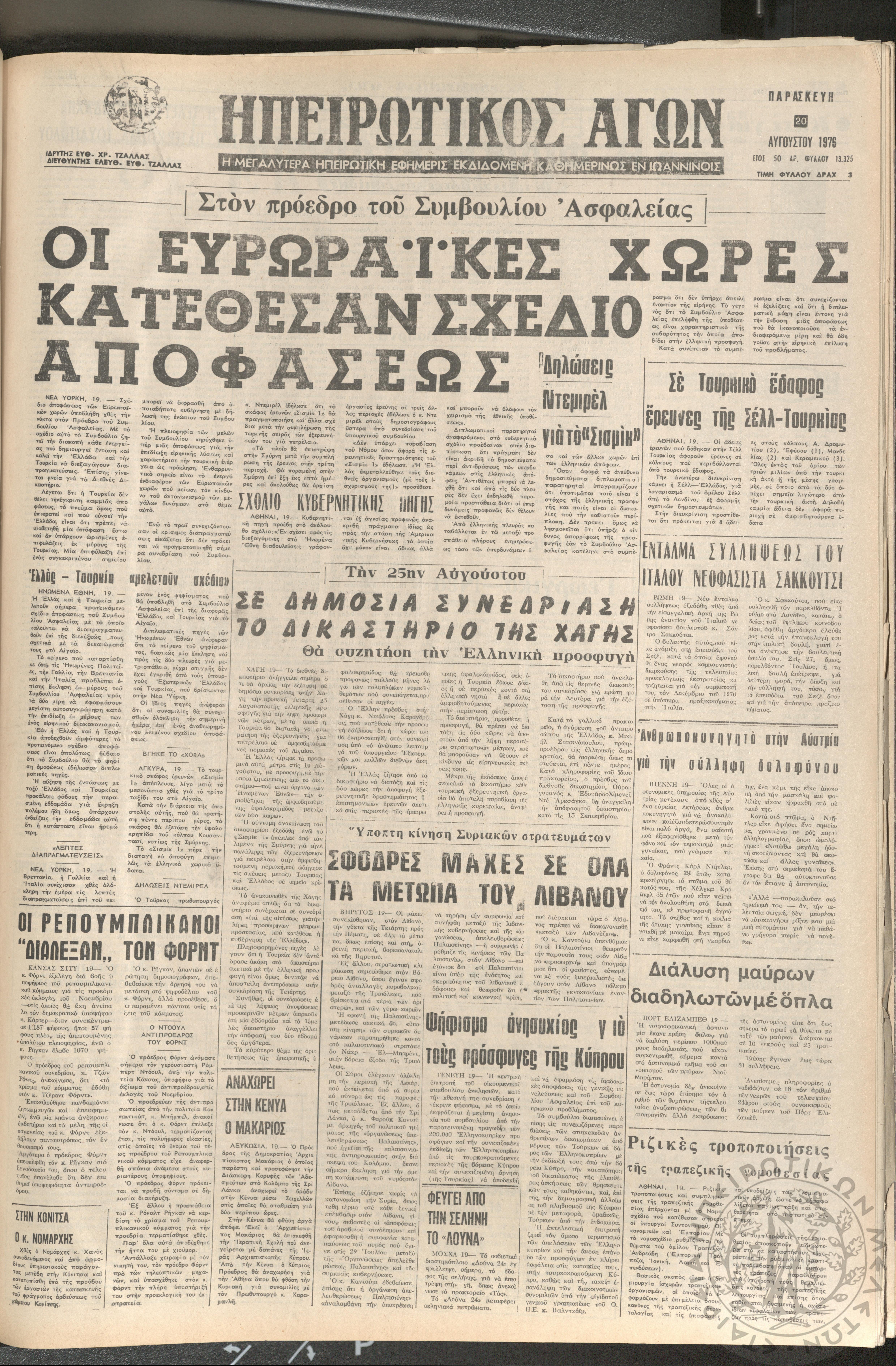 Ηπειρωτικός Αγών: η μεγαλυτέρα ηπειρωτική εφημερίς εκδιδόμενη καθημερινώς εν Ιωαννίνοις 1976 (φ. 13325)Έτος 50, φ. 13325...