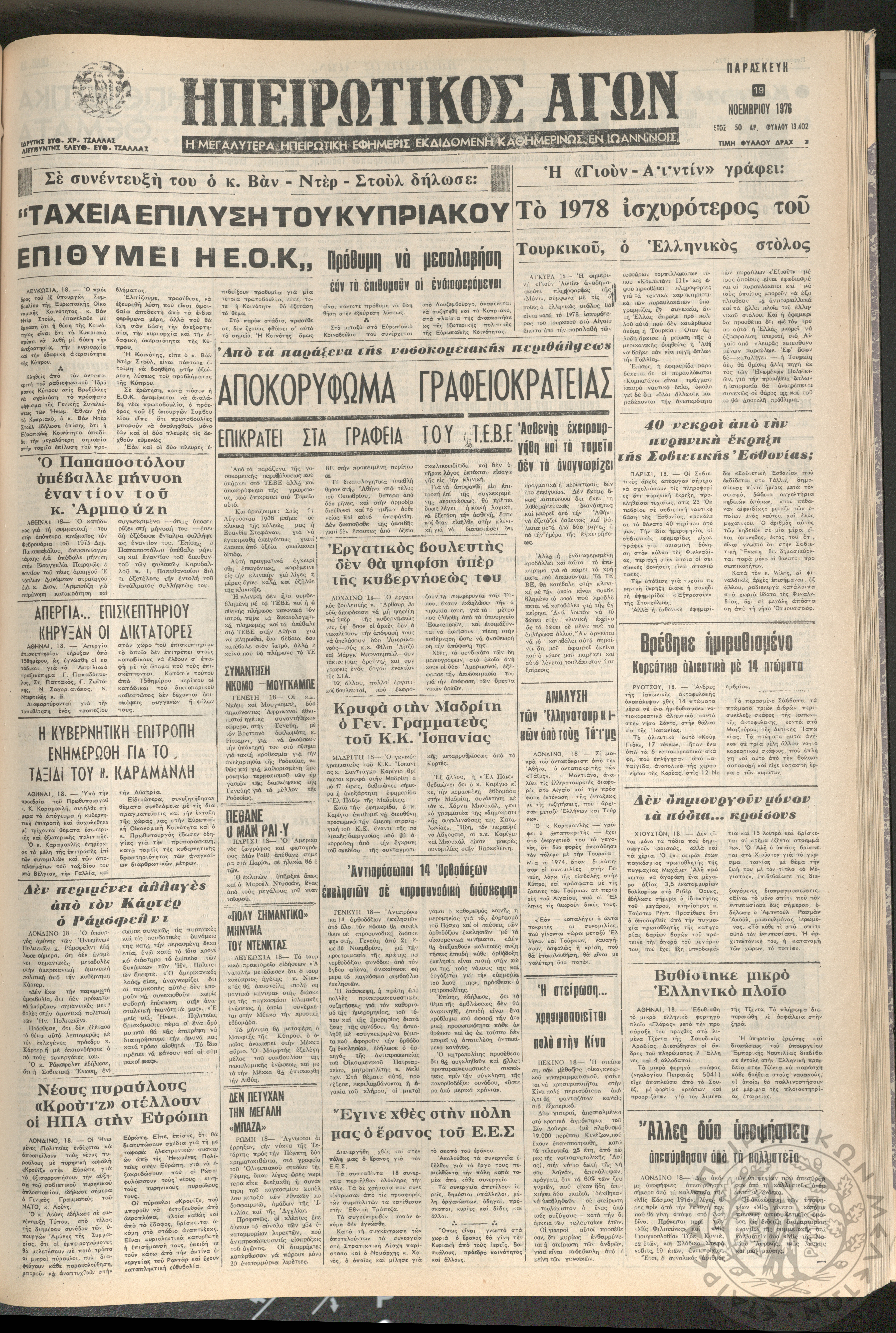Ηπειρωτικός Αγών: η μεγαλυτέρα ηπειρωτική εφημερίς εκδιδόμενη καθημερινώς εν Ιωαννίνοις 1976 (φ. 13402)Έτος 50, φ. 13402...