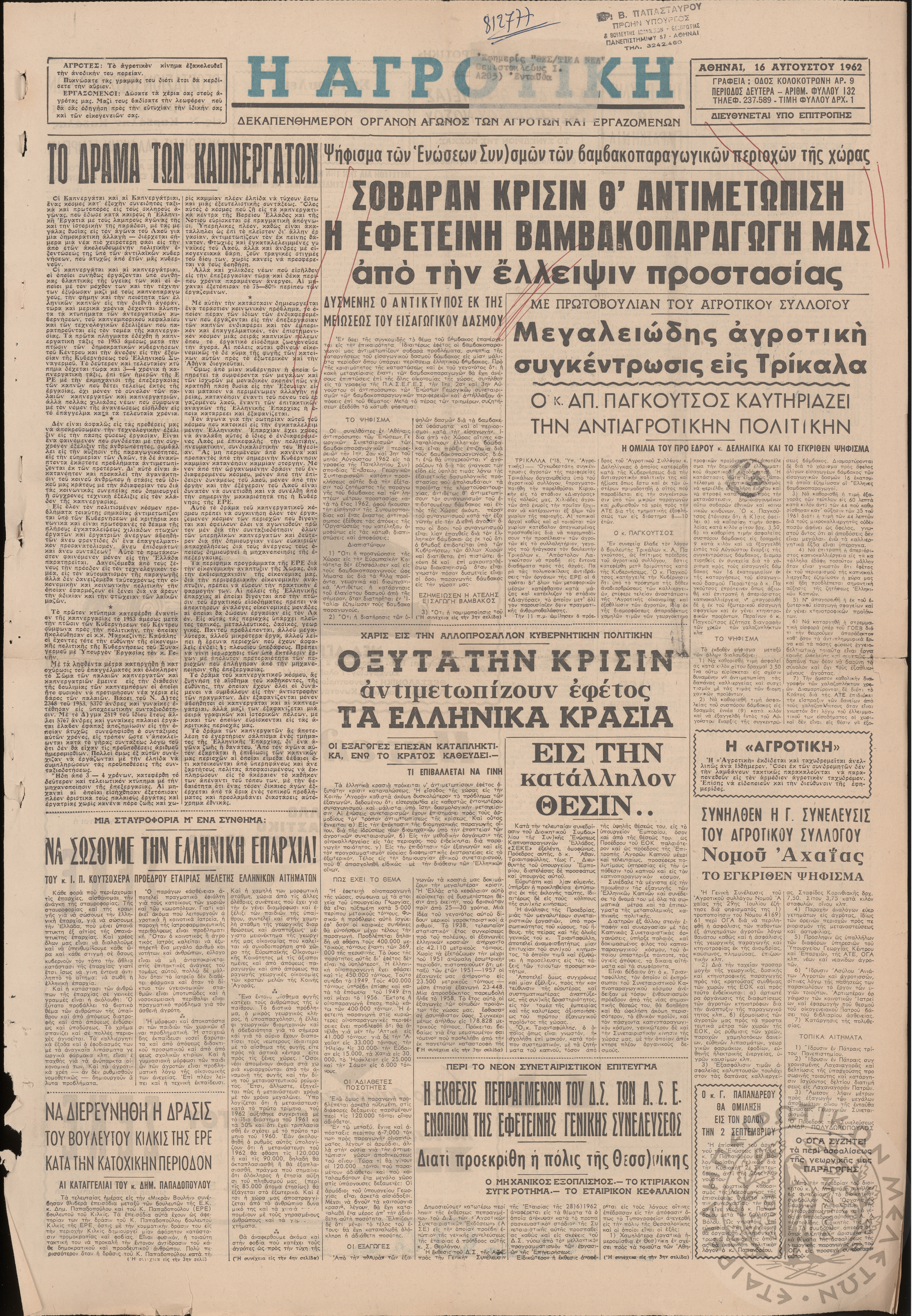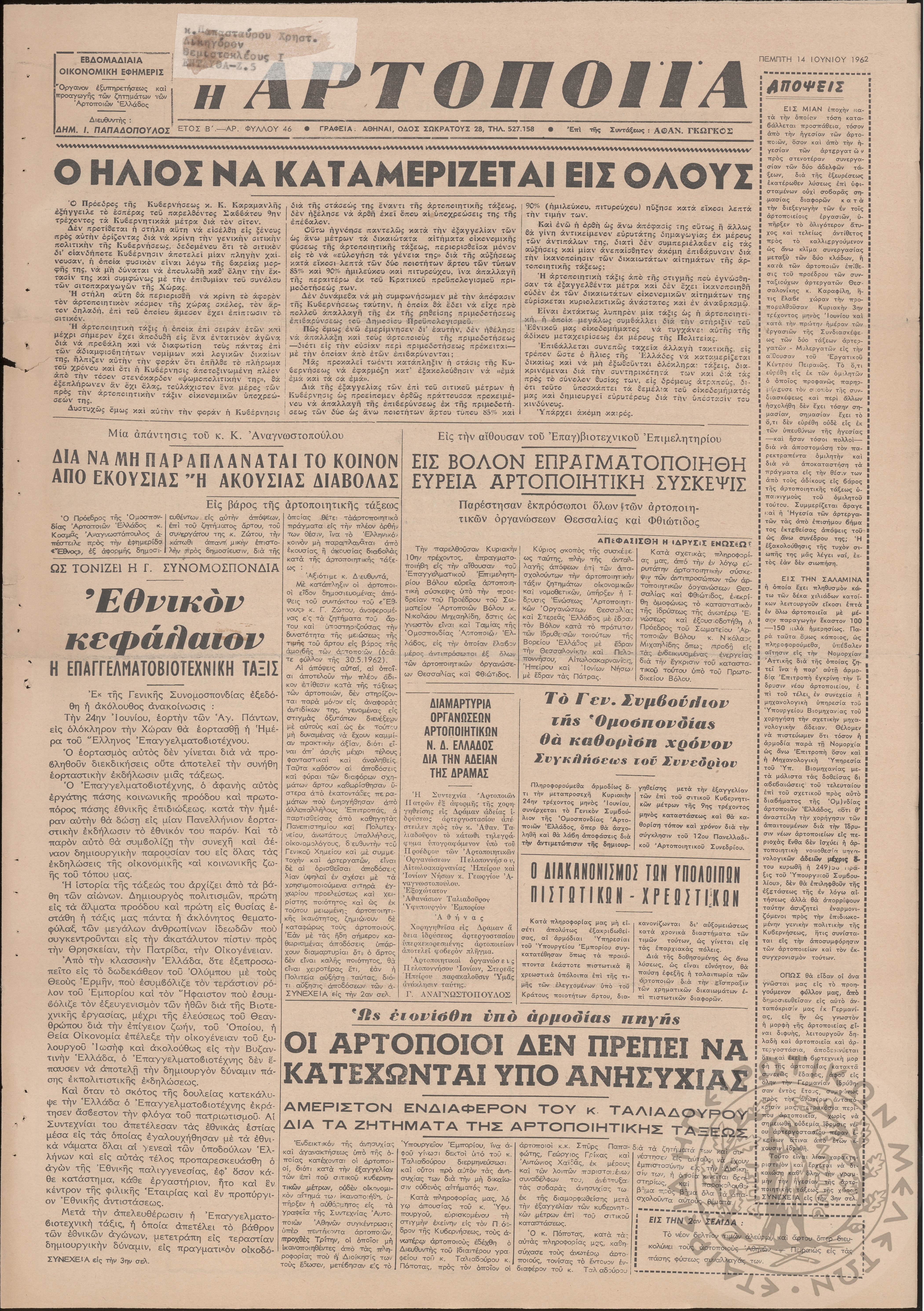 Η Αρτοποιία: εβδομαδιαία οικονομική εφημερίς, όργανον εξυπηρέτησεως και προαγωγής των ζητημάτων των αρτοποιών της Ελλάδας, 1962, φ. 46Έτος Β΄, φ. 46...