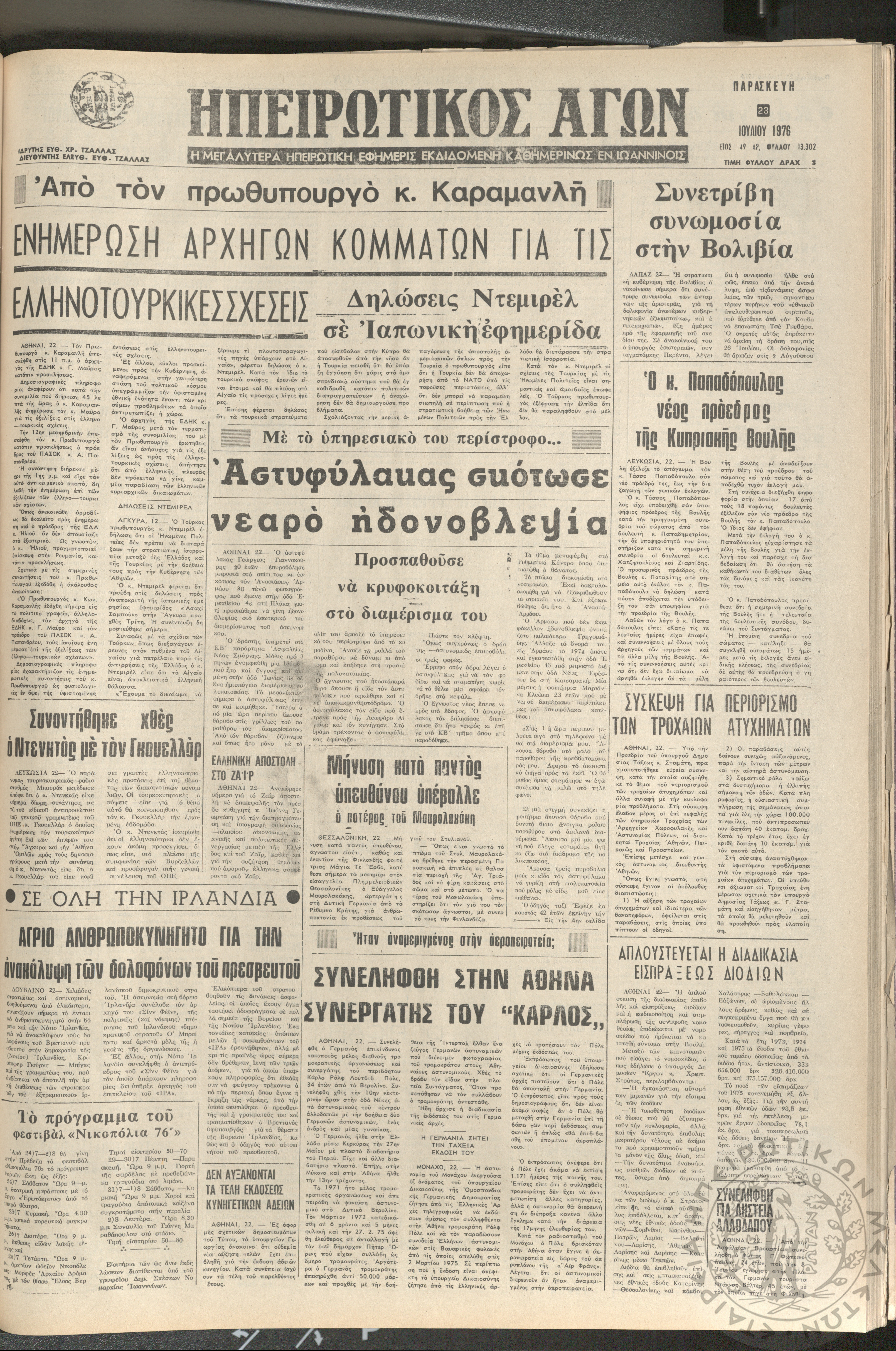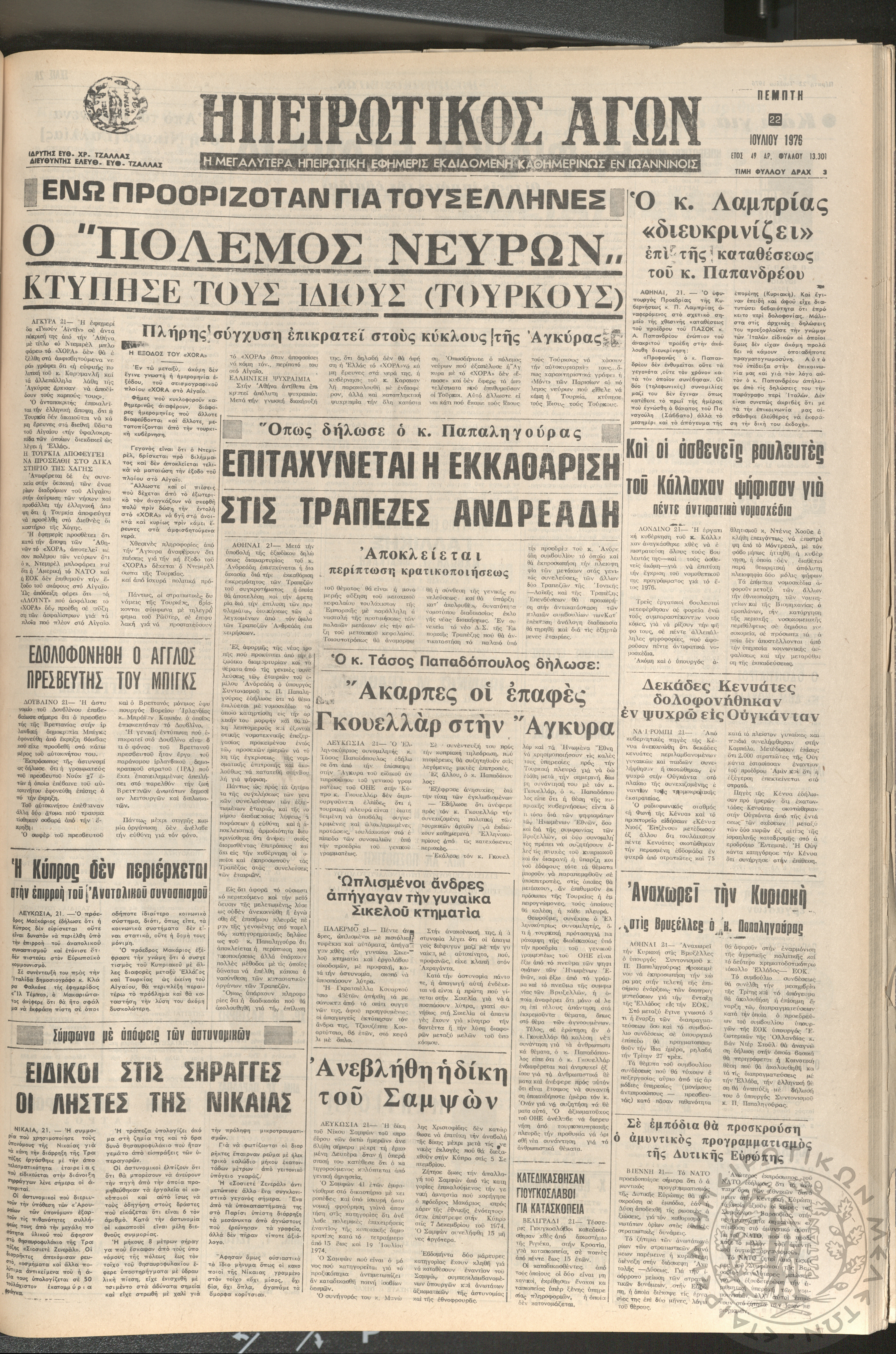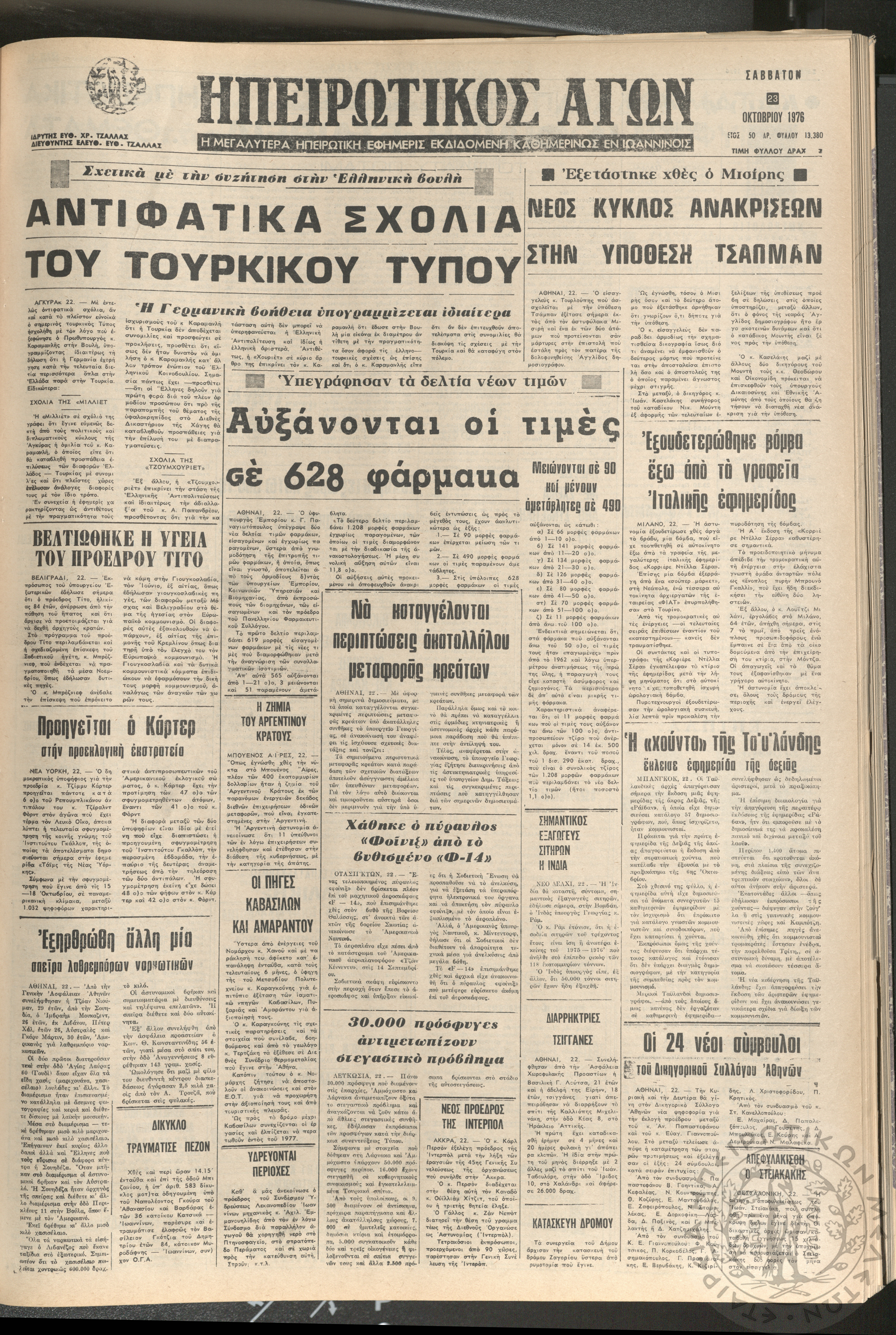 Ηπειρωτικός Αγών: η μεγαλυτέρα ηπειρωτική εφημερίς εκδιδόμενη καθημερινώς εν Ιωαννίνοις 1976 (φ. 13303)Έτος 49, φ. 13303...