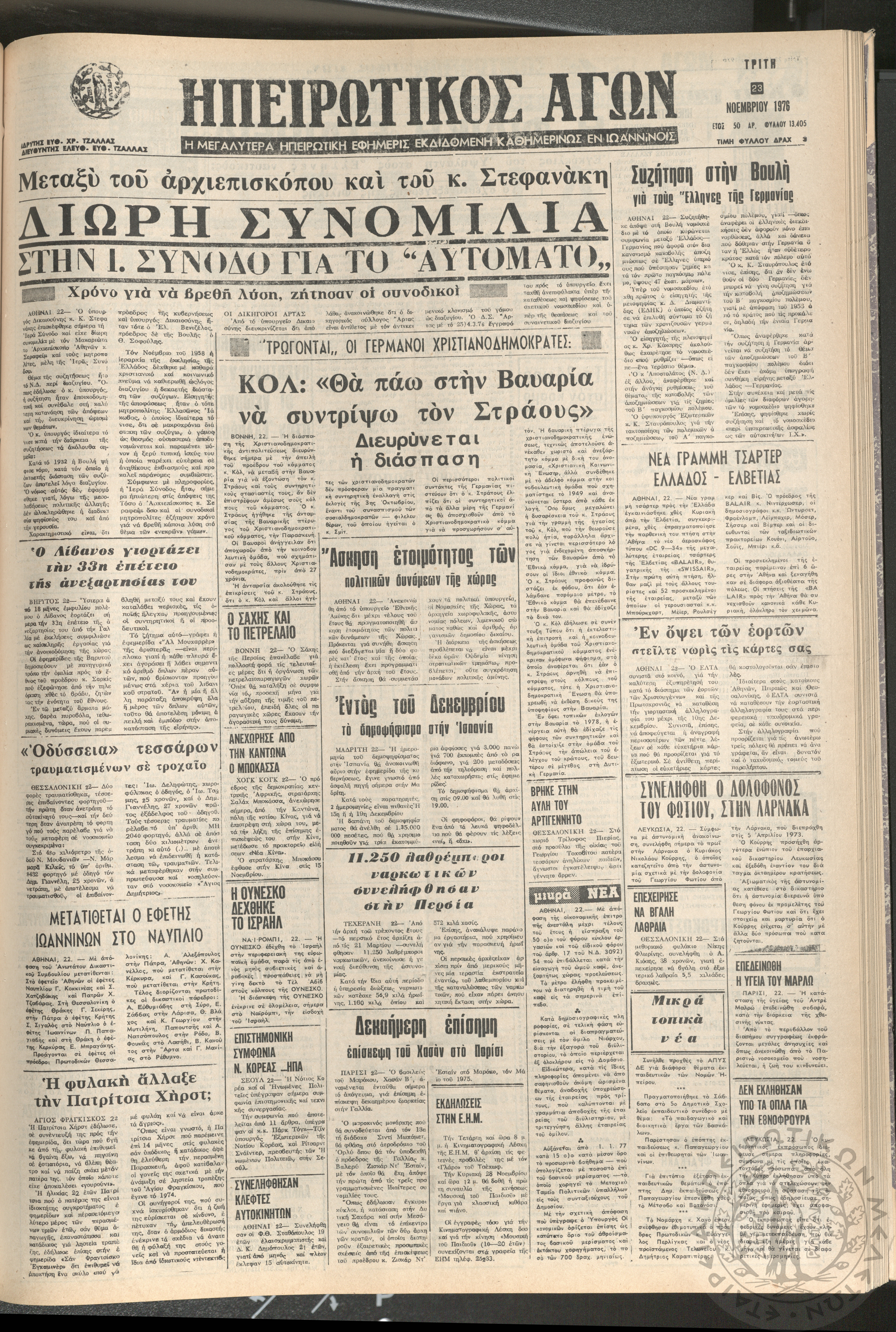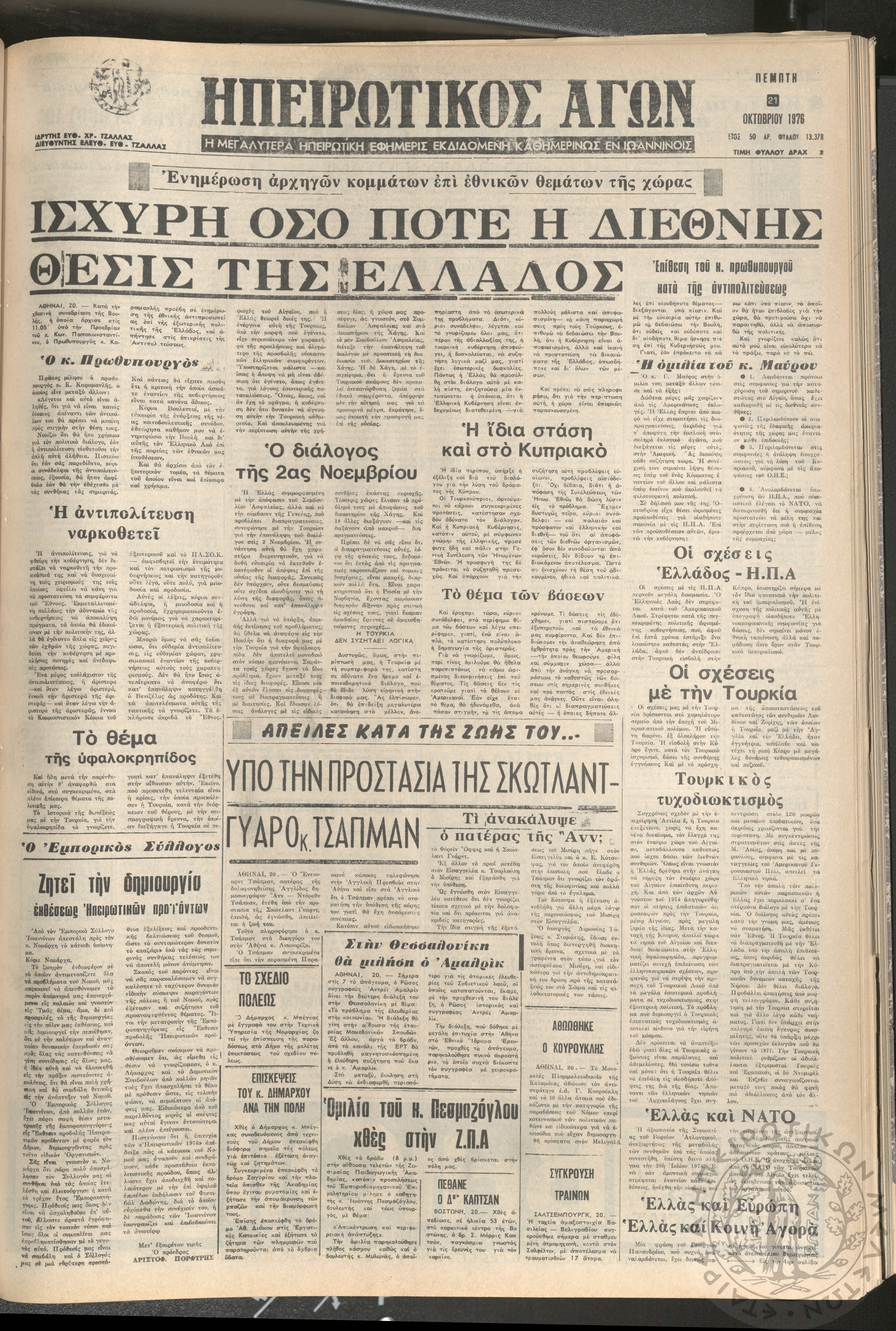 Ηπειρωτικός Αγών: η μεγαλυτέρα ηπειρωτική εφημερίς εκδιδόμενη καθημερινώς εν Ιωαννίνοις 1976 (φ. 13405)Έτος 50, φ.13405...