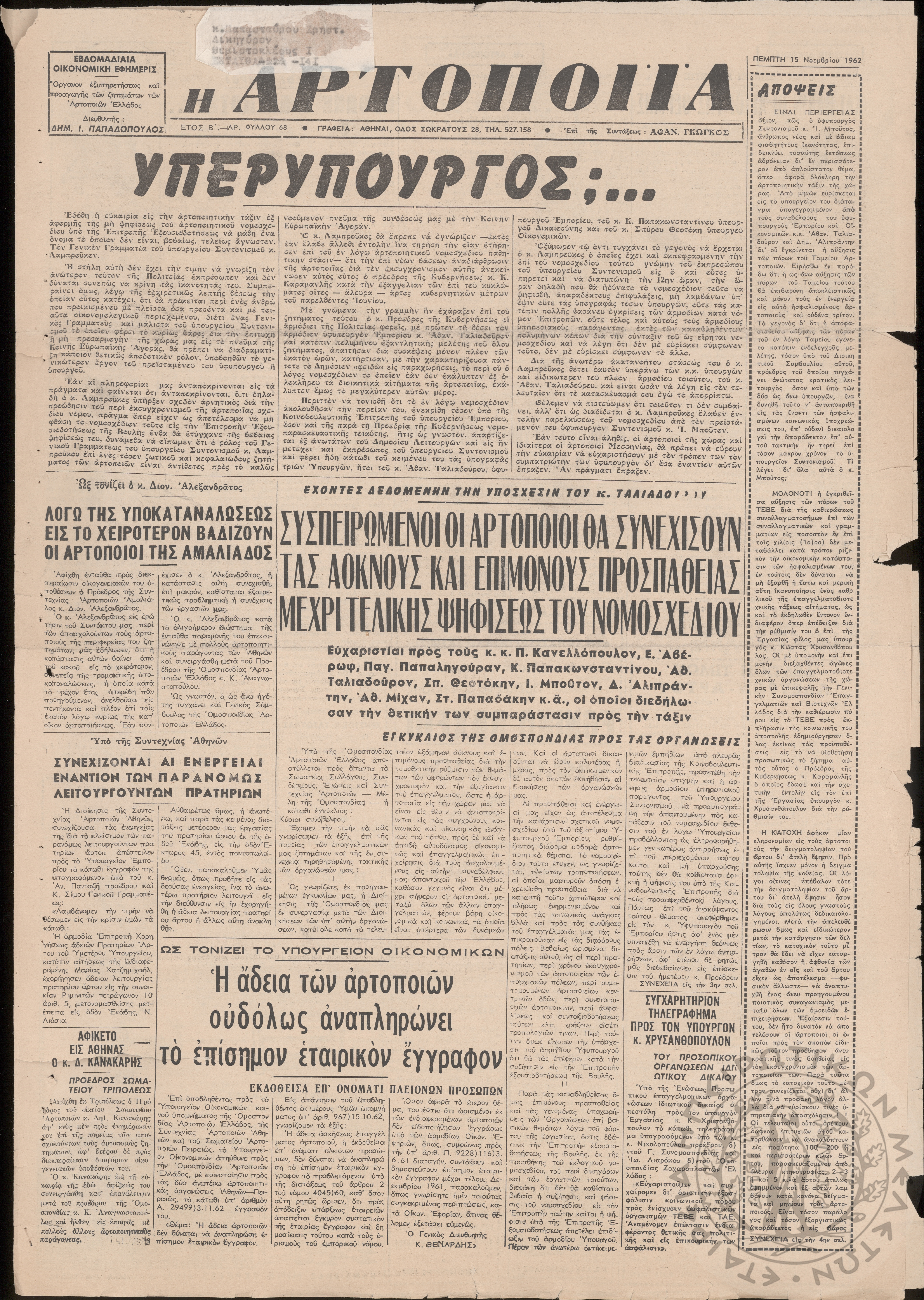 Η Αρτοποιία: εβδομαδιαία οικονομική εφημερίς, όργανον εξυπηρέτησεως και προαγωγής των ζητημάτων των αρτοποιών της Ελλάδας, 1962, φ. 68Έτος Β΄, φ. 68...