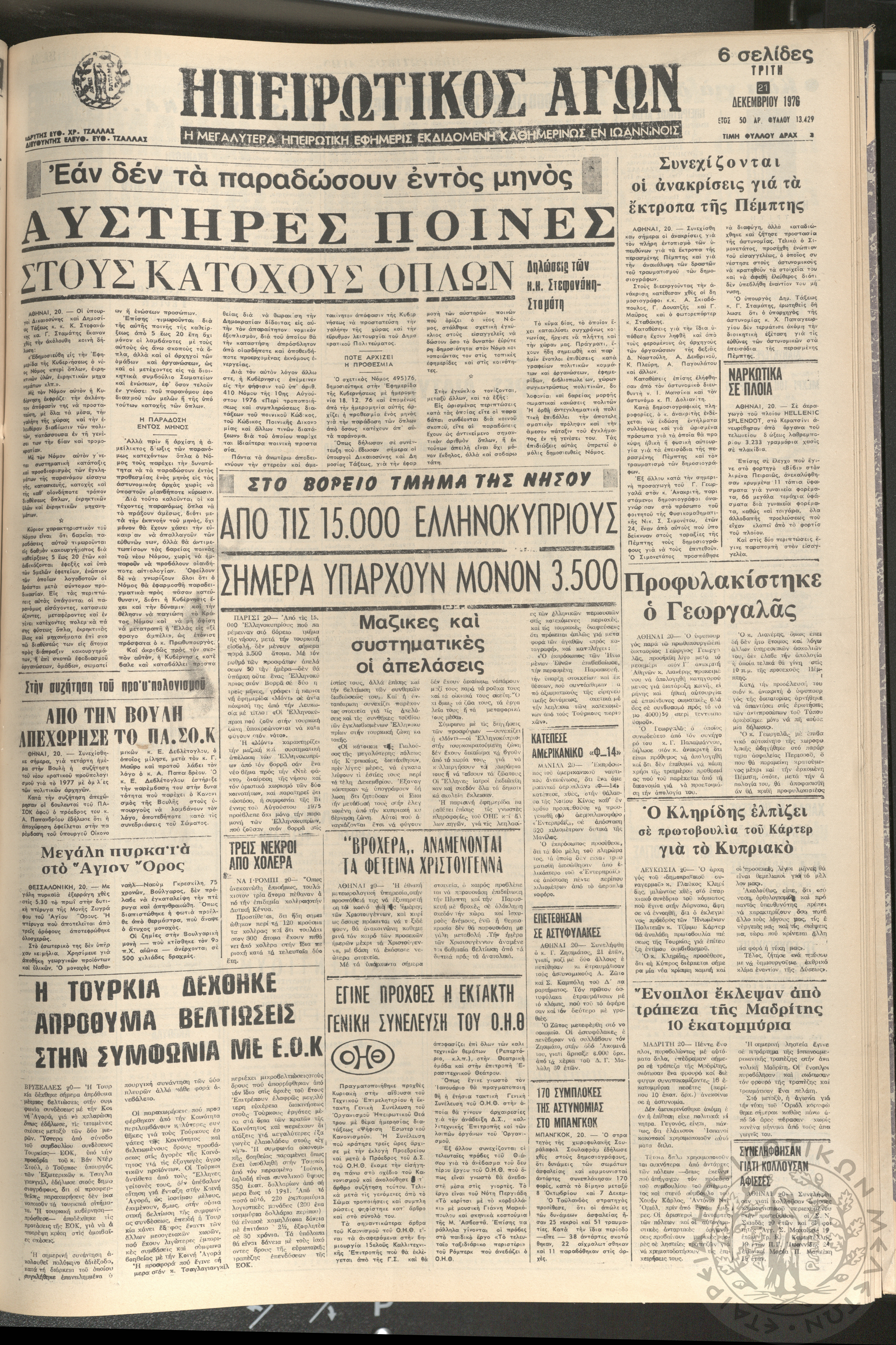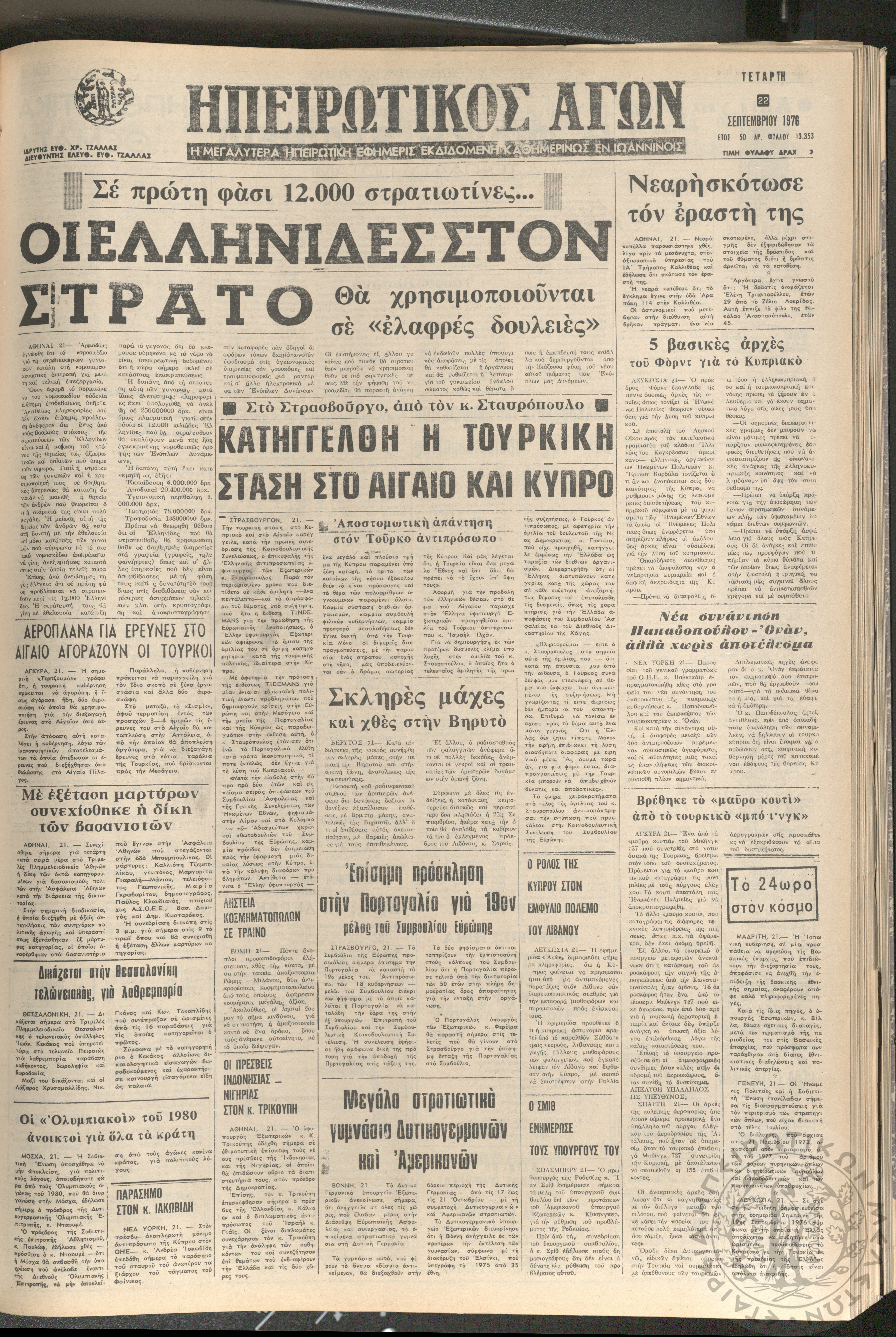 Ηπειρωτικός Αγών: η μεγαλυτέρα ηπειρωτική εφημερίς εκδιδόμενη καθημερινώς εν Ιωαννίνοις 1976 (φ. 13353)Έτος 50, φ. 13353...
