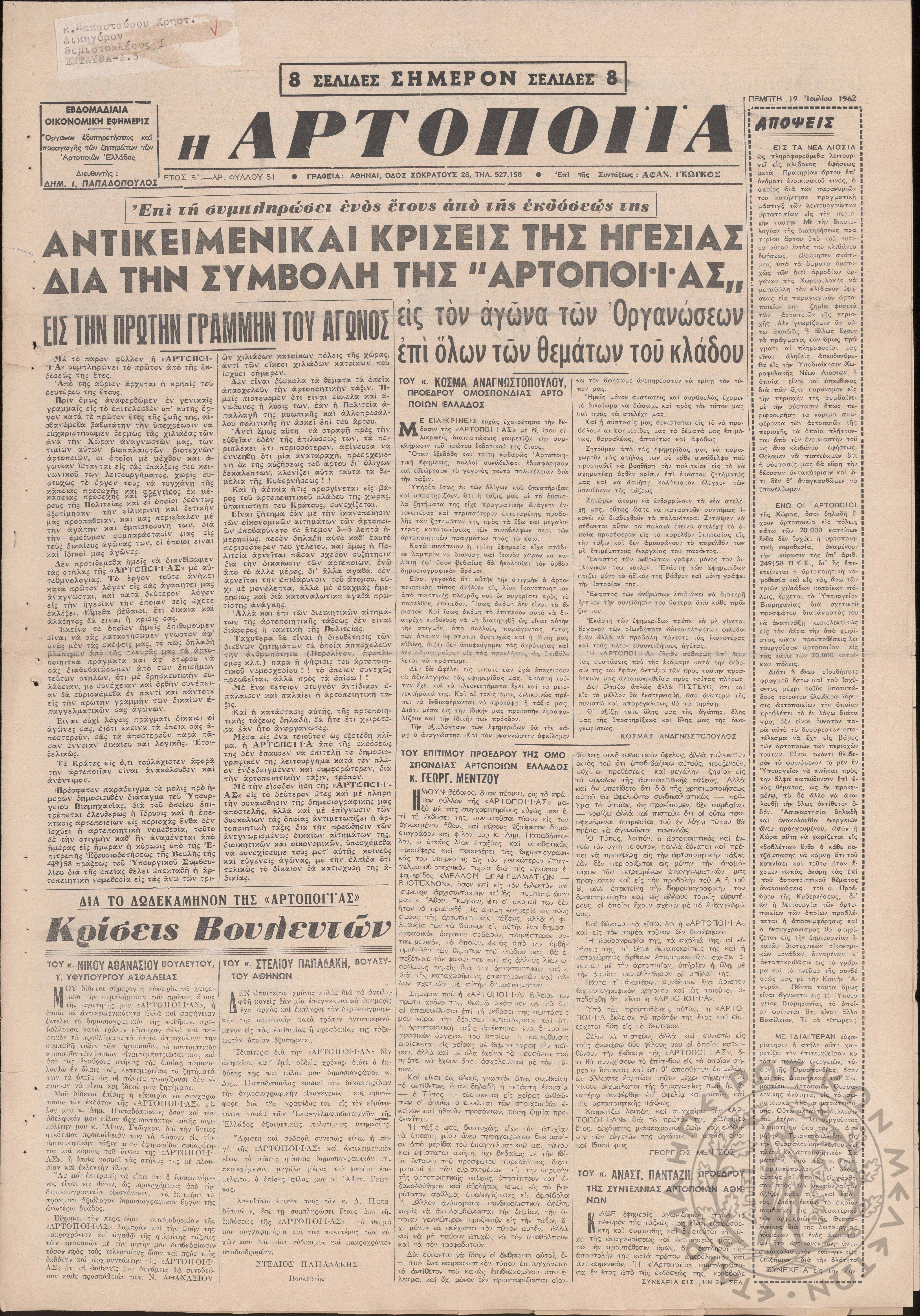 Η Αρτοποιία: εβδομαδιαία οικονομική εφημερίς, όργανον εξυπηρέτησεως και προαγωγής των ζητημάτων των αρτοποιών της Ελλάδας, 1962, φ. 51Έτος Β΄, φ. 51...