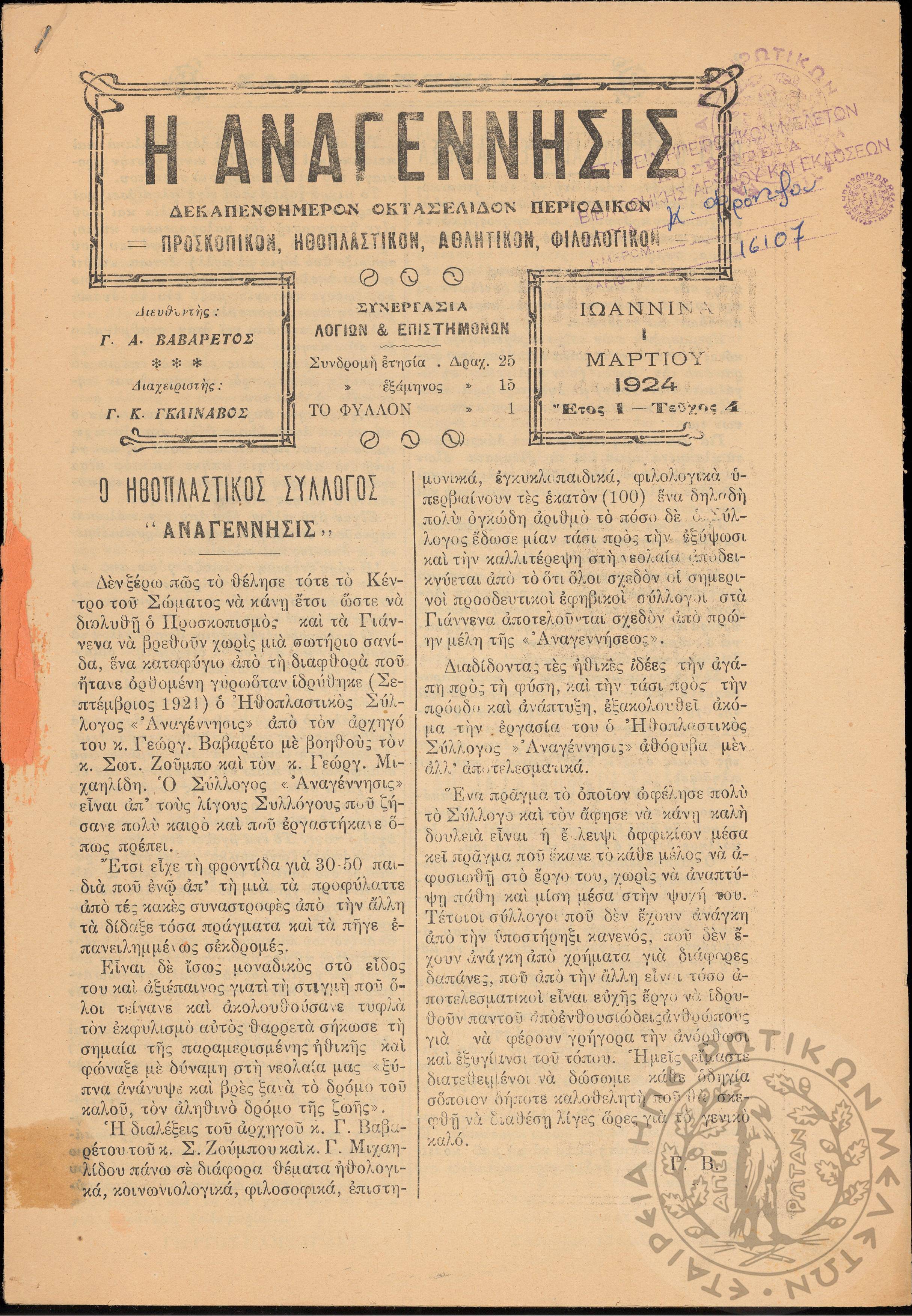 Η Αναγέννησις: δεκαπενθήμερον οκτασέλιδον περιοδικόν προσκοπικόν, ηθοπλαστικόν, αθλητικόν, φιλολογικόν (τεύχ. 4)Έτος 1, τεύχ. 4...