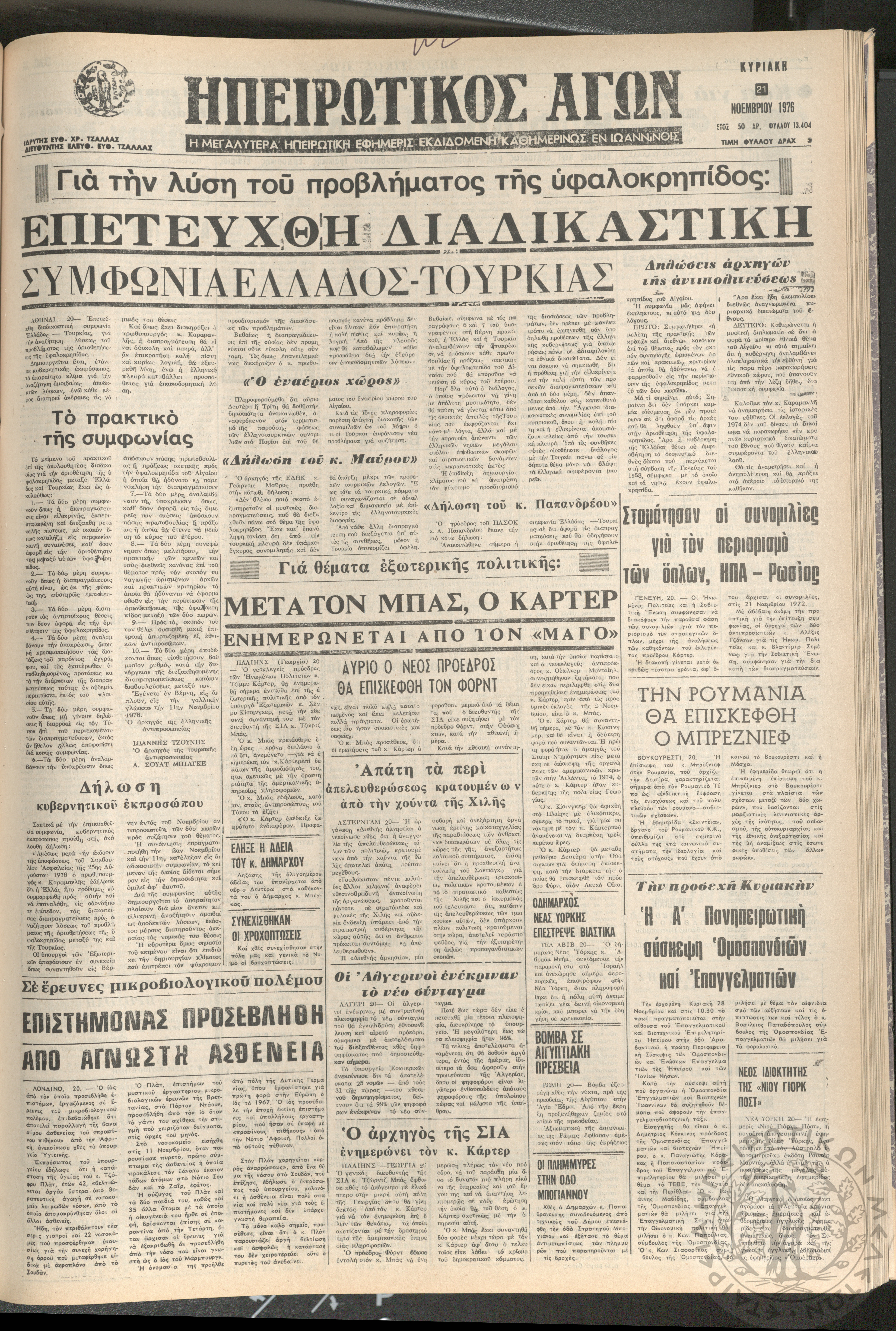 Ηπειρωτικός Αγών: η μεγαλυτέρα ηπειρωτική εφημερίς εκδιδόμενη καθημερινώς εν Ιωαννίνοις 1976 (φ. 13404)Έτος 50, φ. 13404...