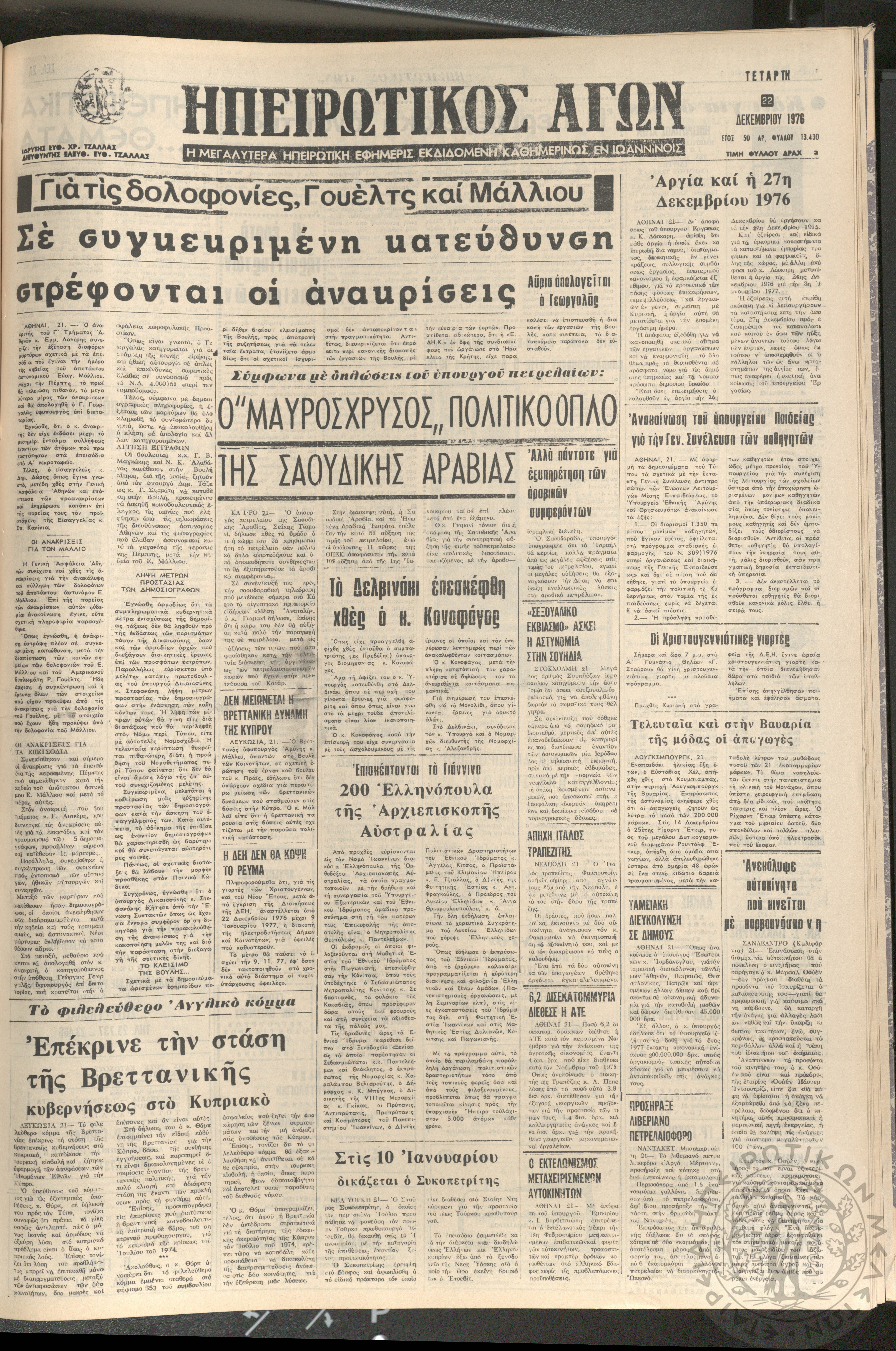 Ηπειρωτικός Αγών: η μεγαλυτέρα ηπειρωτική εφημερίς εκδιδόμενη καθημερινώς εν Ιωαννίνοις 1976 (φ. 13430)Έτος 50, φ. 13430...