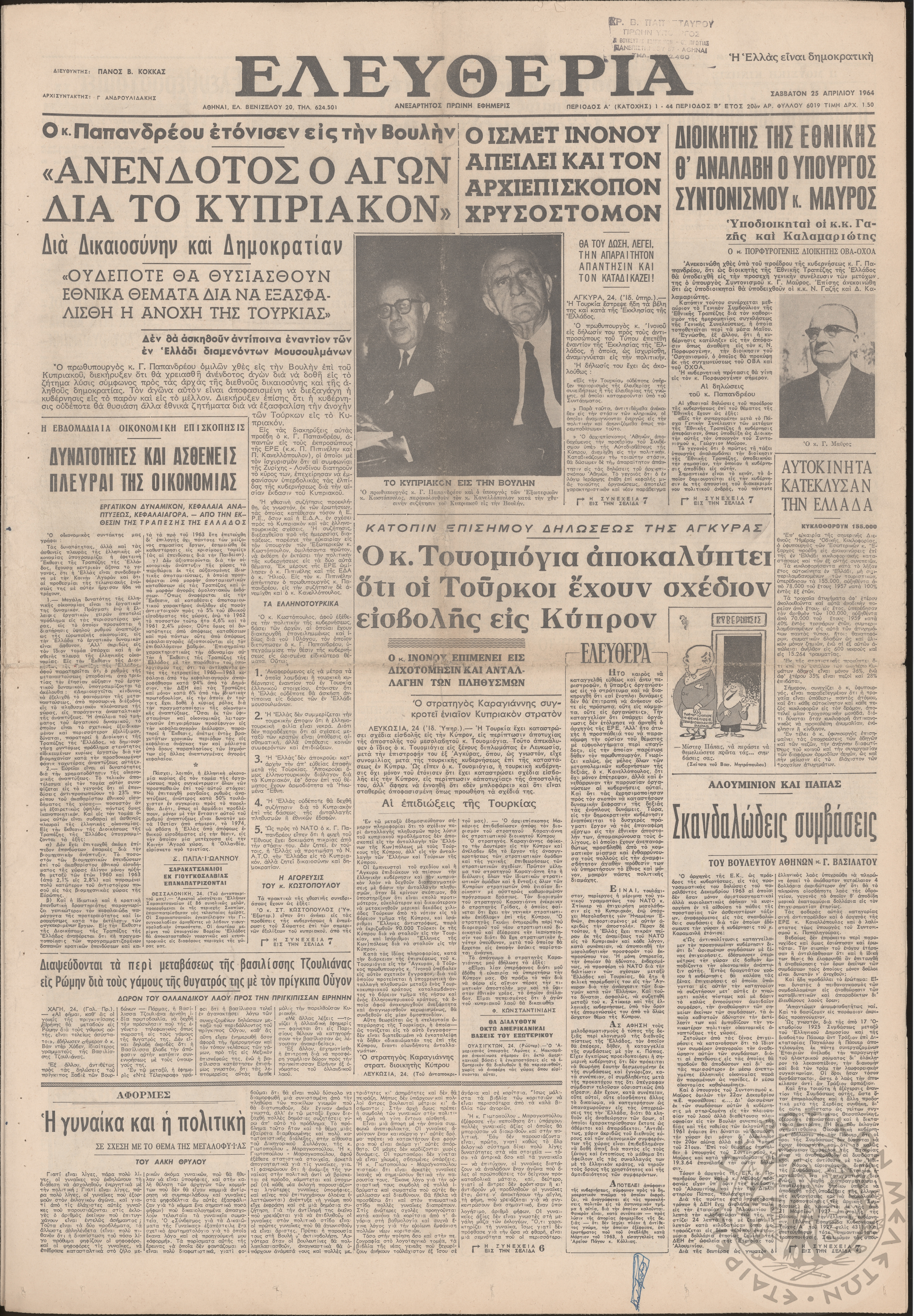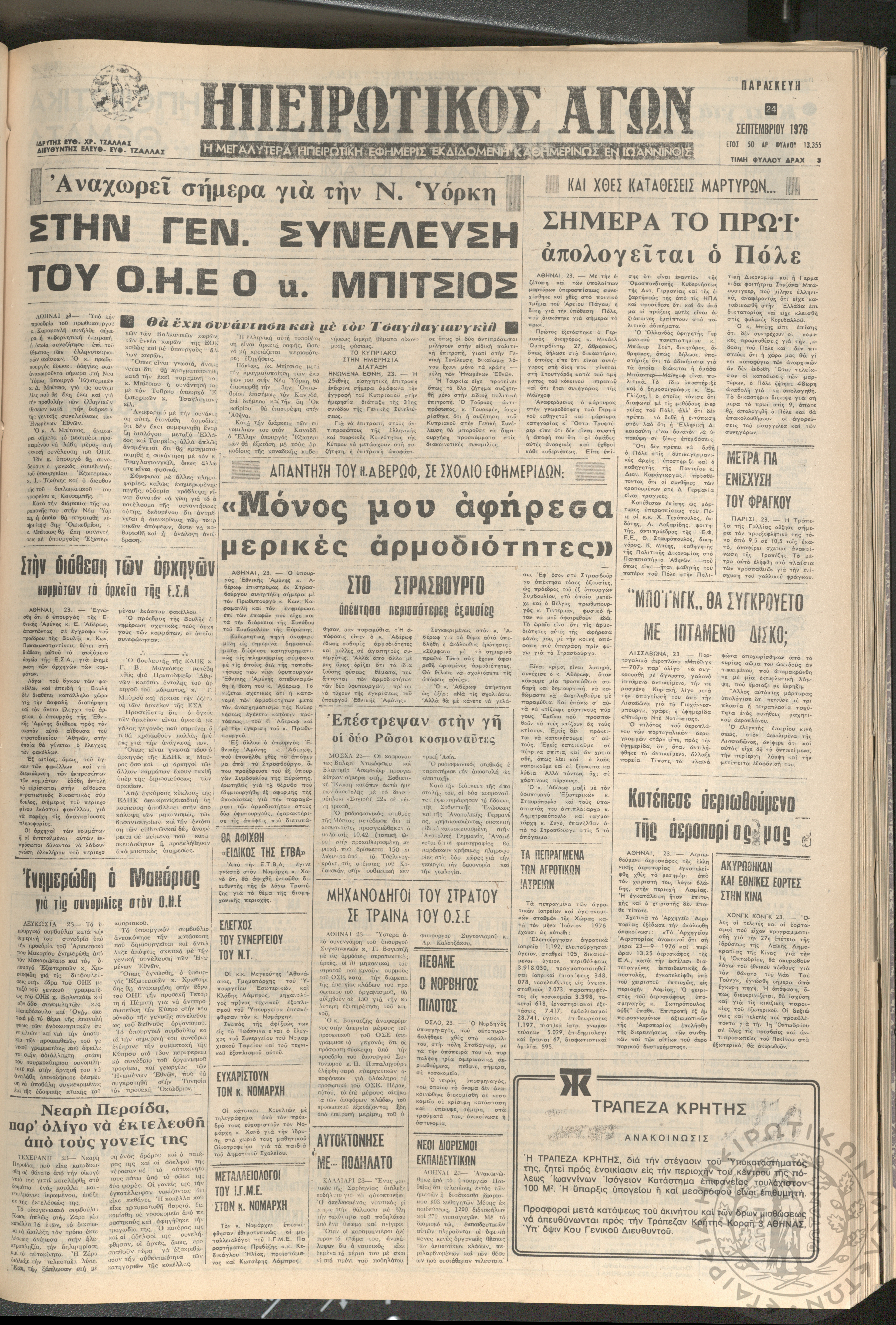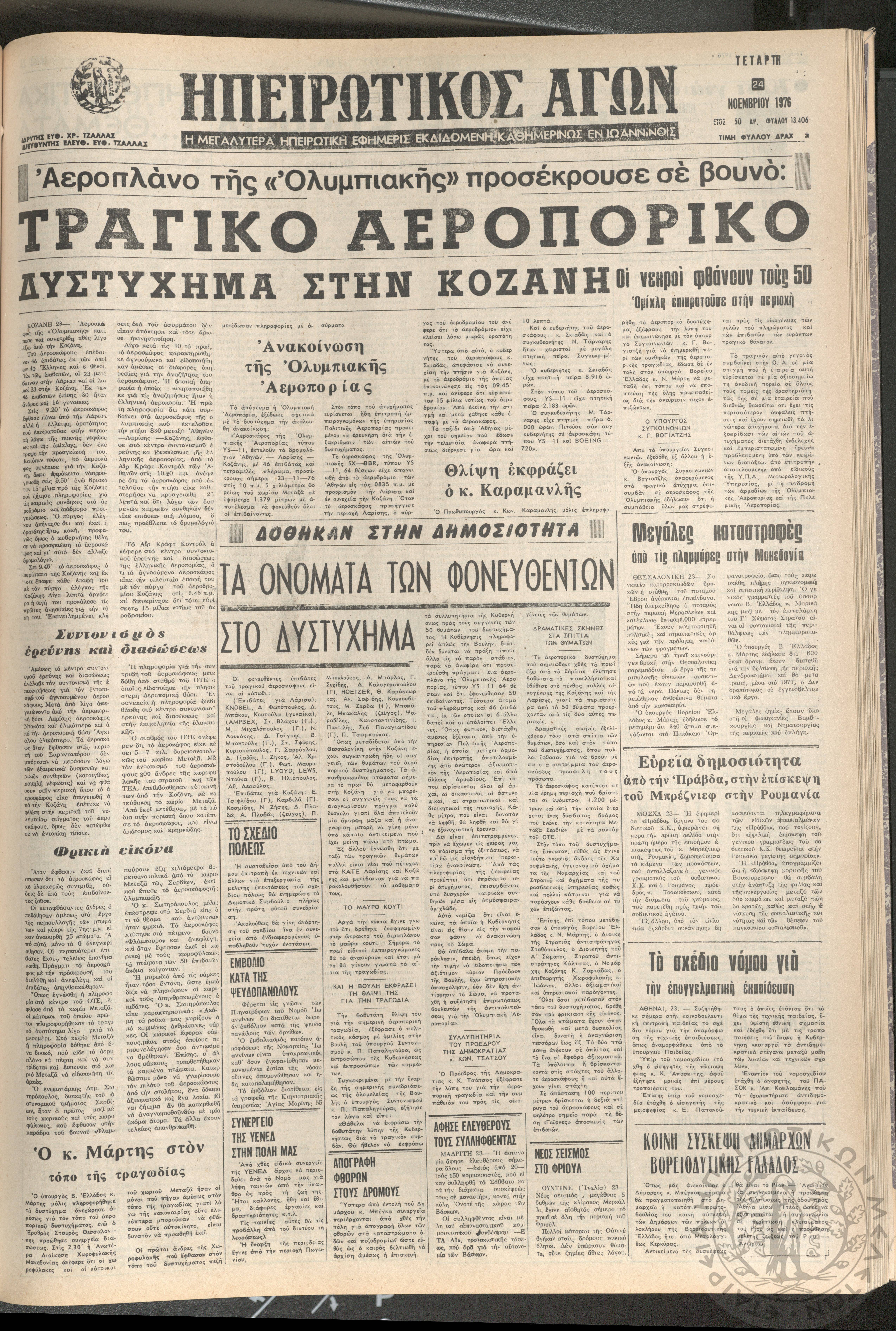 Ηπειρωτικός Αγών: η μεγαλυτέρα ηπειρωτική εφημερίς εκδιδόμενη καθημερινώς εν Ιωαννίνοις 1976 (φ. 13406)Έτος 50, φ. 13406...