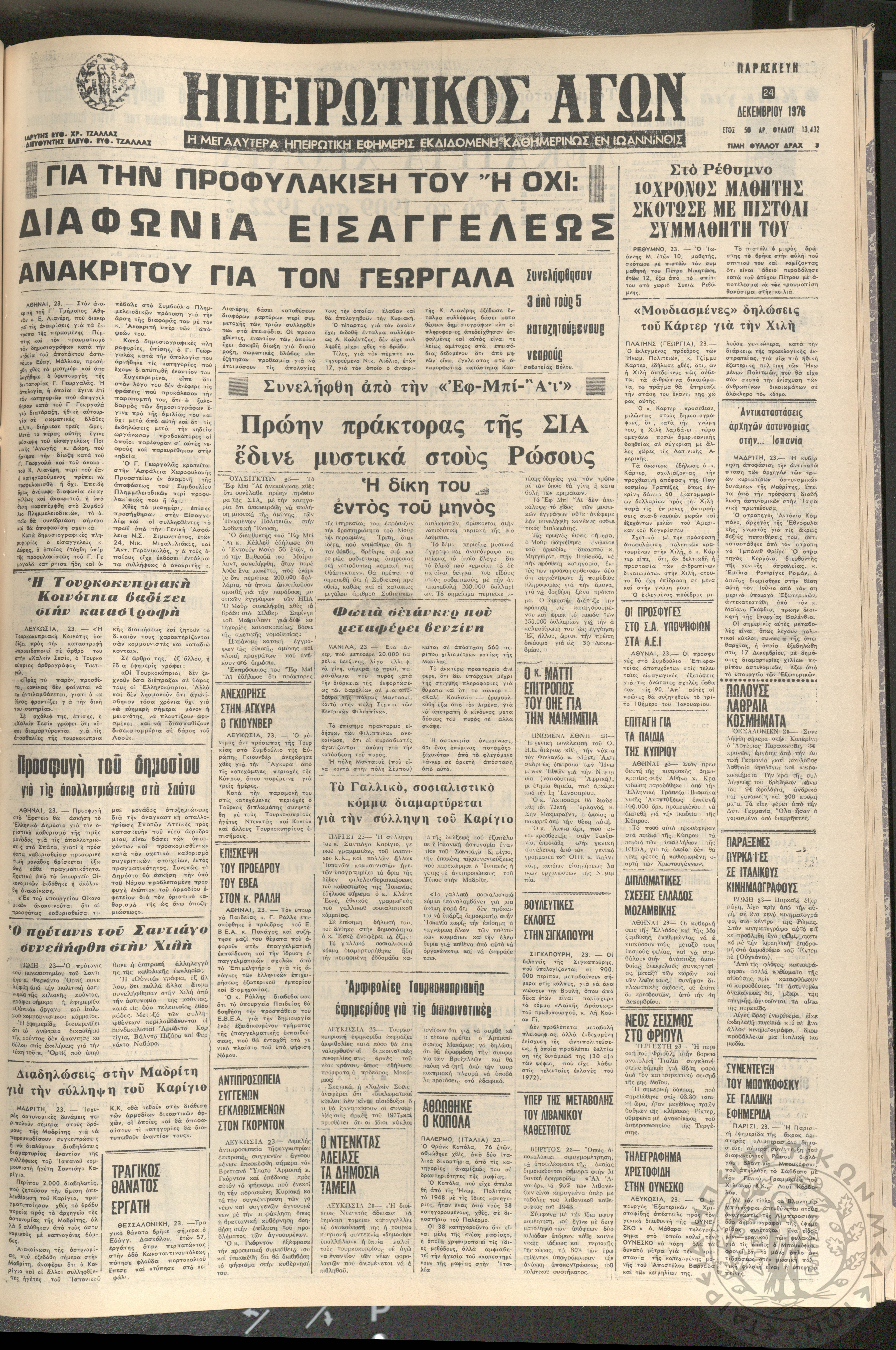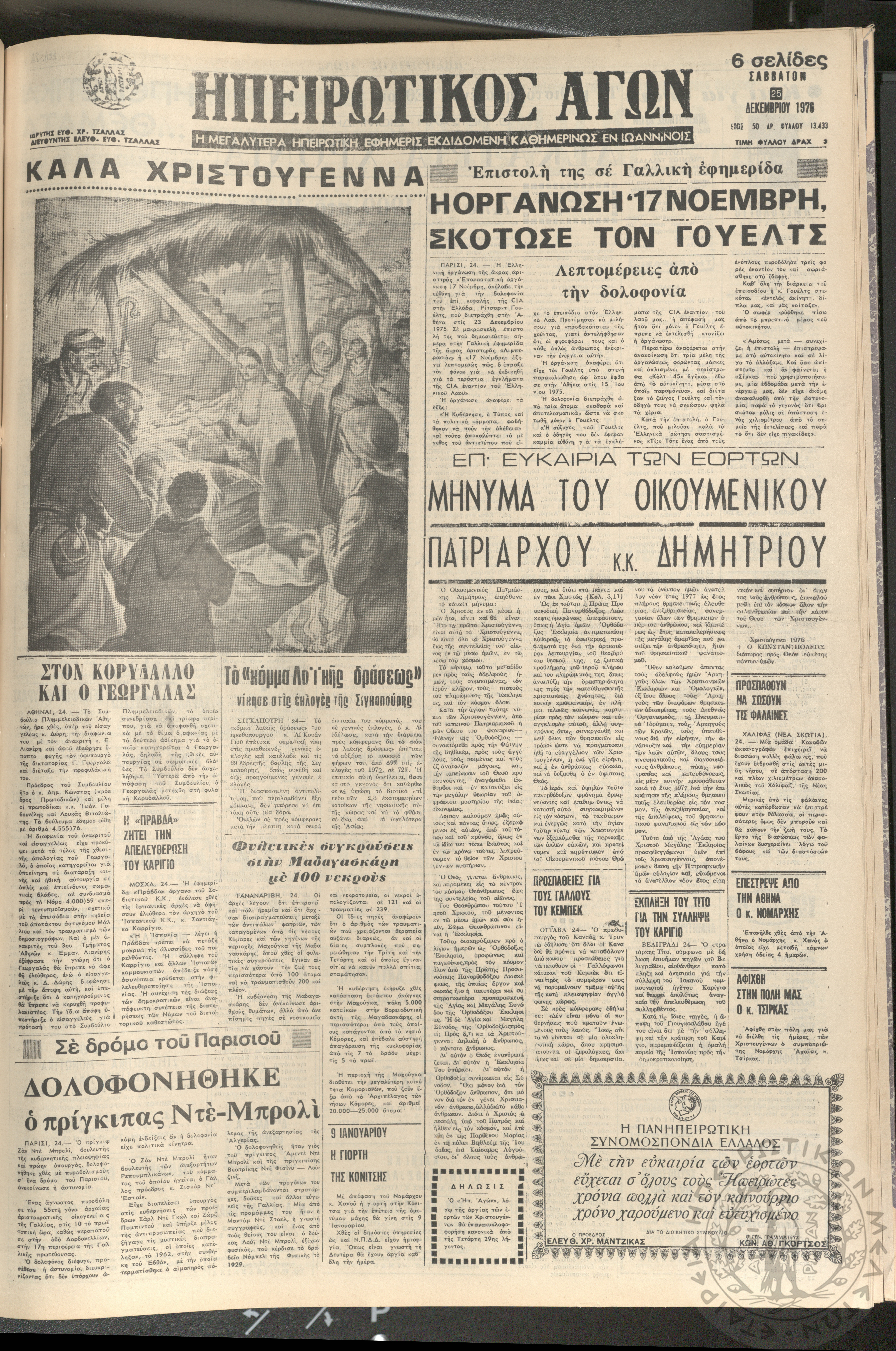 Ηπειρωτικός Αγών: η μεγαλυτέρα ηπειρωτική εφημερίς εκδιδόμενη καθημερινώς εν Ιωαννίνοις 1976 (φ. 13433)Έτος 50, φ. 13433...