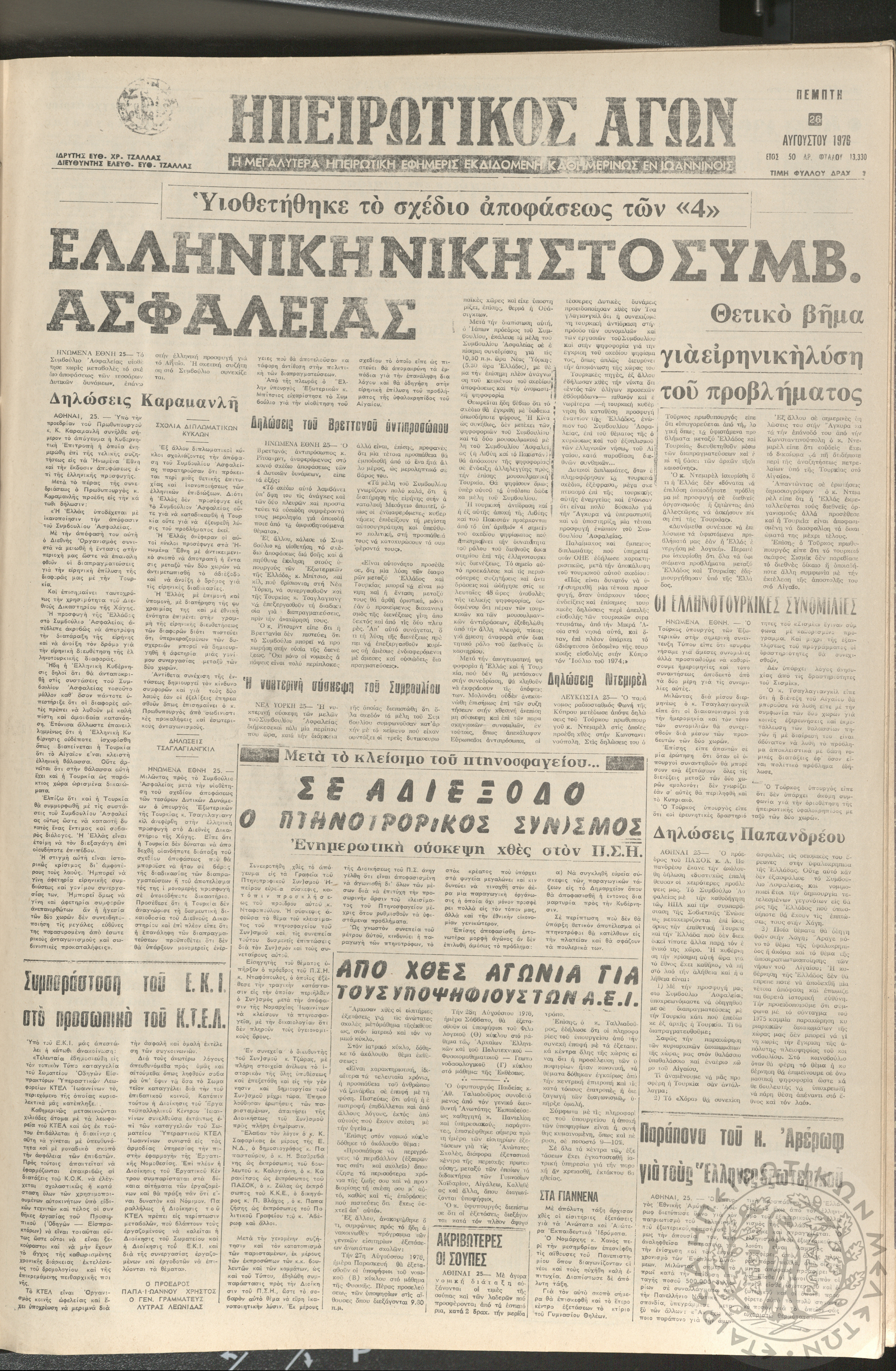 Ηπειρωτικός Αγών: η μεγαλυτέρα ηπειρωτική εφημερίς εκδιδόμενη καθημερινώς εν Ιωαννίνοις 1976 (φ. 13330)Έτος 50, φ. 13330...