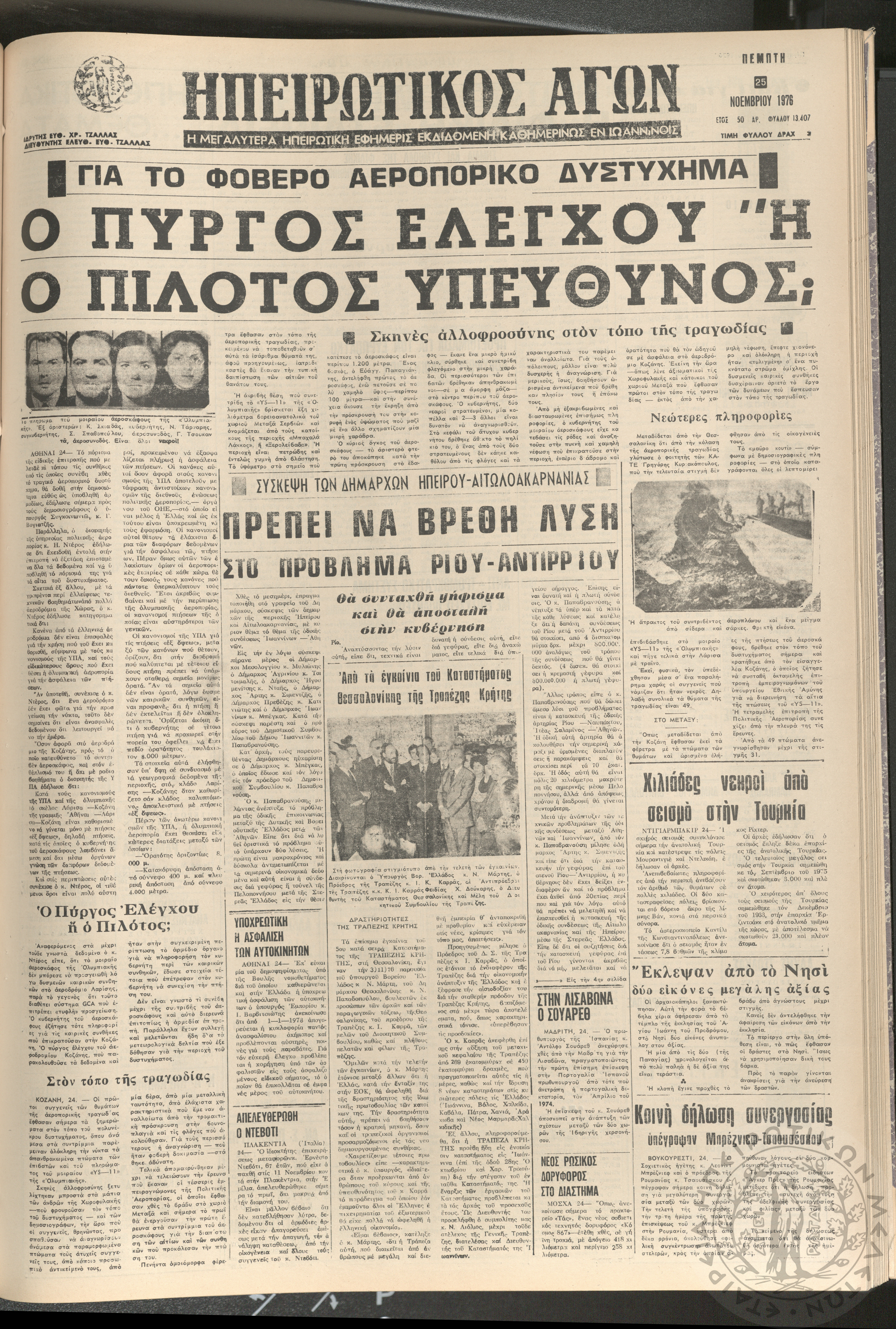 Ηπειρωτικός Αγών: η μεγαλυτέρα ηπειρωτική εφημερίς εκδιδόμενη καθημερινώς εν Ιωαννίνοις 1976 (φ. 13407)Έτος 50, φ. 13407...