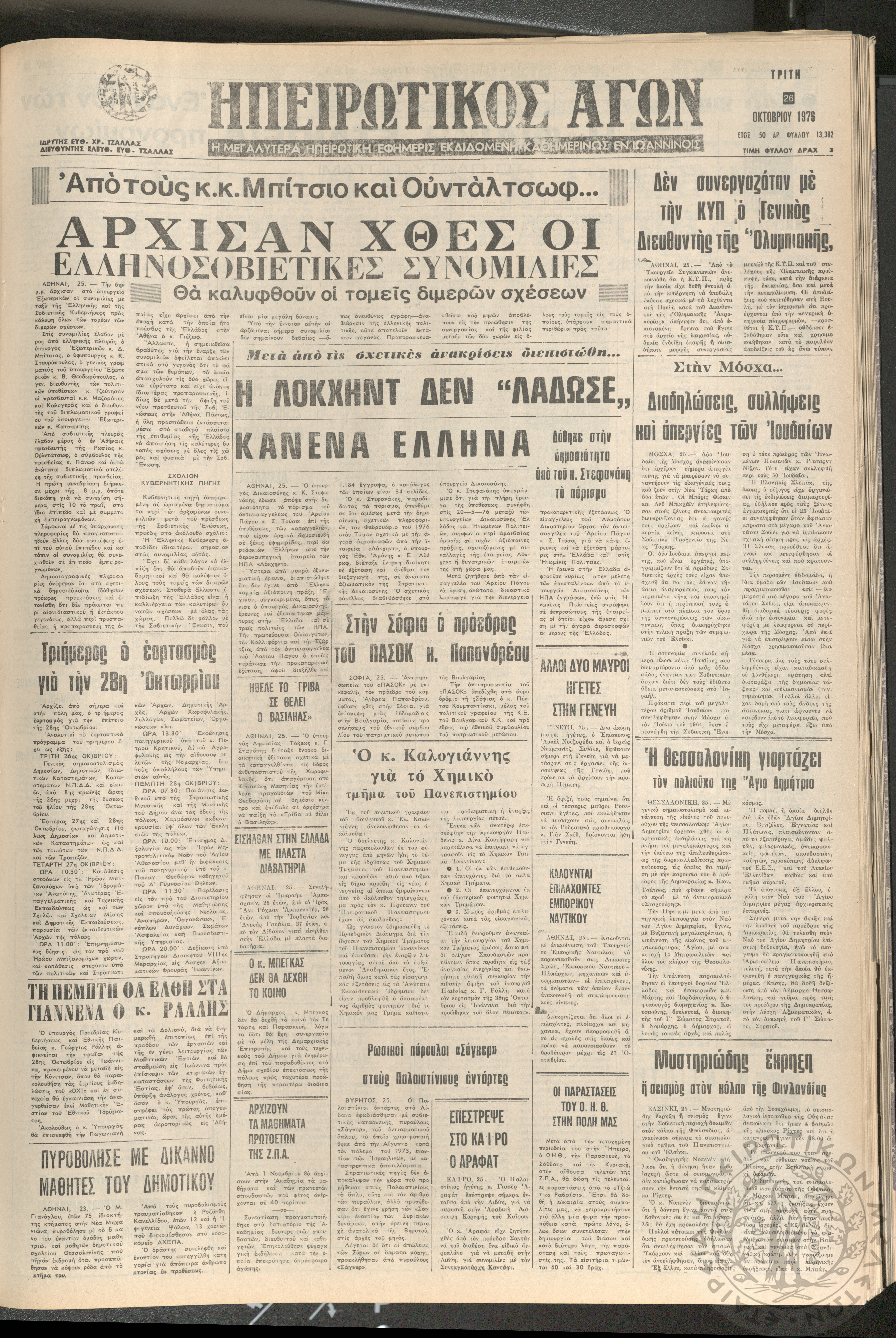 Ηπειρωτικός Αγών: η μεγαλυτέρα ηπειρωτική εφημερίς εκδιδόμενη καθημερινώς εν Ιωαννίνοις 1976 (φ. 13382)Έτος 50, φ. 13382...
