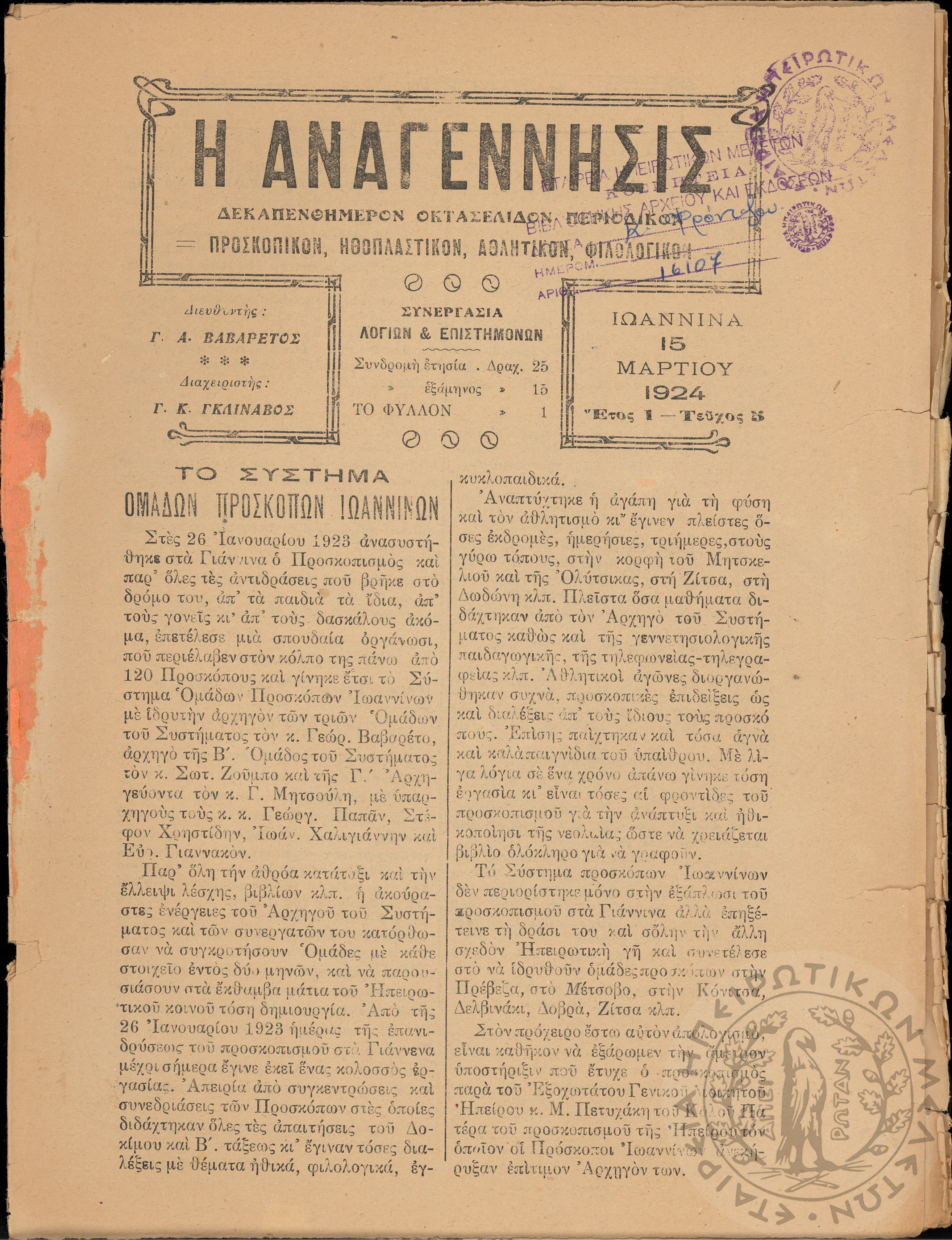 Η Αναγέννησις: δεκαπενθήμερον οκτασέλιδον περιοδικόν προσκοπικόν, ηθοπλαστικόν, αθλητικόν, φιλολογικόν (τεύχ. 5)Έτος 1, τεύχ. 5...