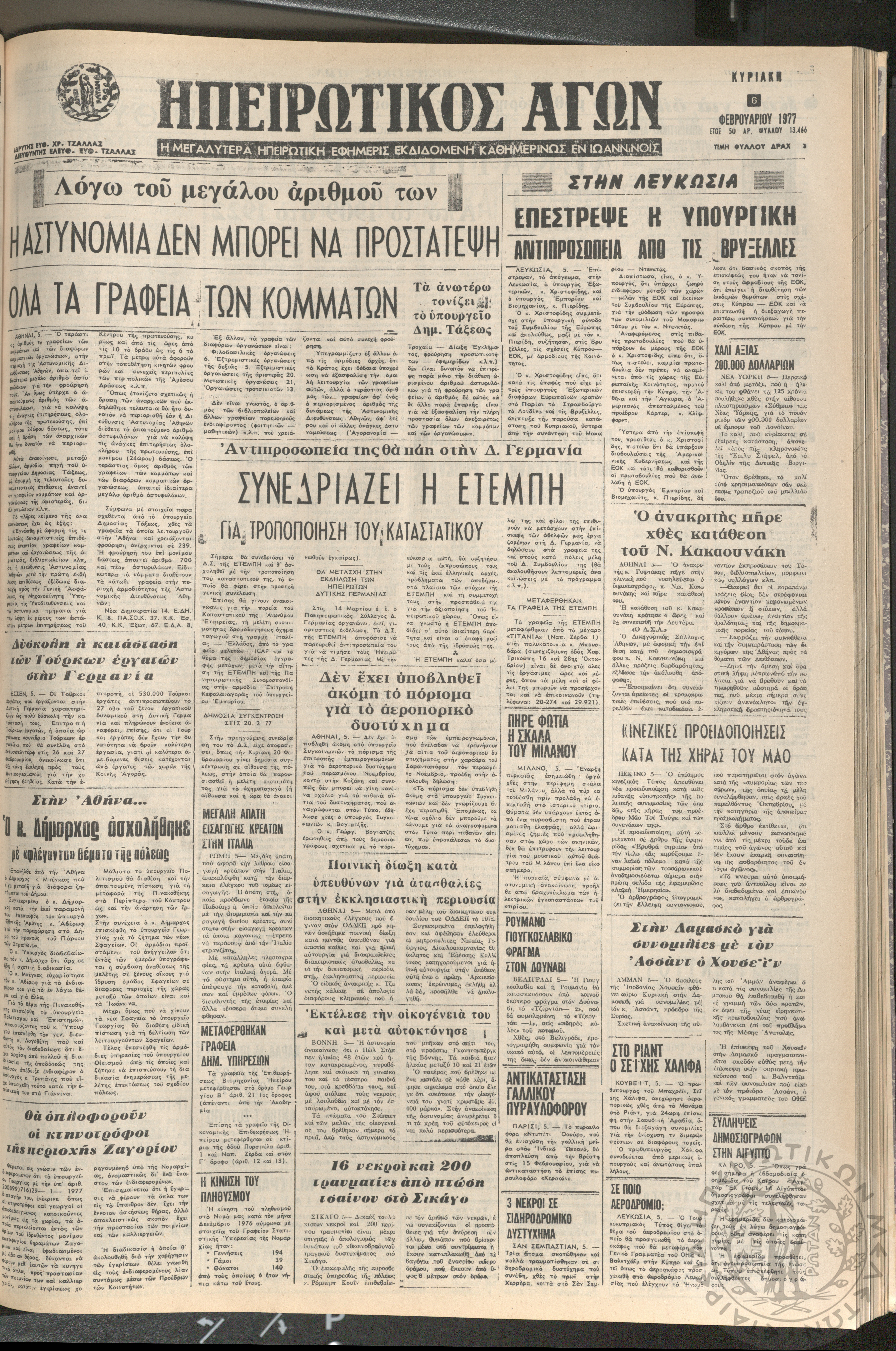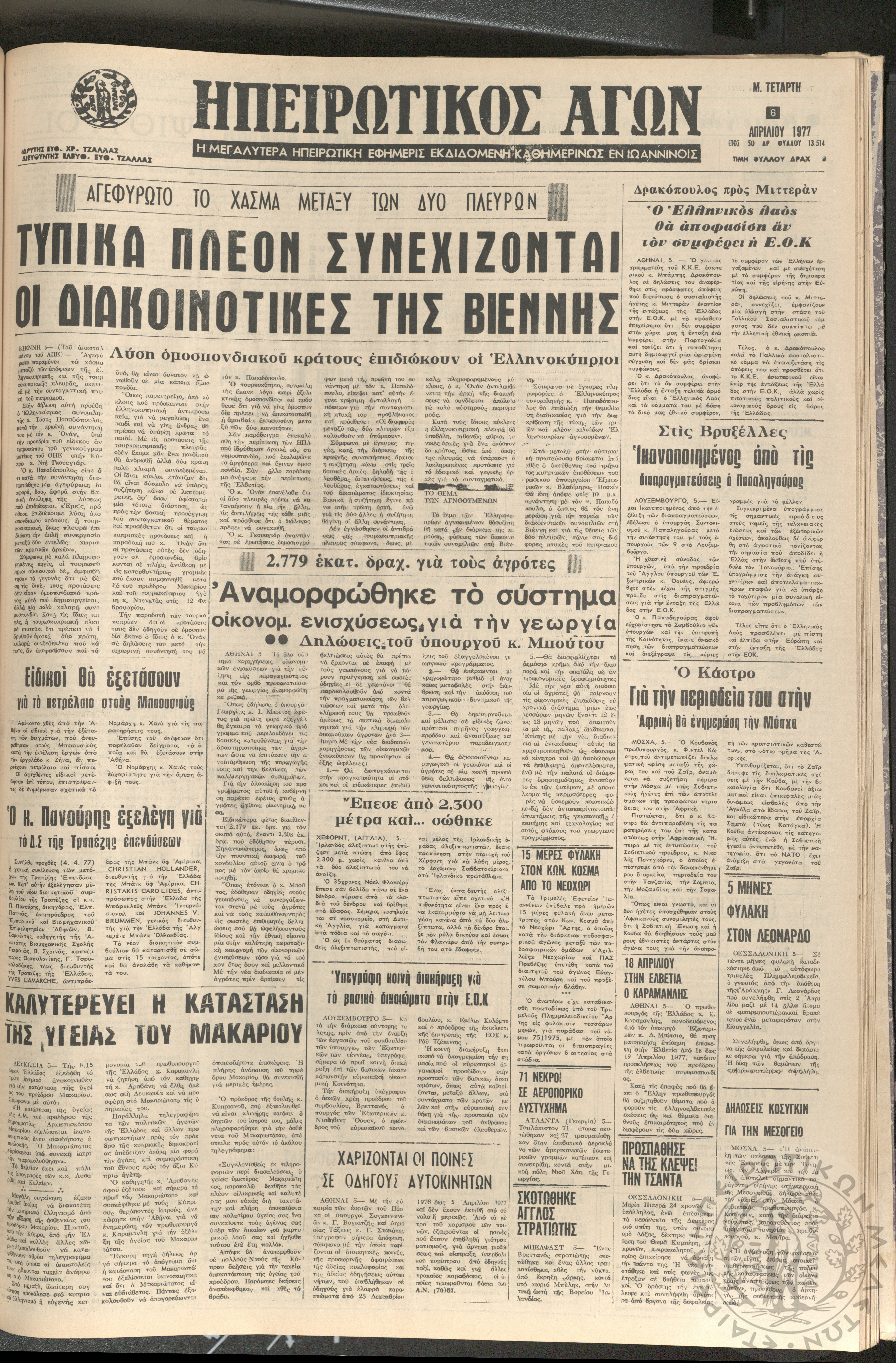 Ηπειρωτικός Αγών: η μεγαλυτέρα ηπειρωτική εφημερίς εκδιδόμενη καθημερινώς εν Ιωαννίνοις 1977 (φ. 13514)Έτος 50, φ. 13514...