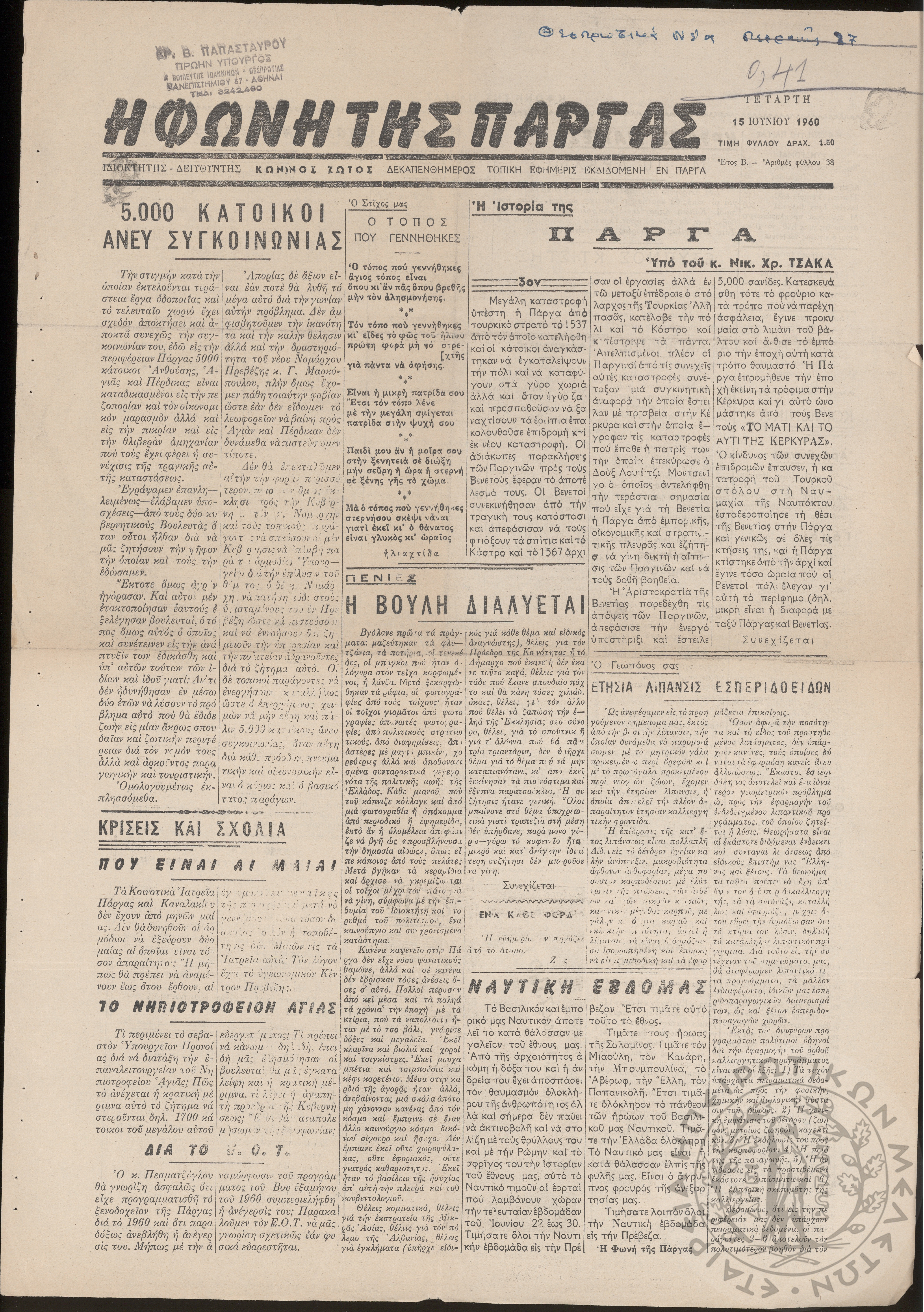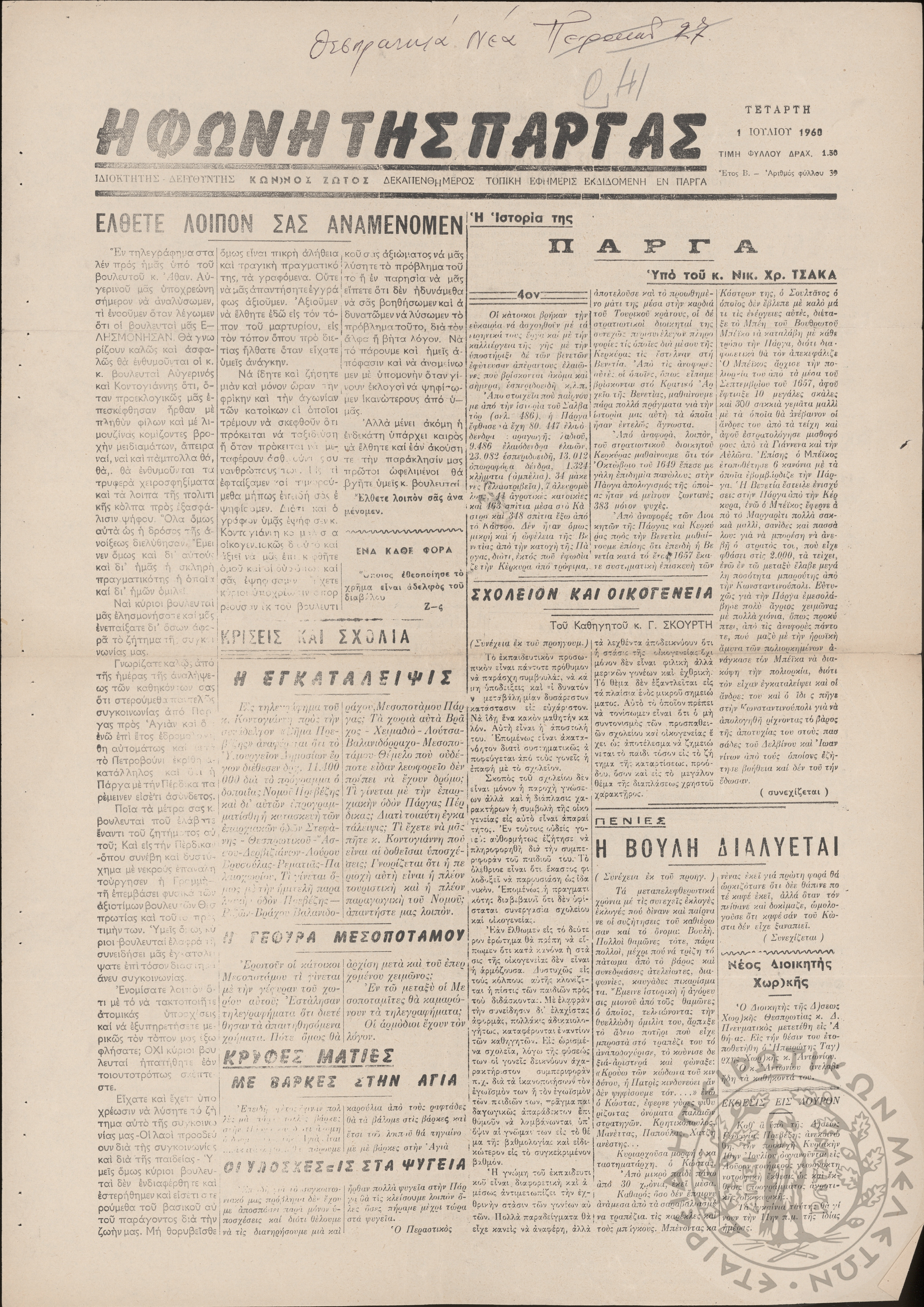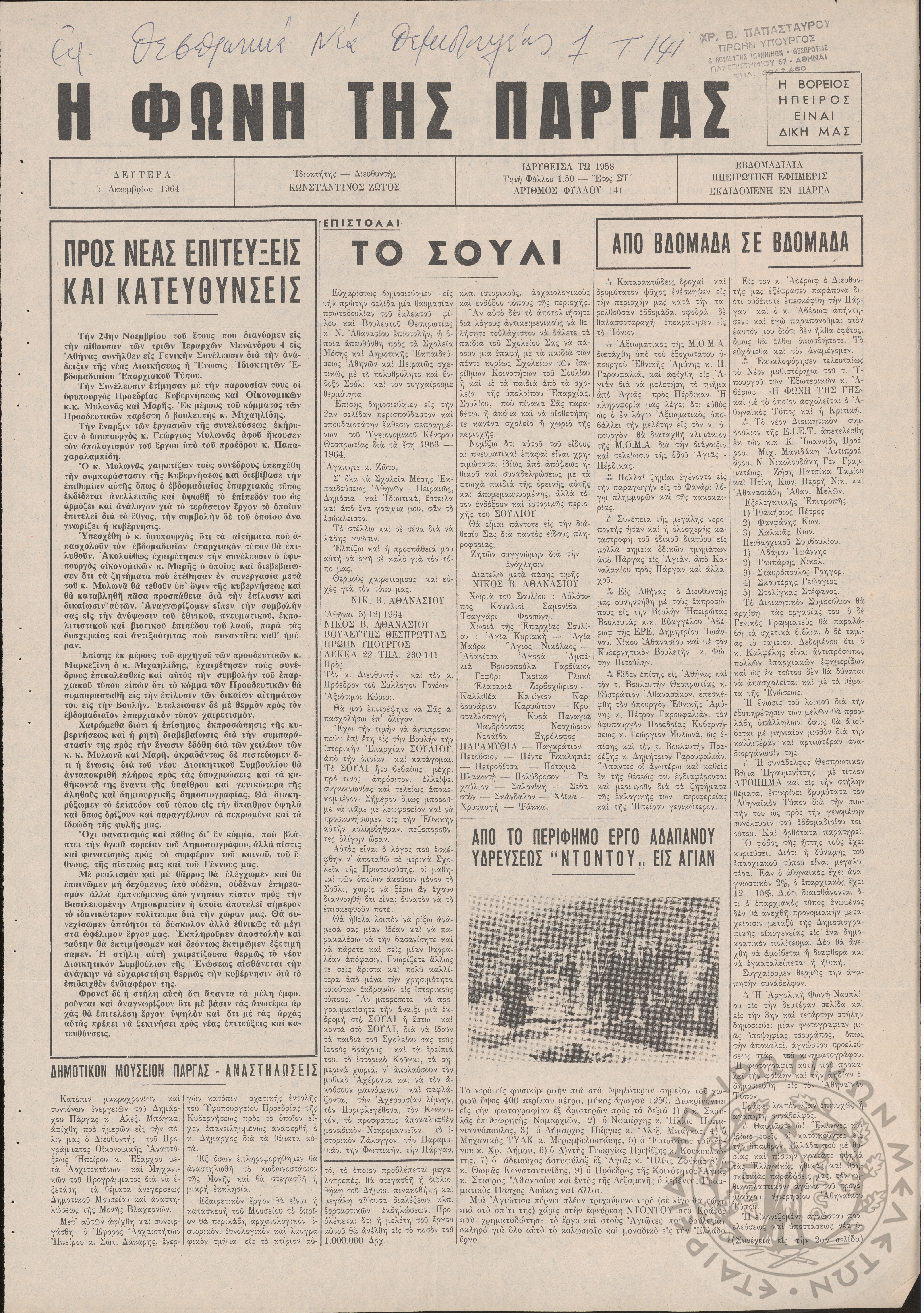 Η Φωνή της Πάργας: εβδομαδιαία Ηπειρωτική εφημερίς εκδιδομένη εν Πάργα, 1964, φ. 141Έτος ΣΤ΄, φ. 141...