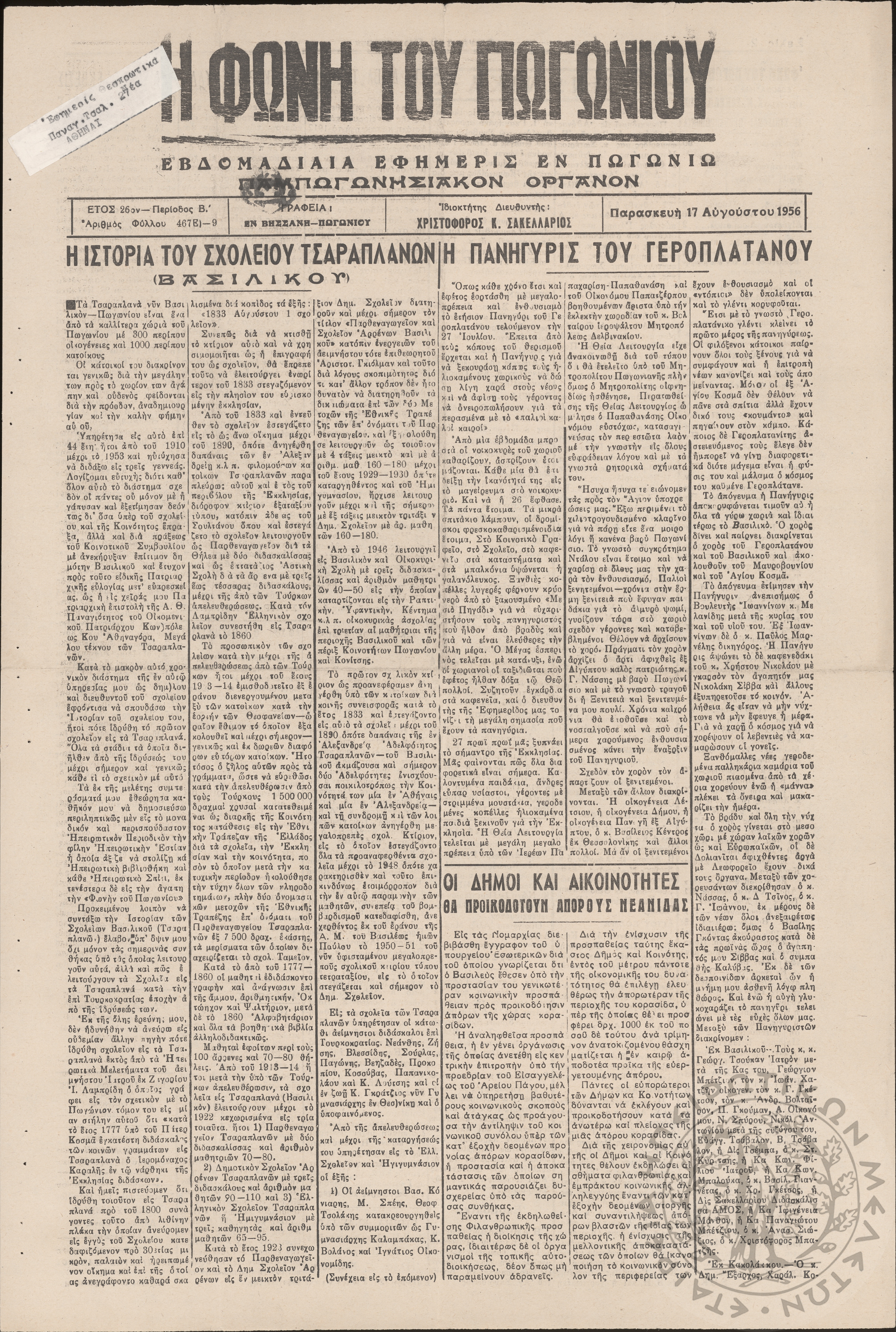 Η φωνή του Πωγωνίου: εβδομαδιαία εφημερίς εν Πωγωνίω (Παμπωγωνησιακόν όργανον), 1956, φ. 467Έτος 26, φ. 467...