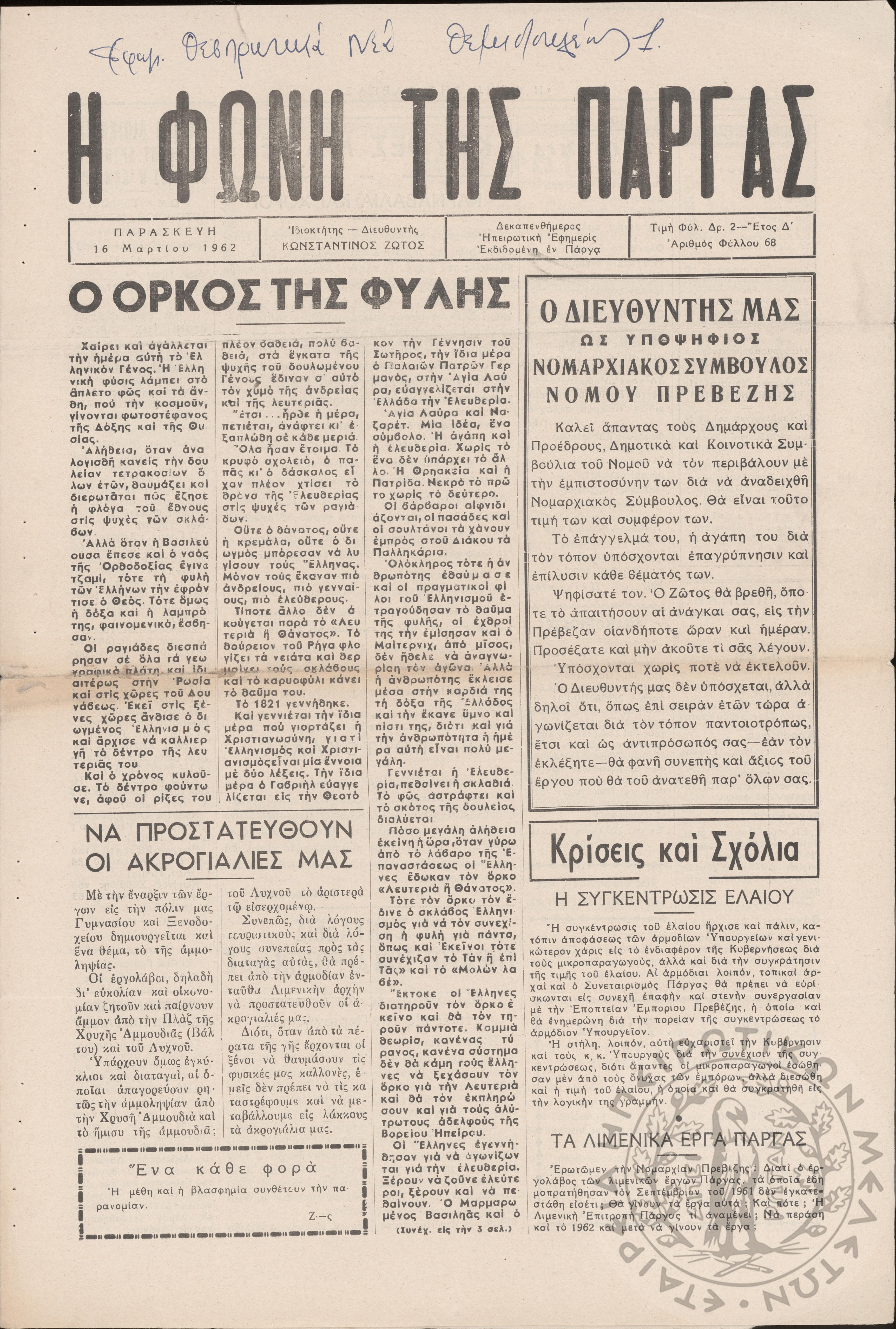 Η Φωνή της Πάργας: δεκαπενθήμερος Ηπειρωτική εφημερίς εκδιδομένη εν Πάργα, 1962, φ. 68Έτος Δ΄, φ. 68...
