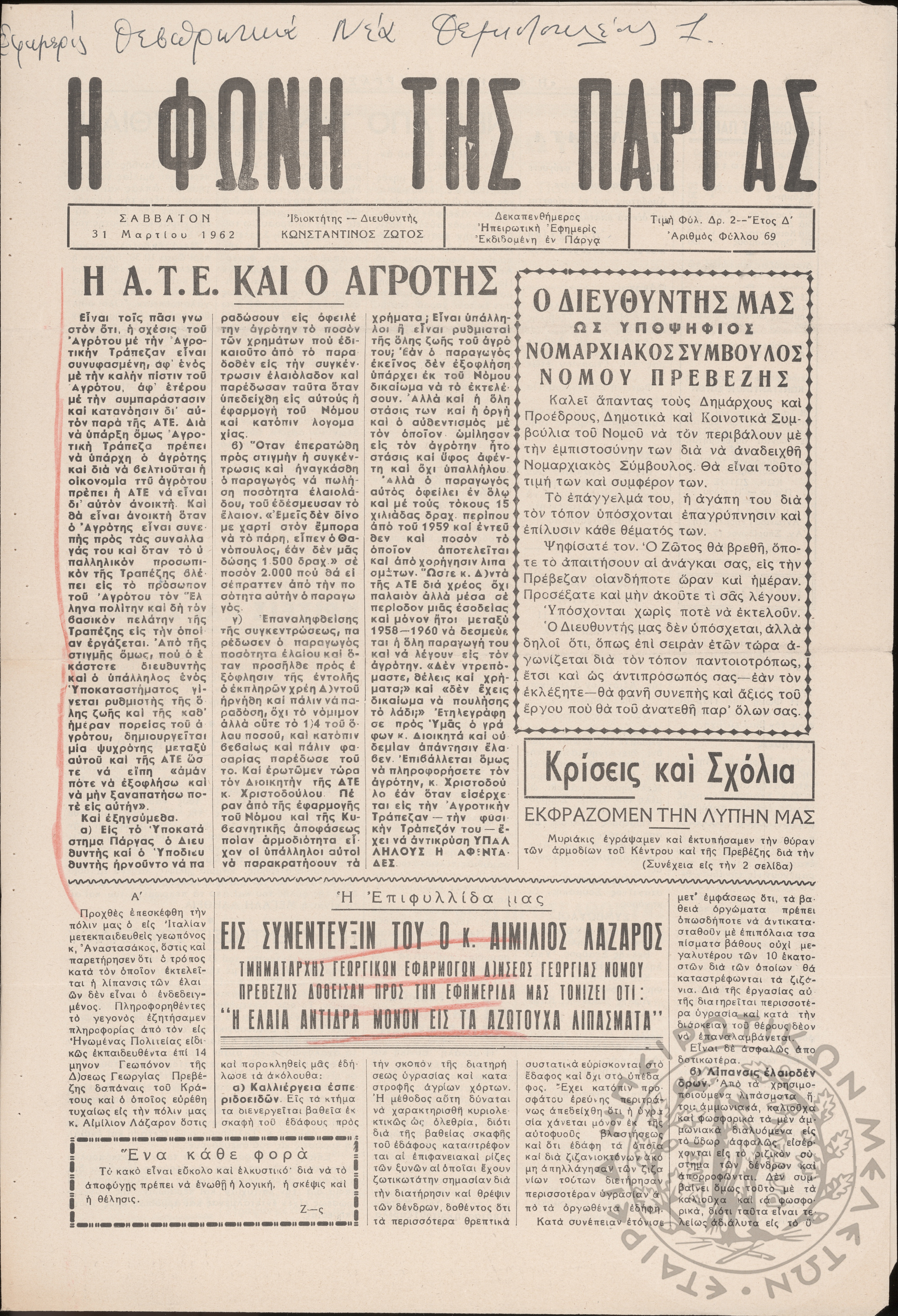 Η Φωνή της Πάργας: δεκαπενθήμερος Ηπειρωτική εφημερίς εκδιδομένη εν Πάργα, 1962, φ. 69Έτος Δ΄, φ. 69...