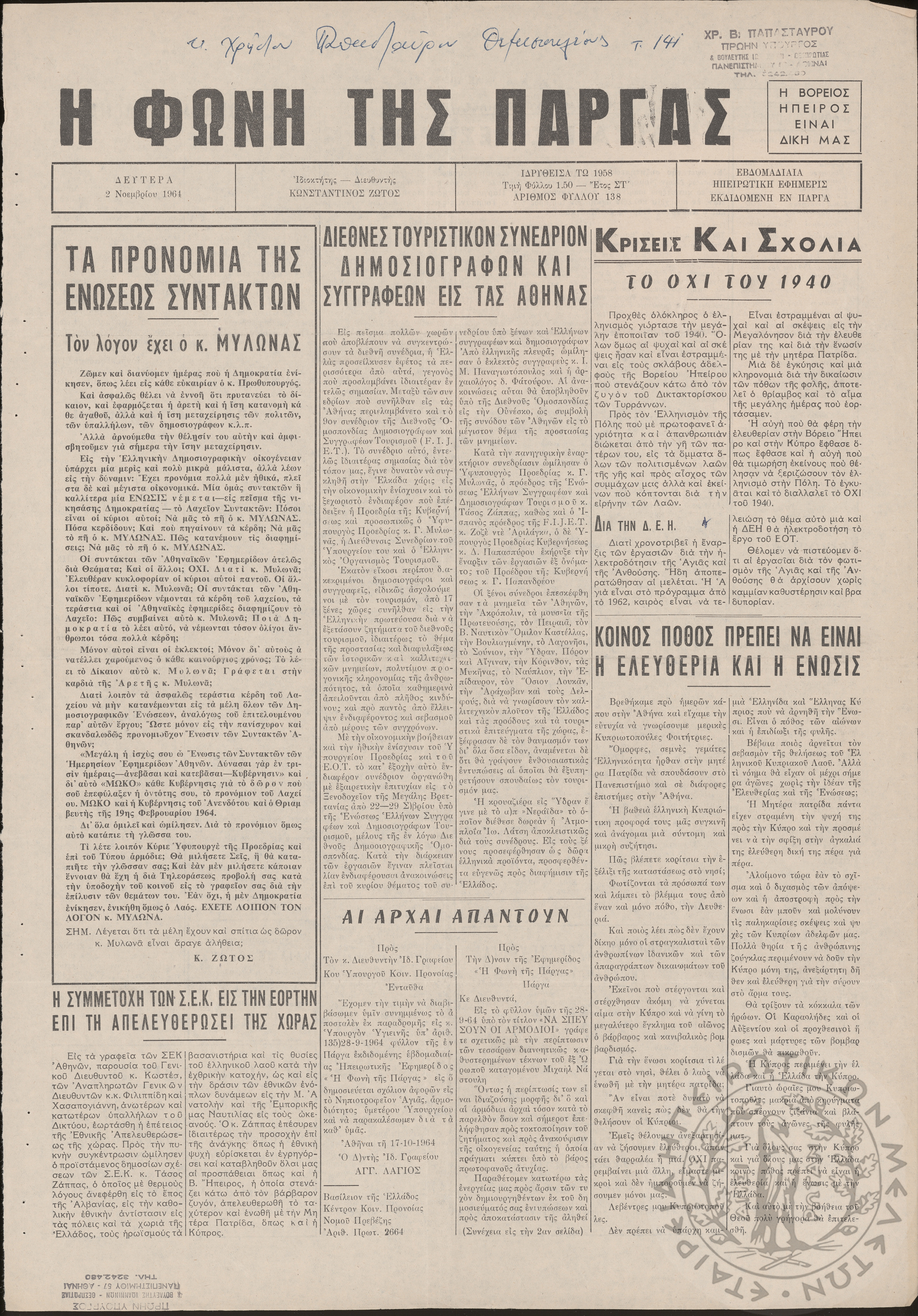 Η Φωνή της Πάργας: εβδομαδιαία Ηπειρωτική εφημερίς εκδιδομένη εν Πάργα, 1964, φ. 138Έτος ΣΤ΄, φ. 138...