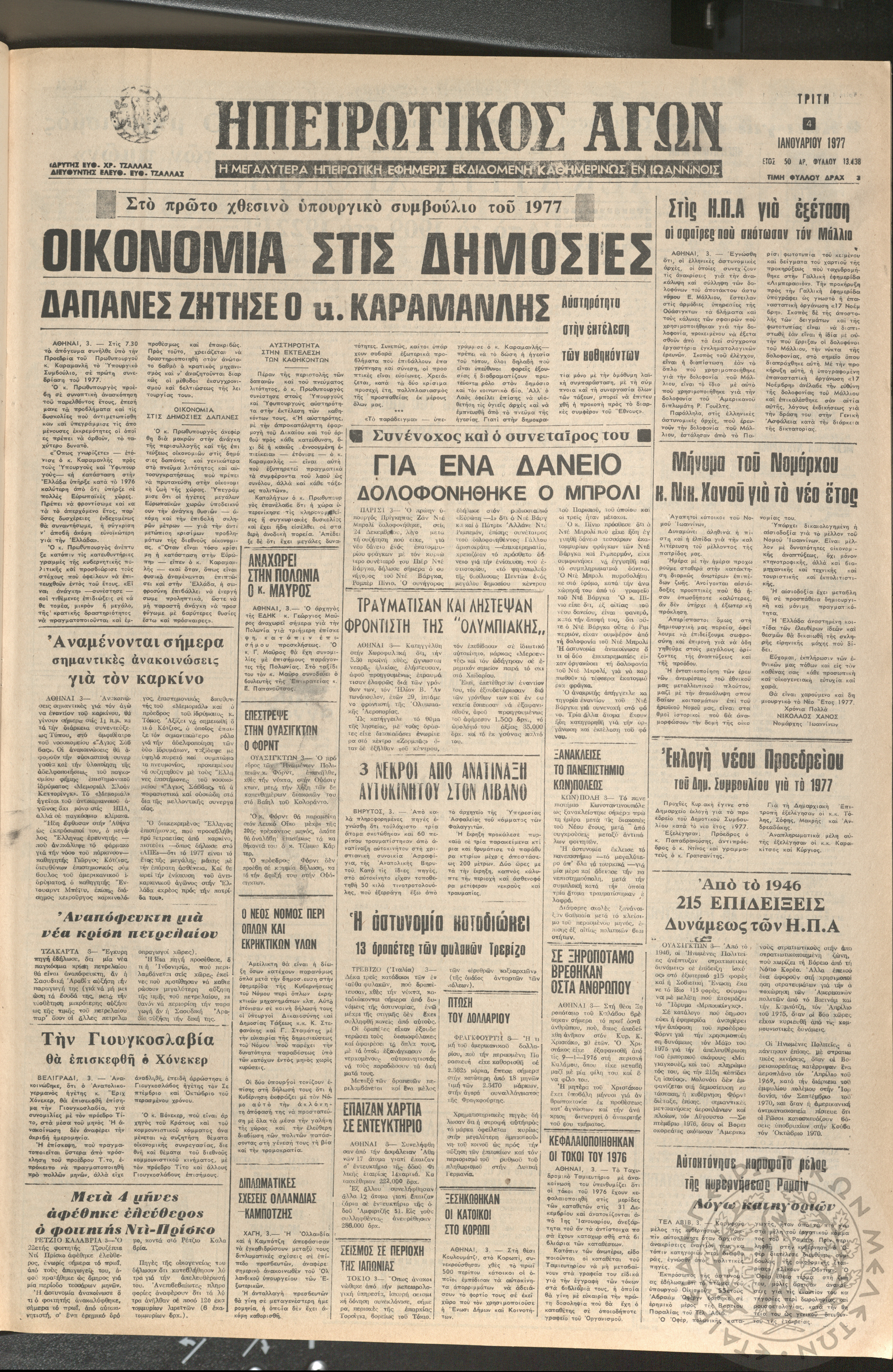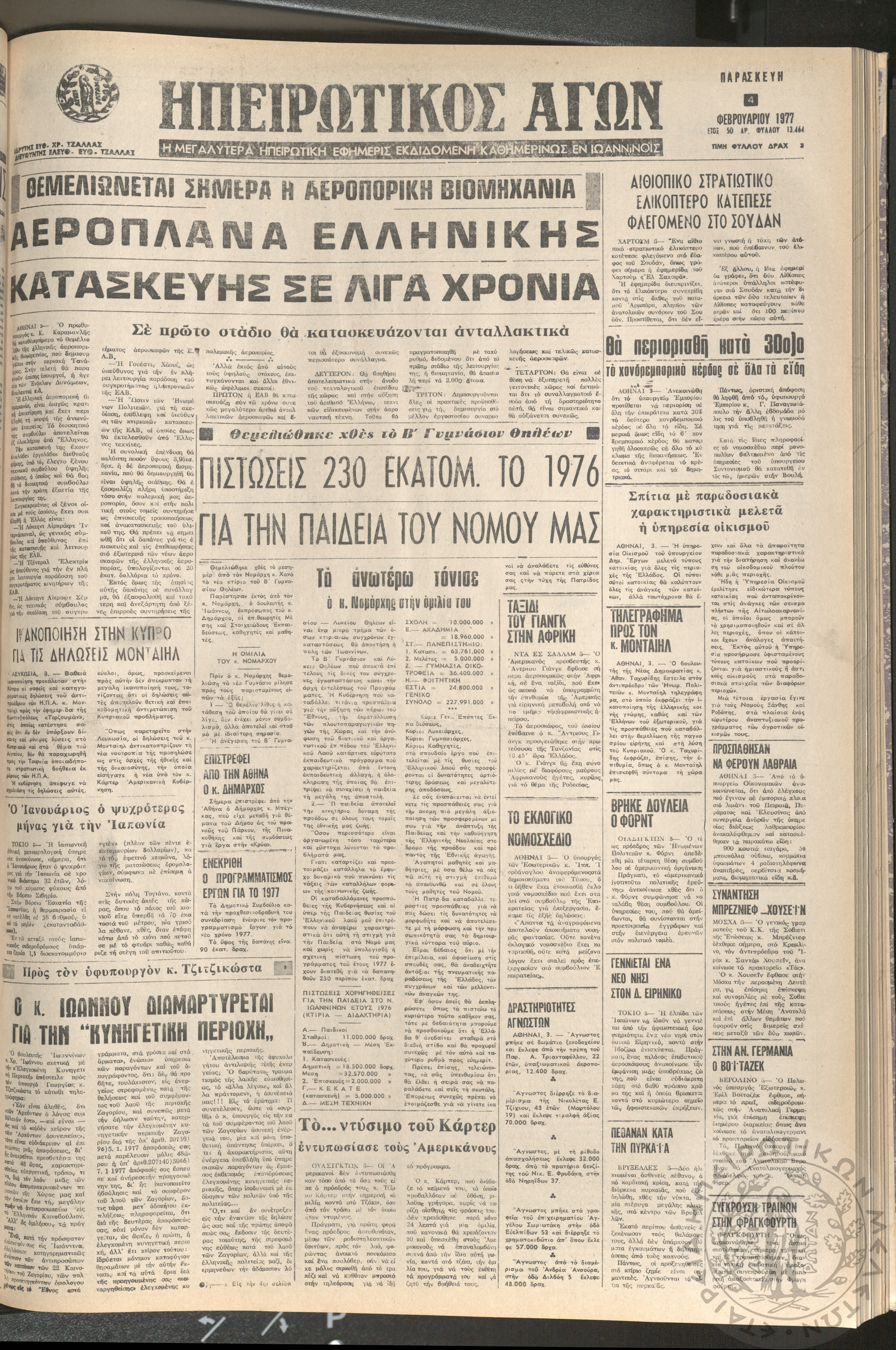 Ηπειρωτικός Αγών: η μεγαλυτέρα ηπειρωτική εφημερίς εκδιδόμενη καθημερινώς εν Ιωαννίνοις 1977 (φ. 13438)Έτος 50, φ. 13438...