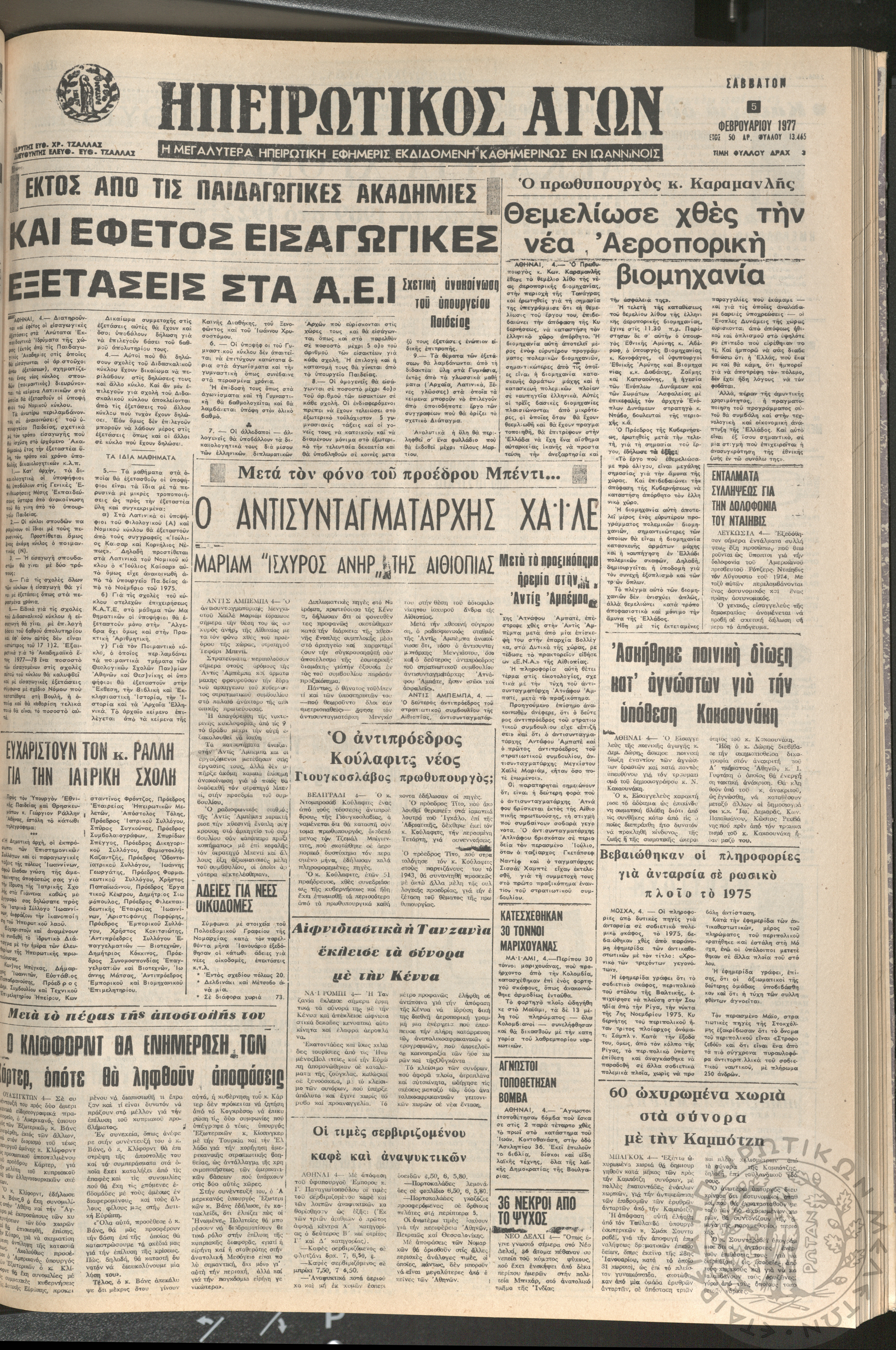 Ηπειρωτικός Αγών: η μεγαλυτέρα ηπειρωτική εφημερίς εκδιδόμενη καθημερινώς εν Ιωαννίνοις 1977 (φ. 13465)Έτος 50, φ. 13465...