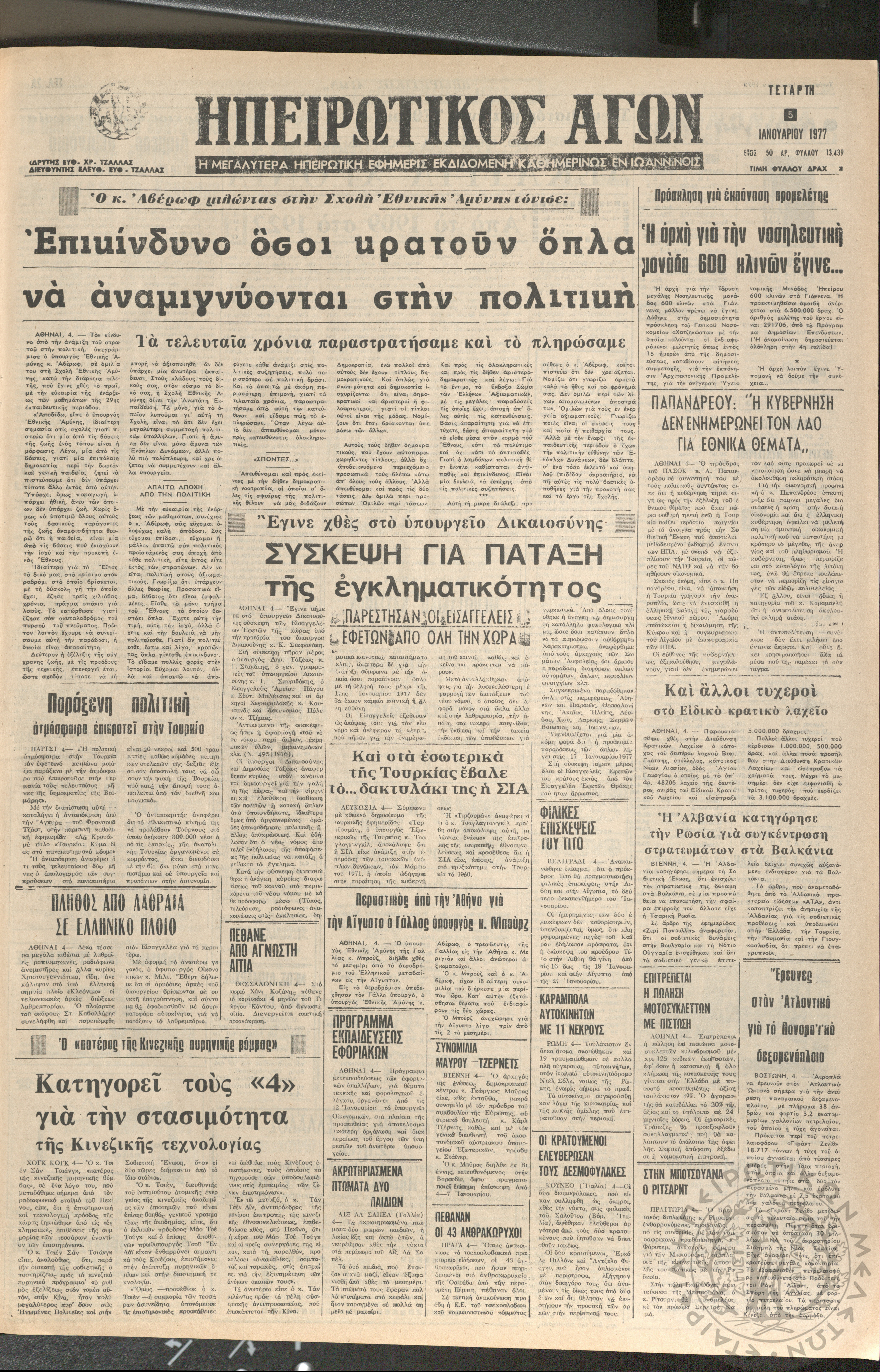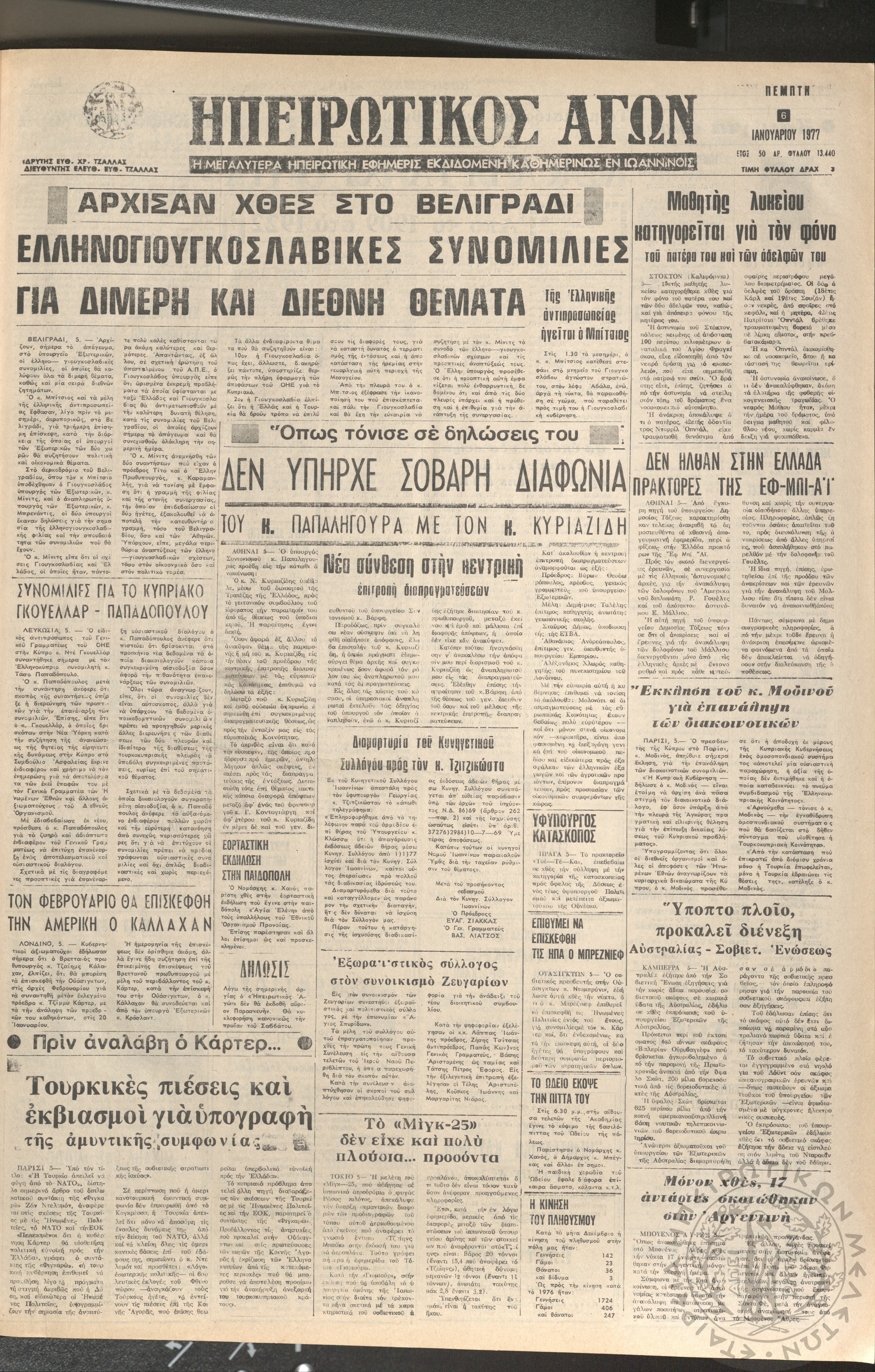 Ηπειρωτικός Αγών: η μεγαλυτέρα ηπειρωτική εφημερίς εκδιδόμενη καθημερινώς εν Ιωαννίνοις 1977 (φ. 13440)Έτος 50, φ. 13440...