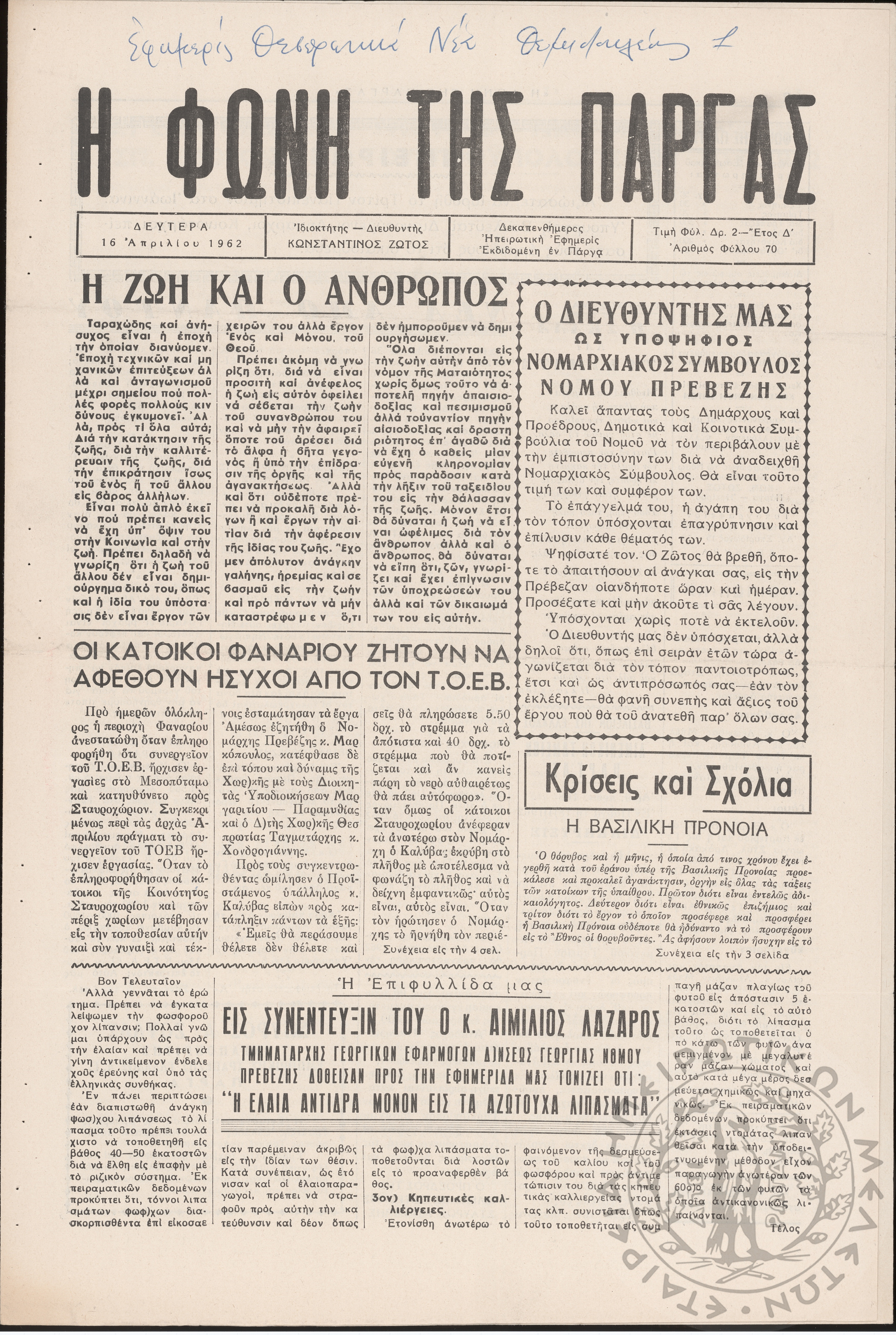 Η Φωνή της Πάργας: δεκαπενθήμερος Ηπειρωτική εφημερίς εκδιδομένη εν Πάργα, 1962, φ. 70Έτος Δ΄, φ. 70...