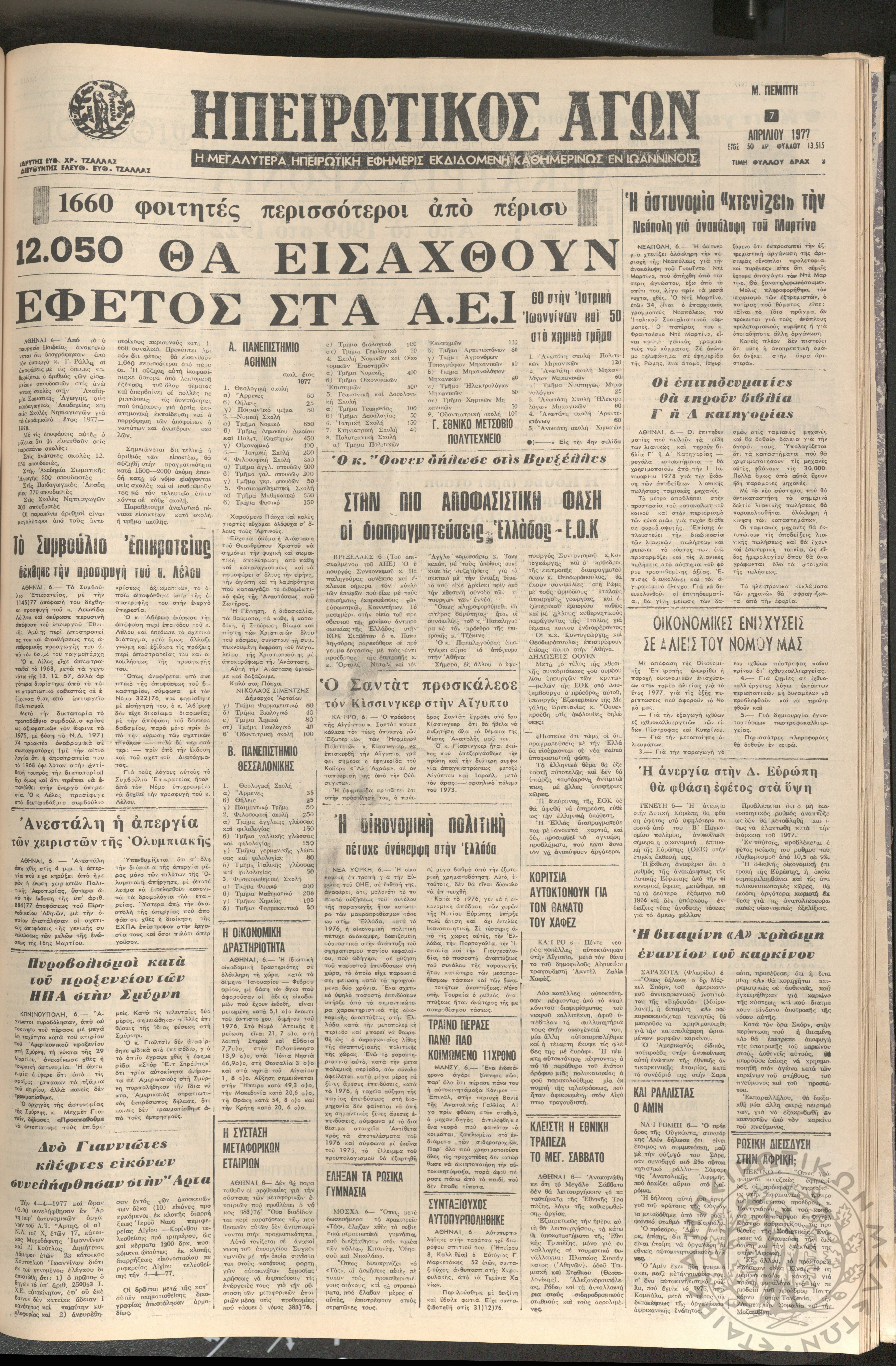 Ηπειρωτικός Αγών: η μεγαλυτέρα ηπειρωτική εφημερίς εκδιδόμενη καθημερινώς εν Ιωαννίνοις 1977 (φ. 13515)Έτος 50, φ. 13515...