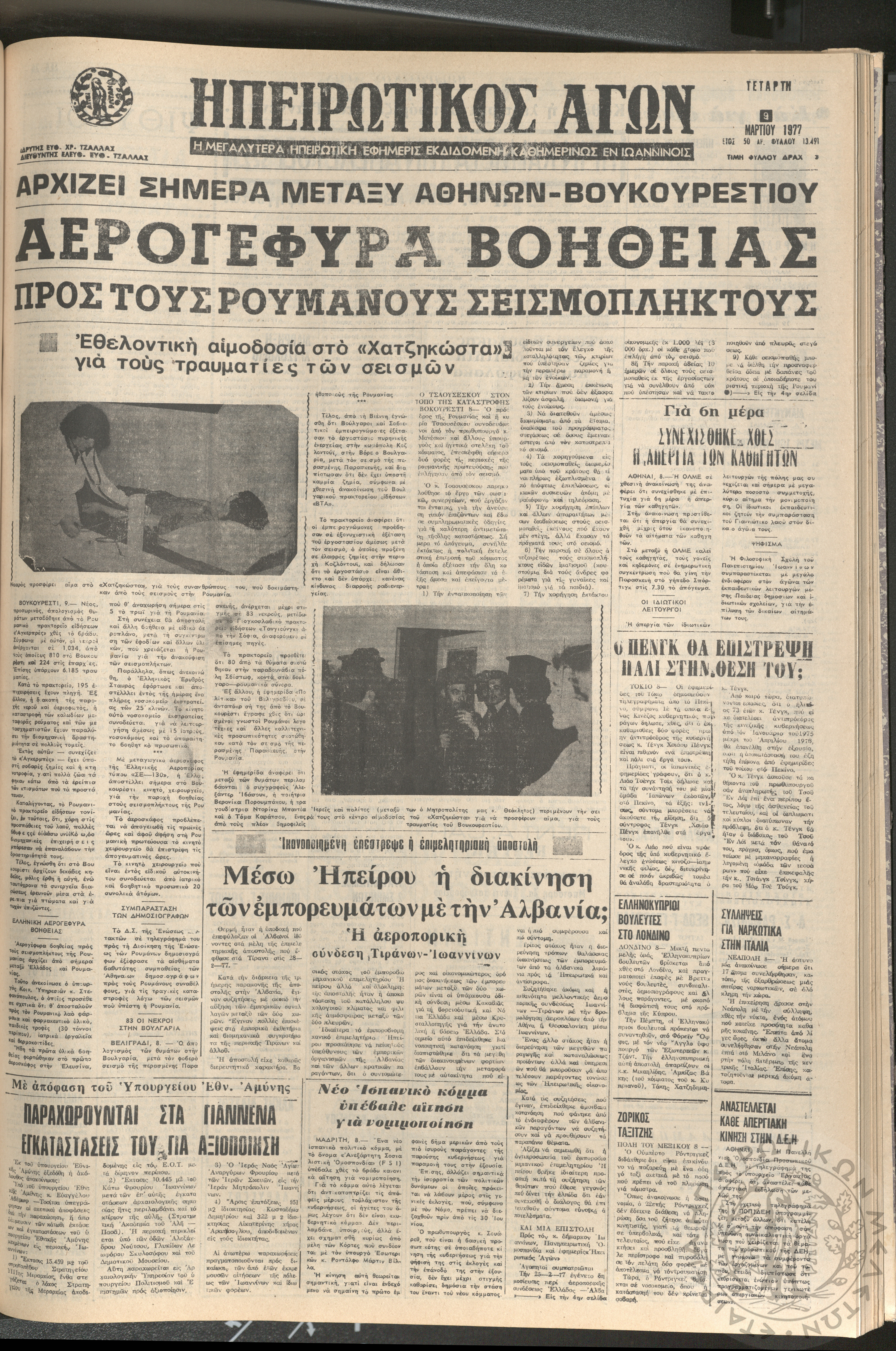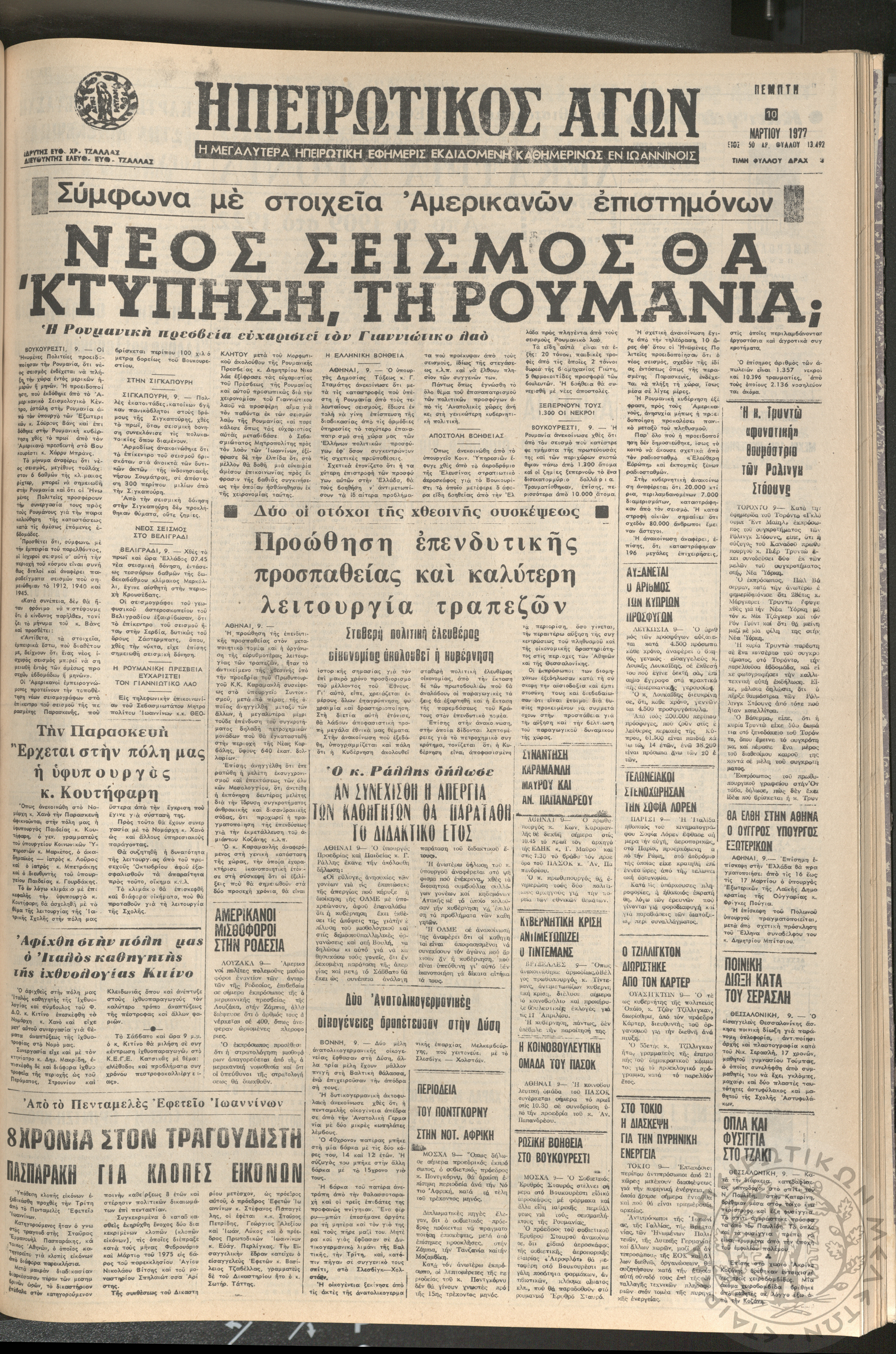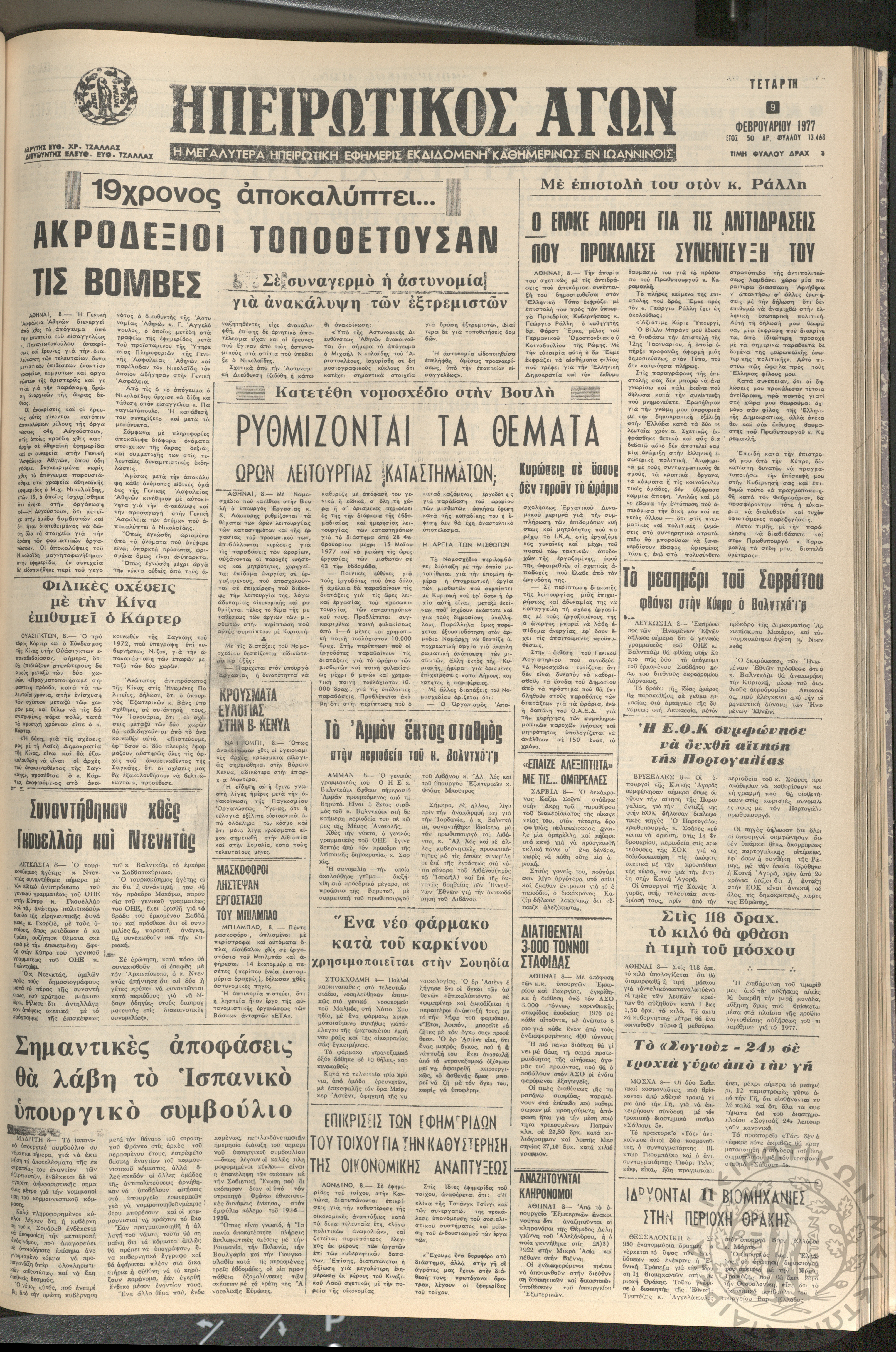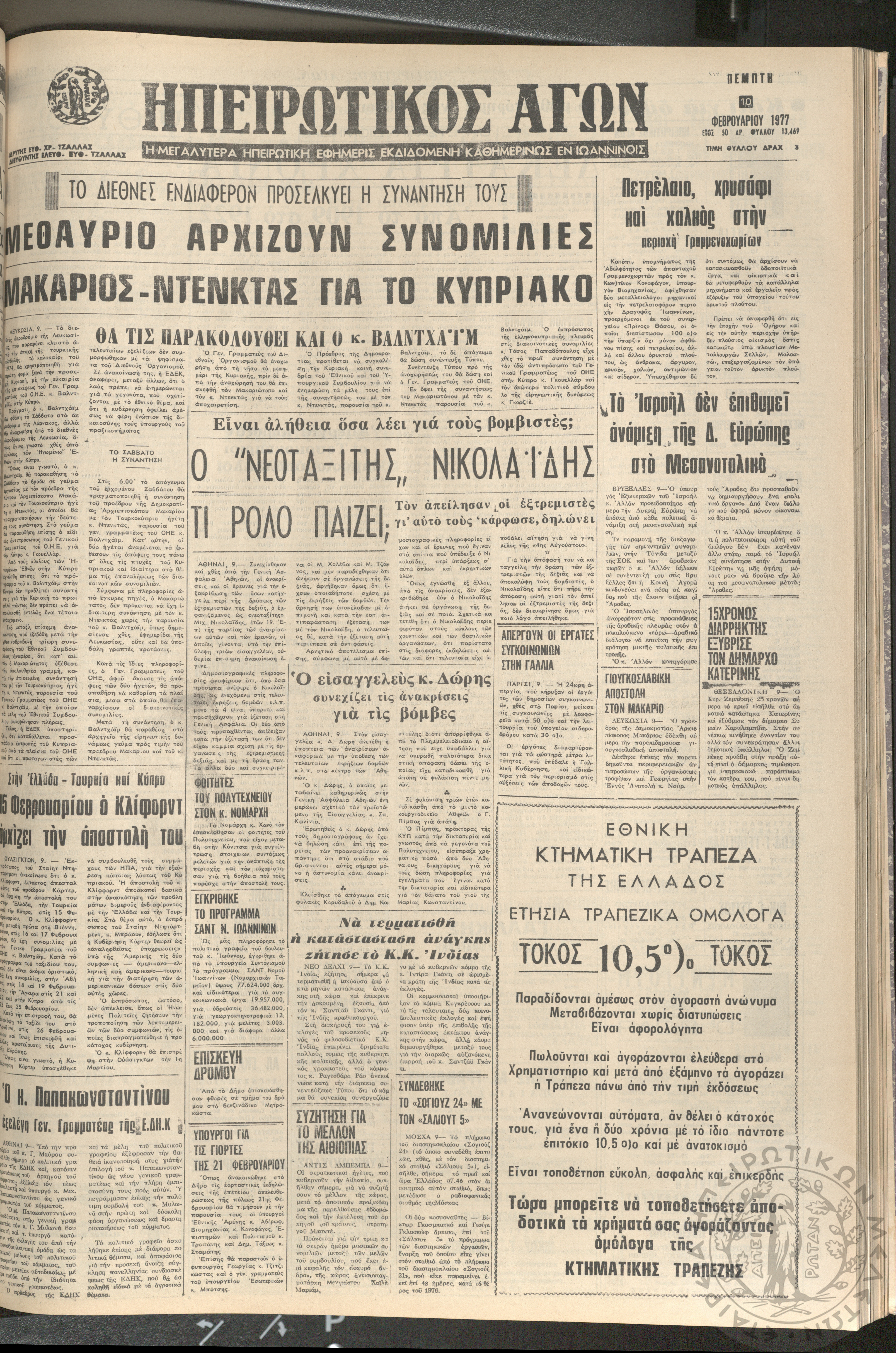 Ηπειρωτικός Αγών: η μεγαλυτέρα ηπειρωτική εφημερίς εκδιδόμενη καθημερινώς εν Ιωαννίνοις 1977 (φ. 13491)Έτος 50, φ. 13491...