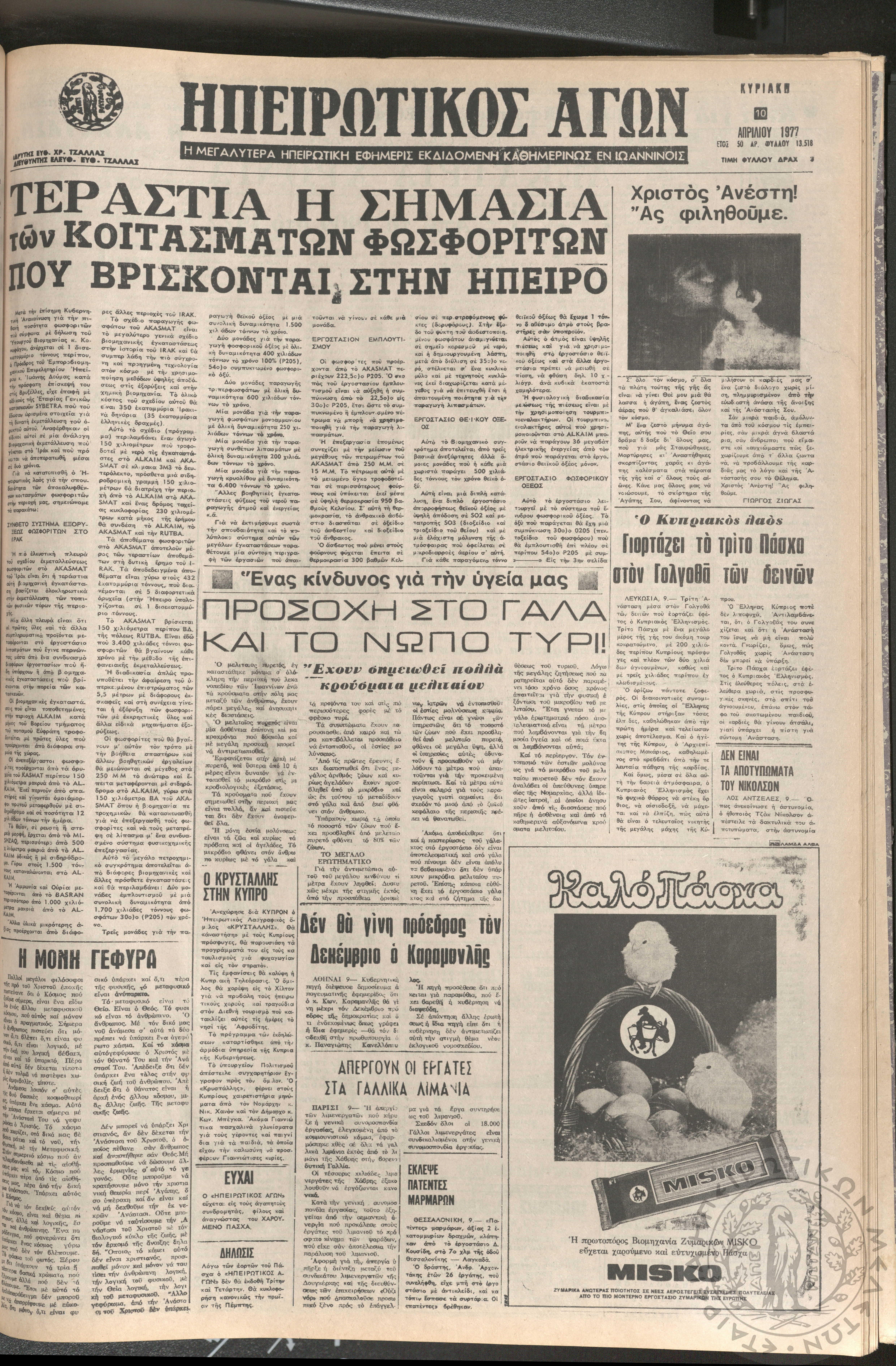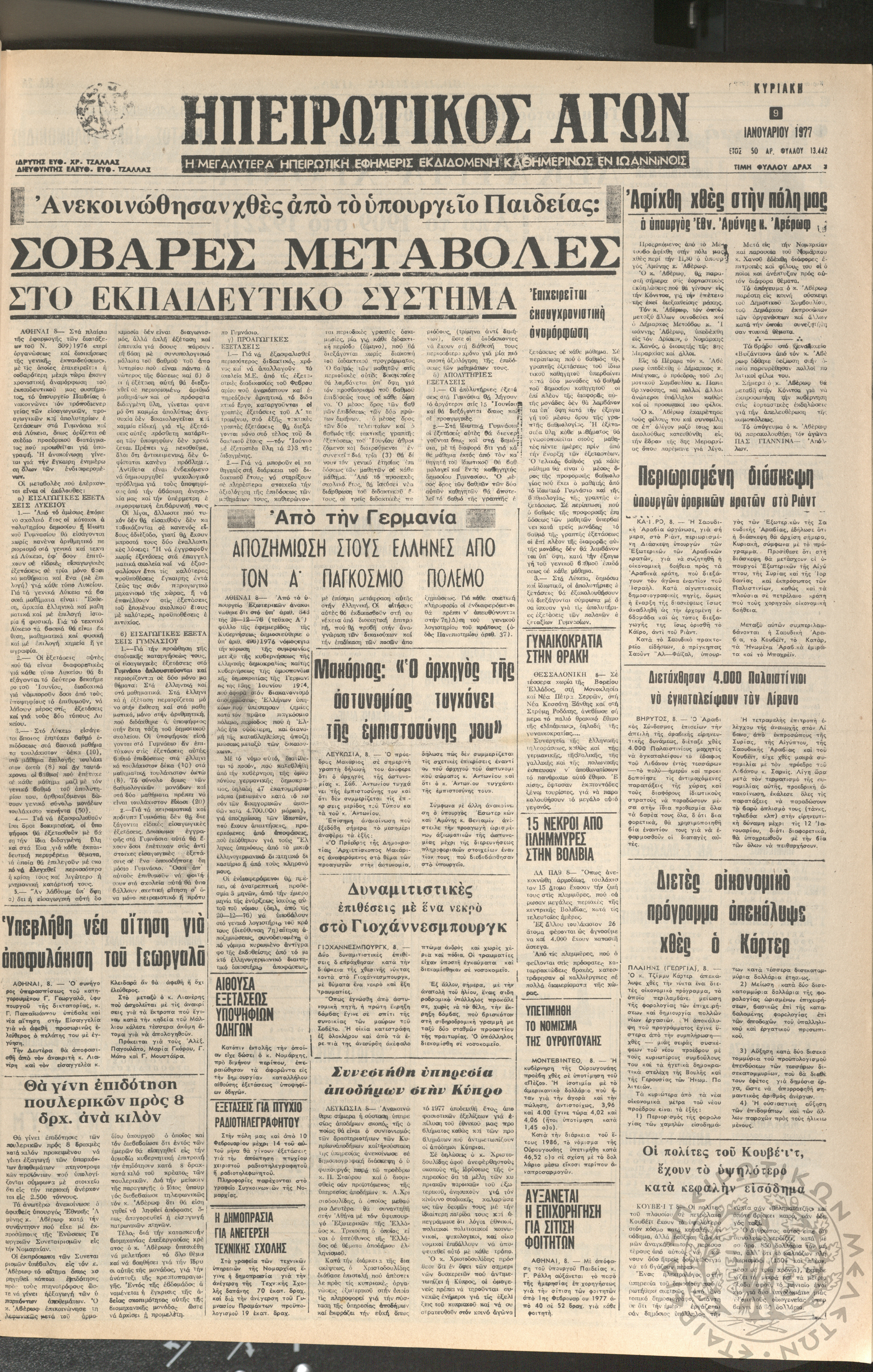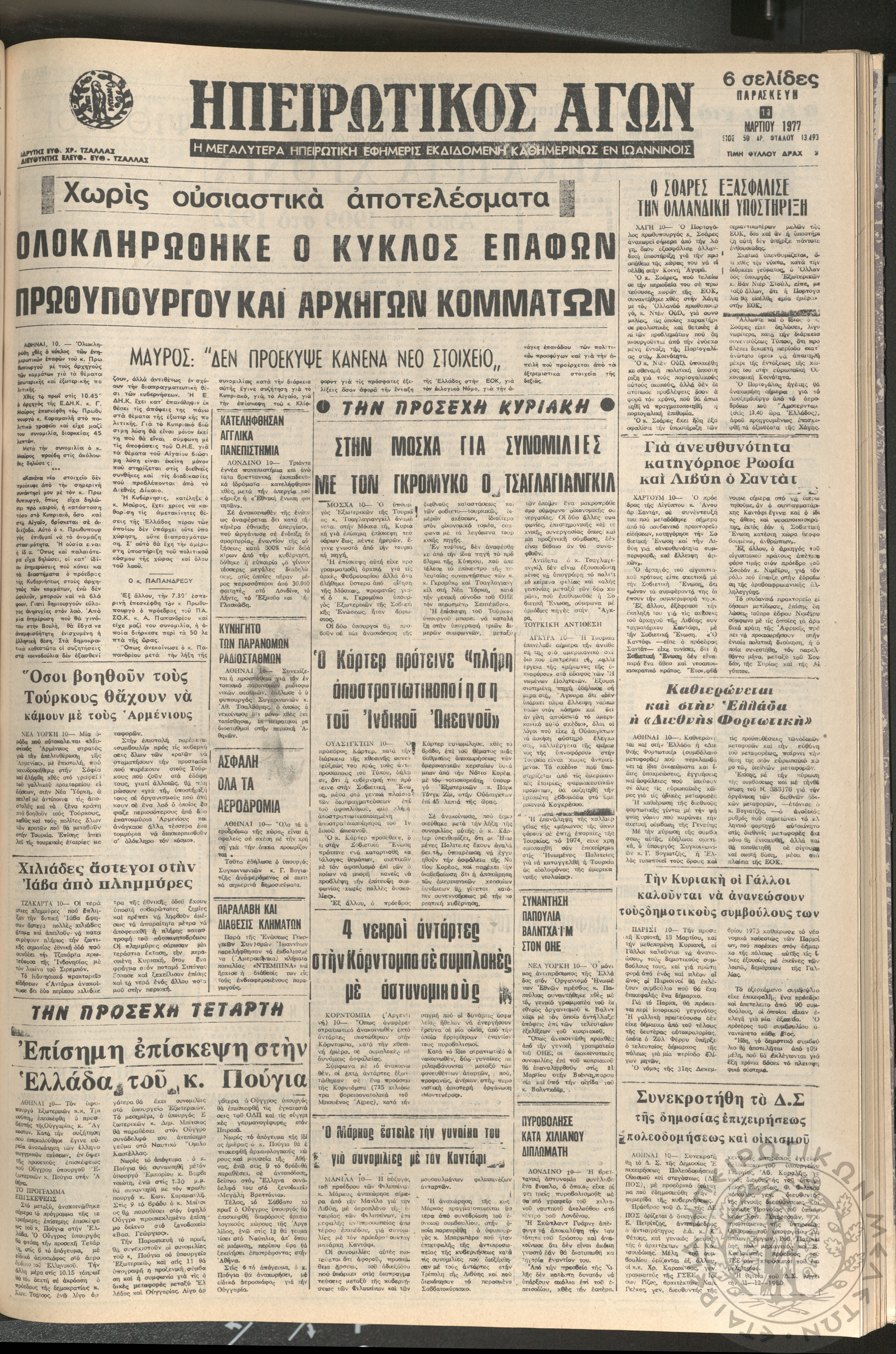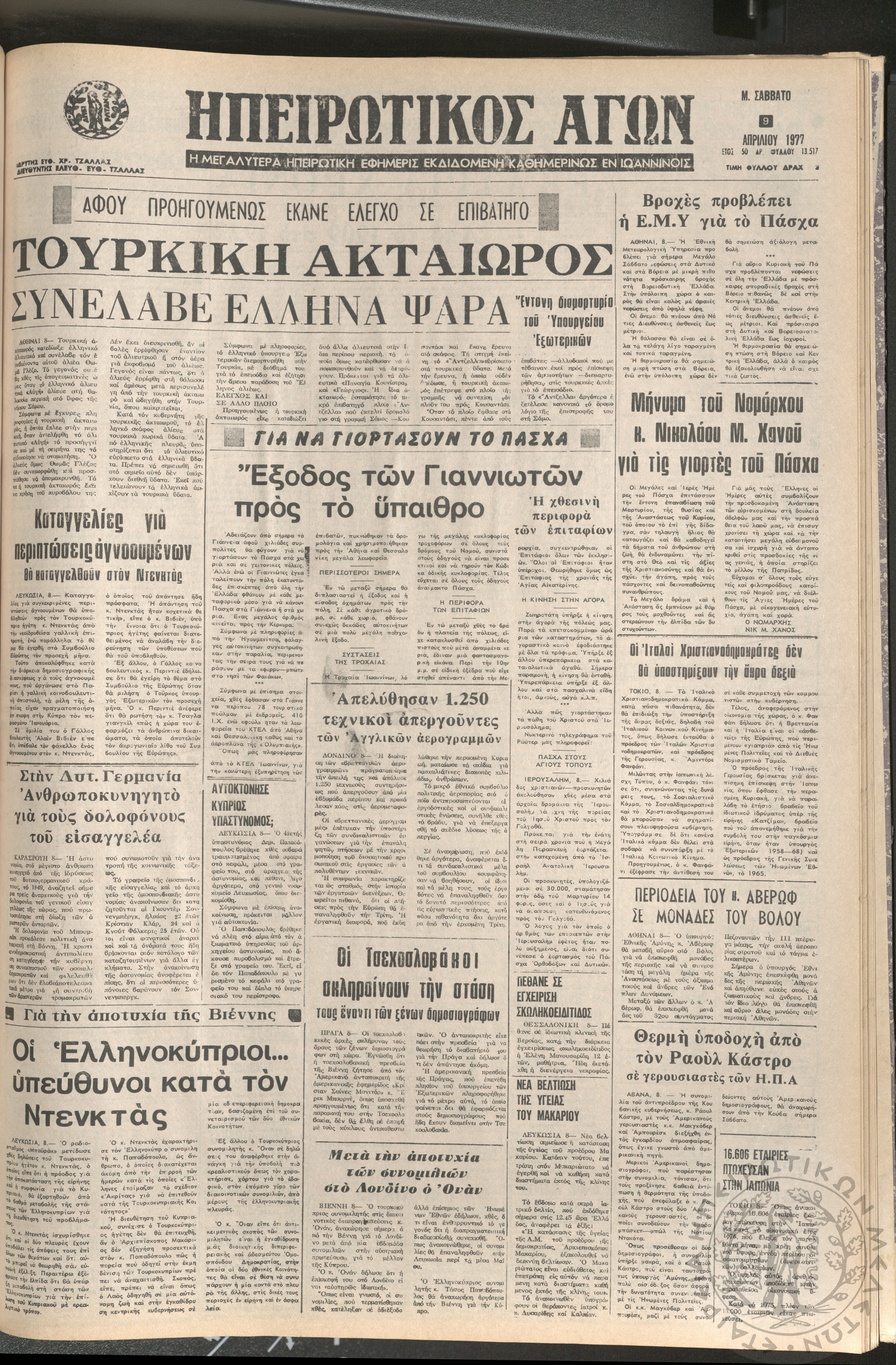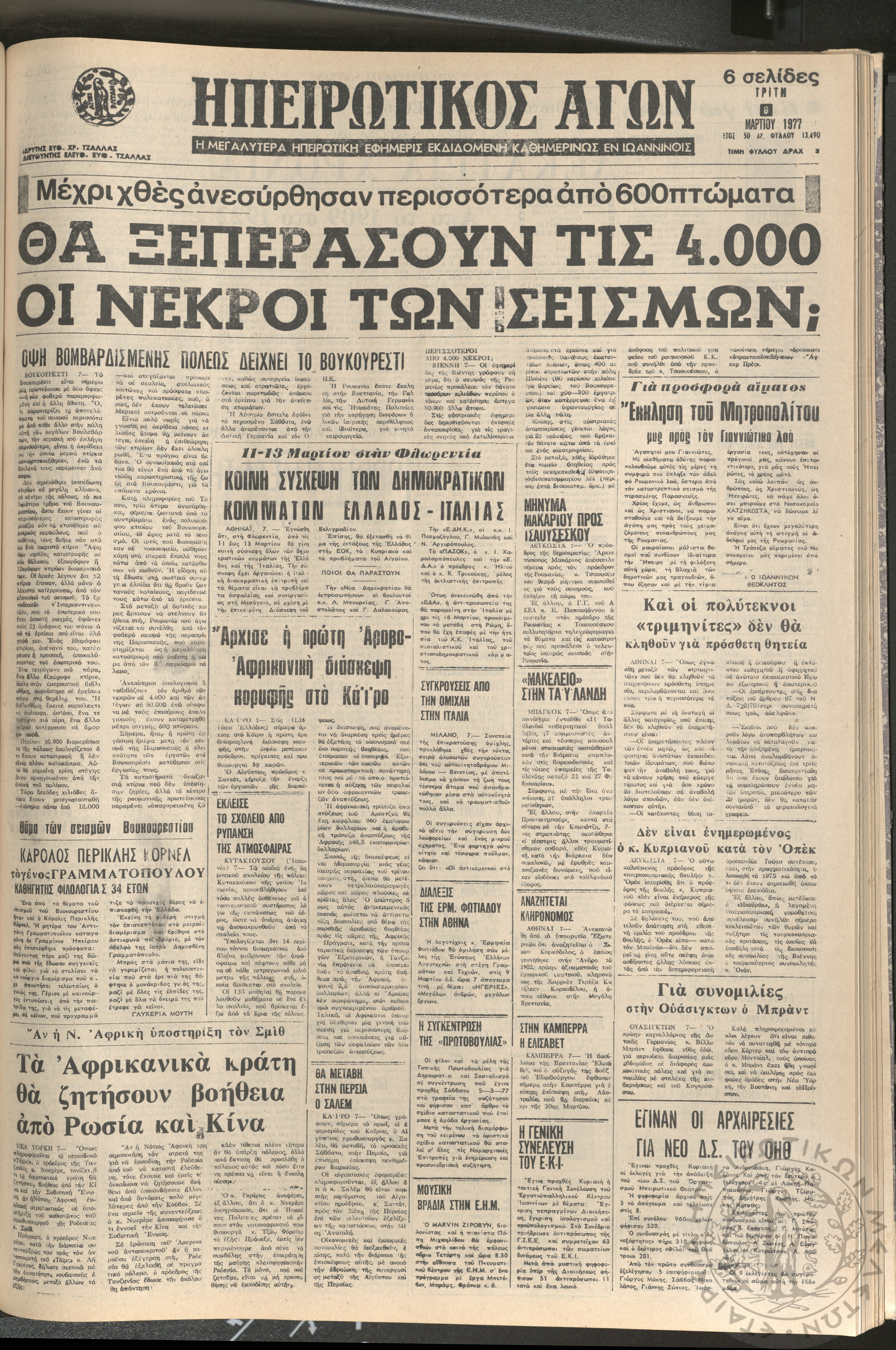 Ηπειρωτικός Αγών: η μεγαλυτέρα ηπειρωτική εφημερίς εκδιδόμενη καθημερινώς εν Ιωαννίνοις 1977 (φ. 13491)Έτος 50, φ. 13491...