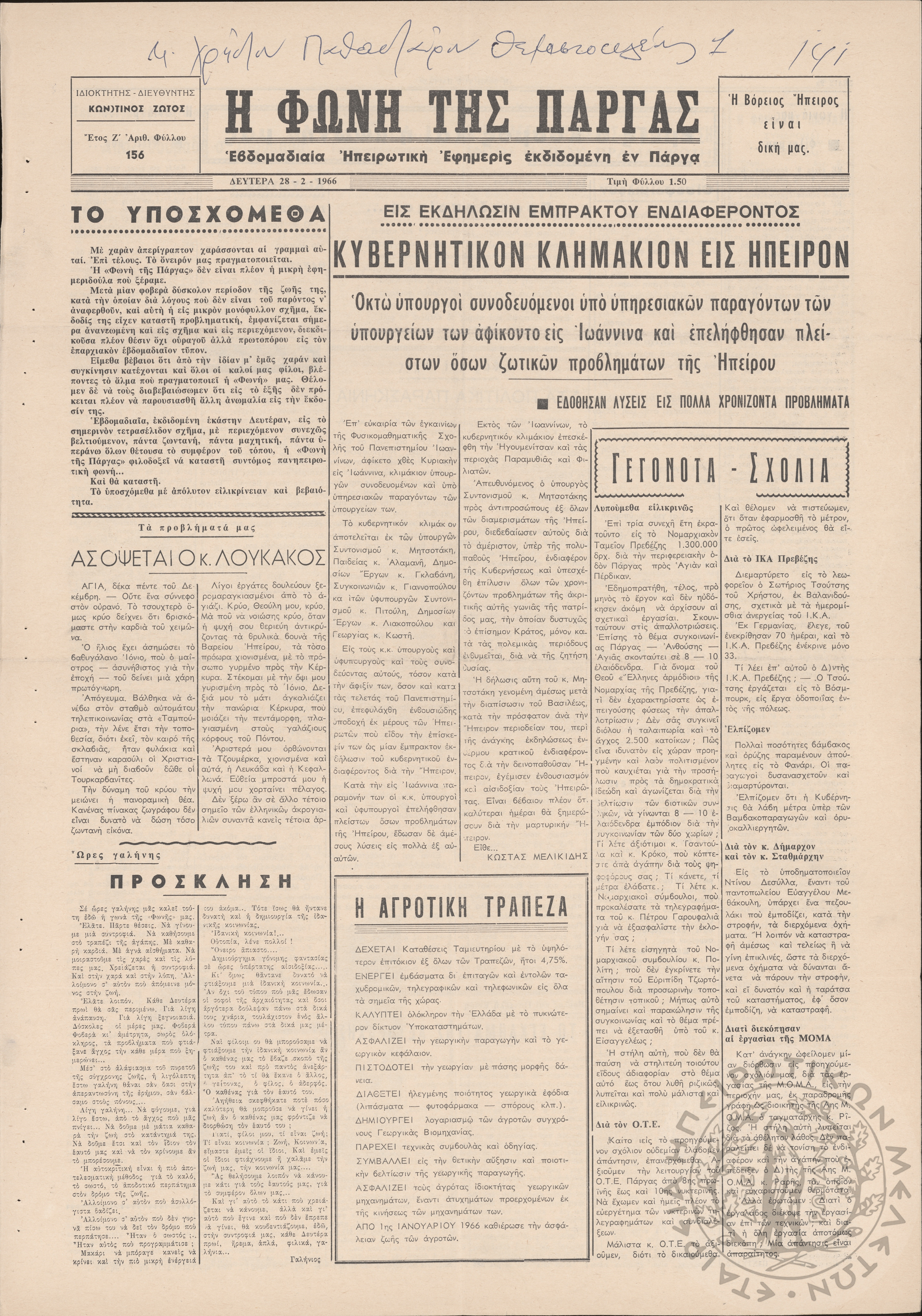 Η Φωνή της Πάργας: εβδομαδιαία Ηπειρωτική εφημερίς εκδιδομένη εν Πάργα, 1966, φ. 156Έτος Ζ΄, φ. 156...