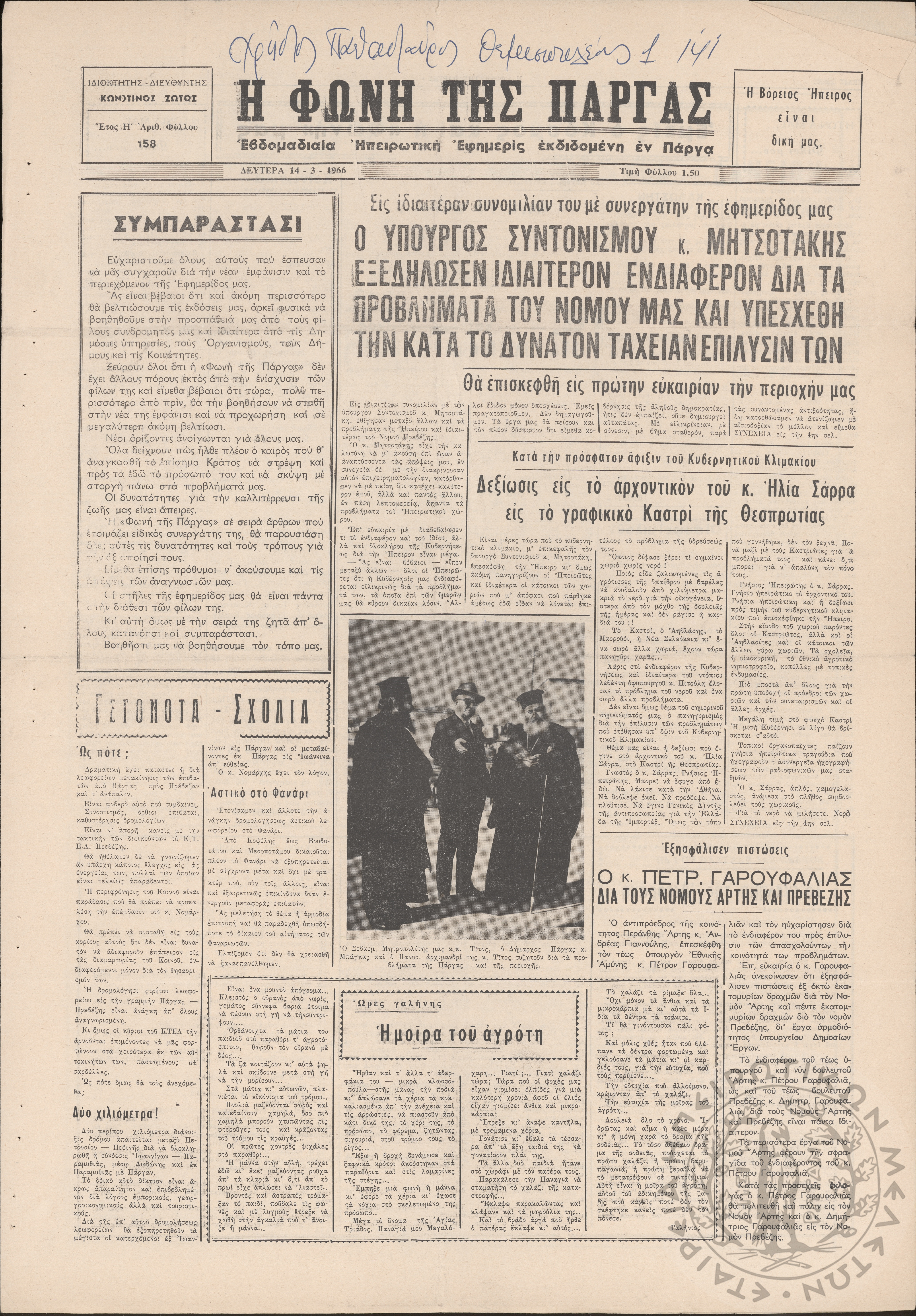 Η Φωνή της Πάργας: εβδομαδιαία Ηπειρωτική εφημερίς εκδιδομένη εν Πάργα, 1966, φ. 158Έτος Ζ΄, φ. 158...