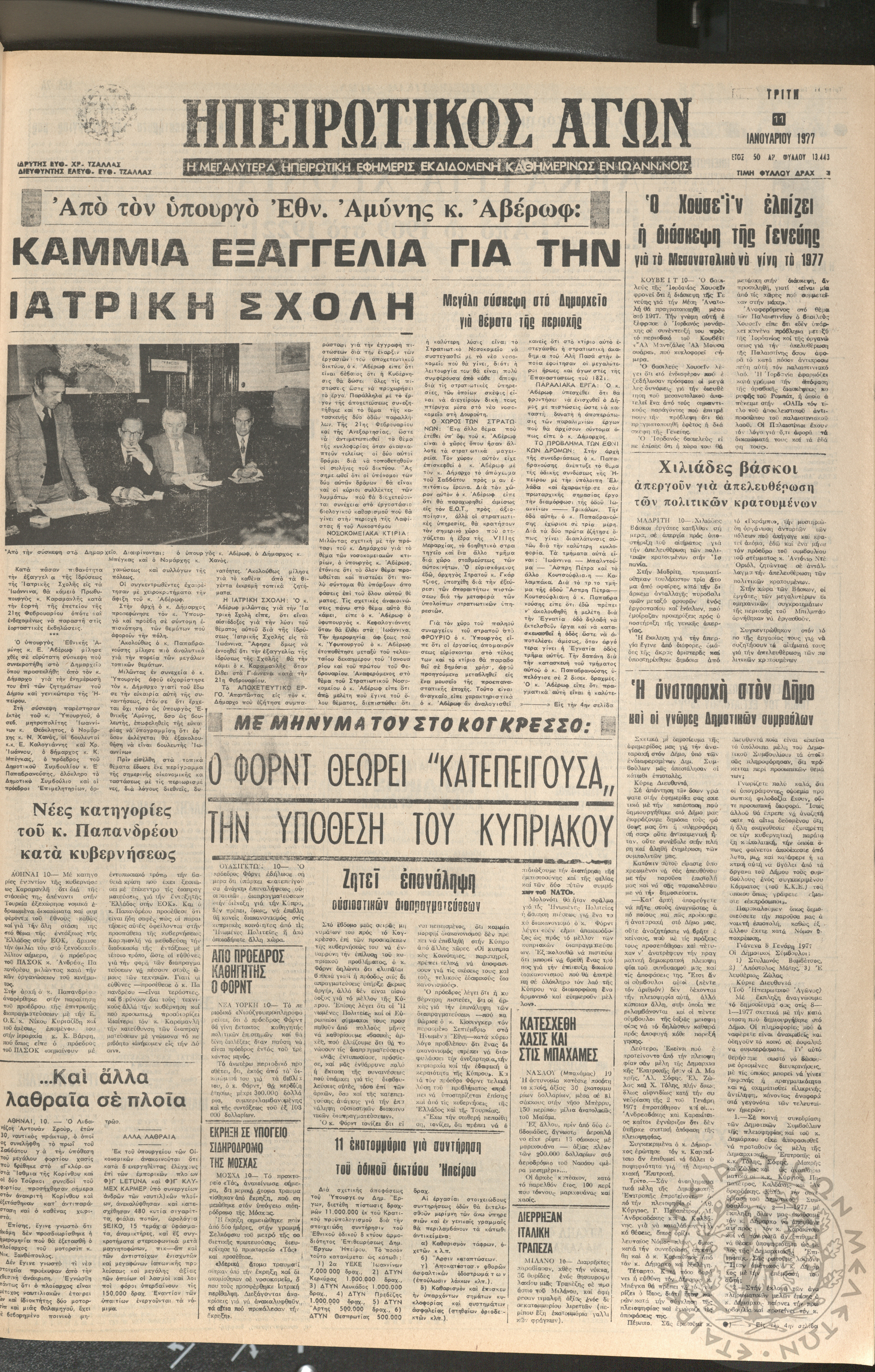 Ηπειρωτικός Αγών: η μεγαλυτέρα ηπειρωτική εφημερίς εκδιδόμενη καθημερινώς εν Ιωαννίνοις 1977 (φ. 13517)Έτος 50, φ. 13517...