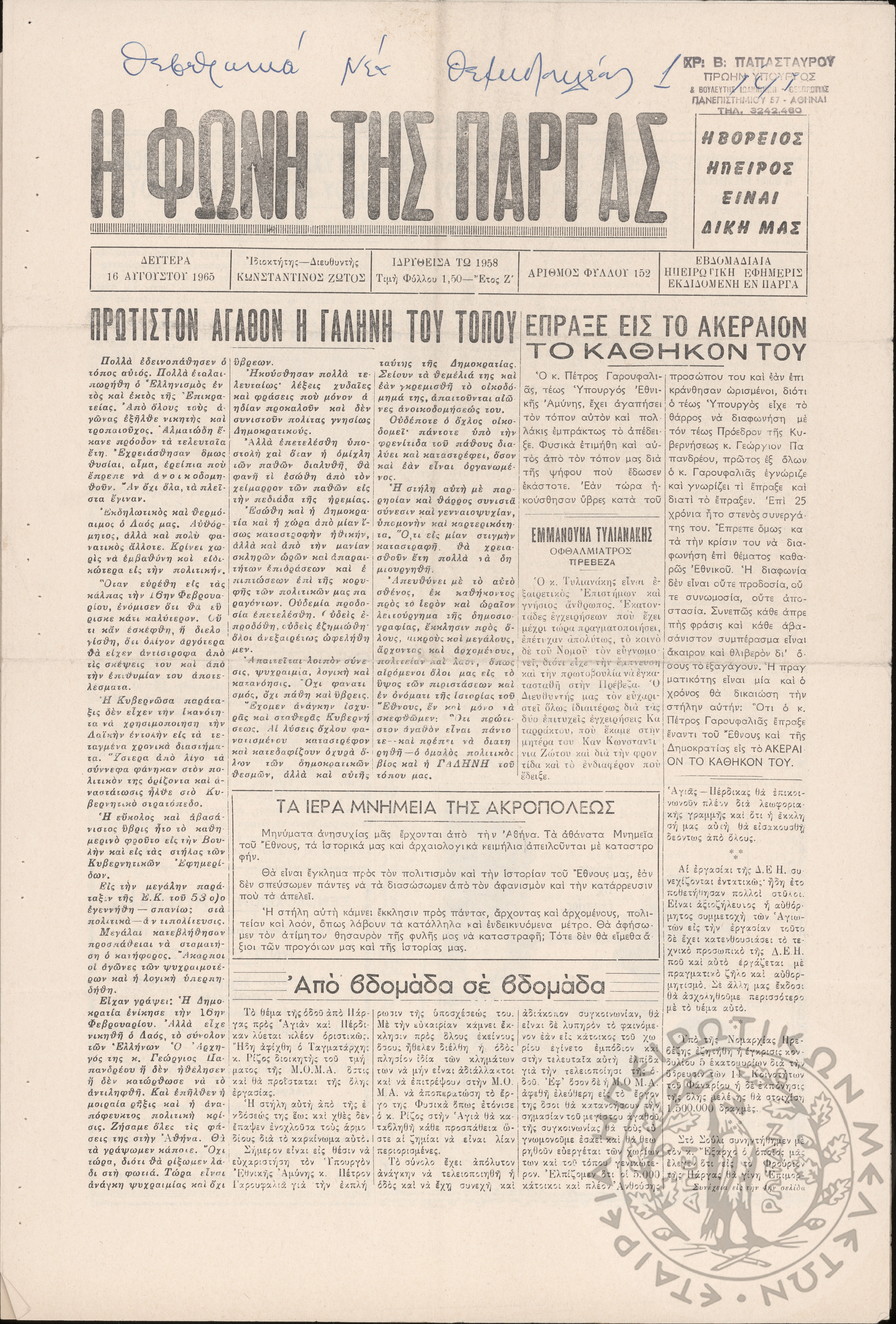 Η Φωνή της Πάργας: εβδομαδιαία Ηπειρωτική εφημερίς εκδιδομένη εν Πάργα, 1965, φ. 152Έτος Ζ΄, φ. 152...