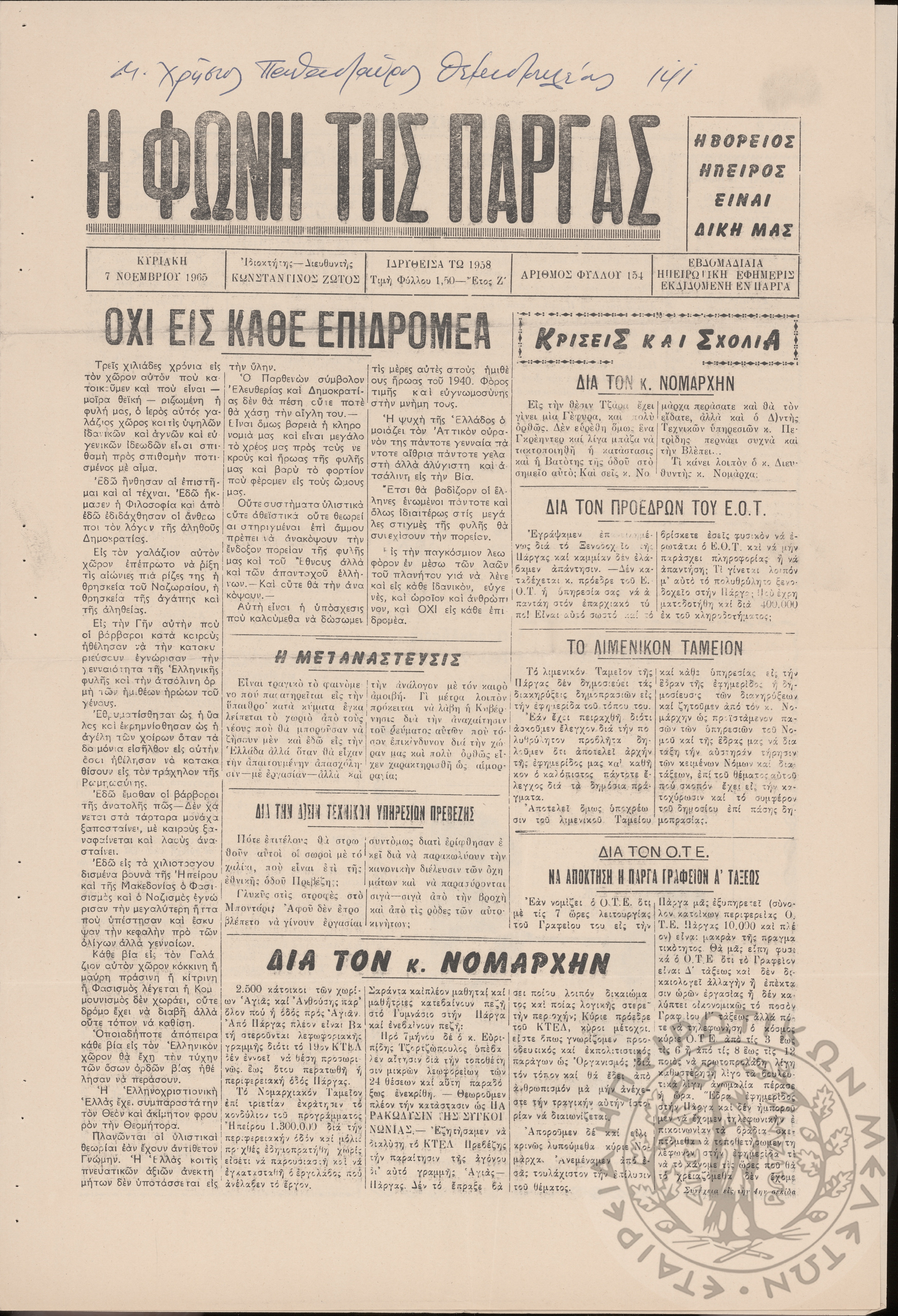 Η Φωνή της Πάργας: εβδομαδιαία Ηπειρωτική εφημερίς εκδιδομένη εν Πάργα, 1965, φ. 154Έτος Ζ΄, φ. 154...