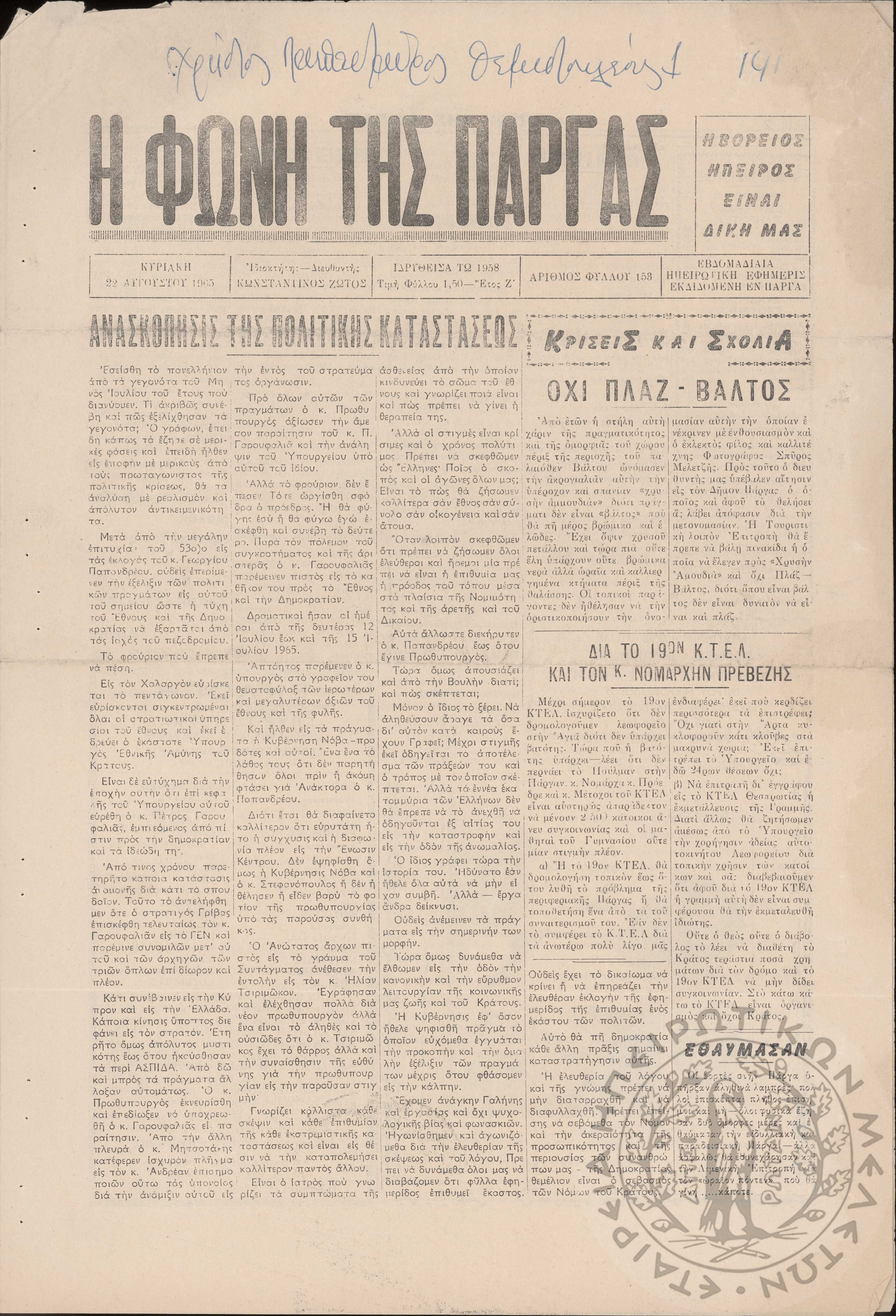Η Φωνή της Πάργας: εβδομαδιαία Ηπειρωτική εφημερίς εκδιδομένη εν Πάργα, 1965, φ. 153Έτος Ζ΄, φ. 153...