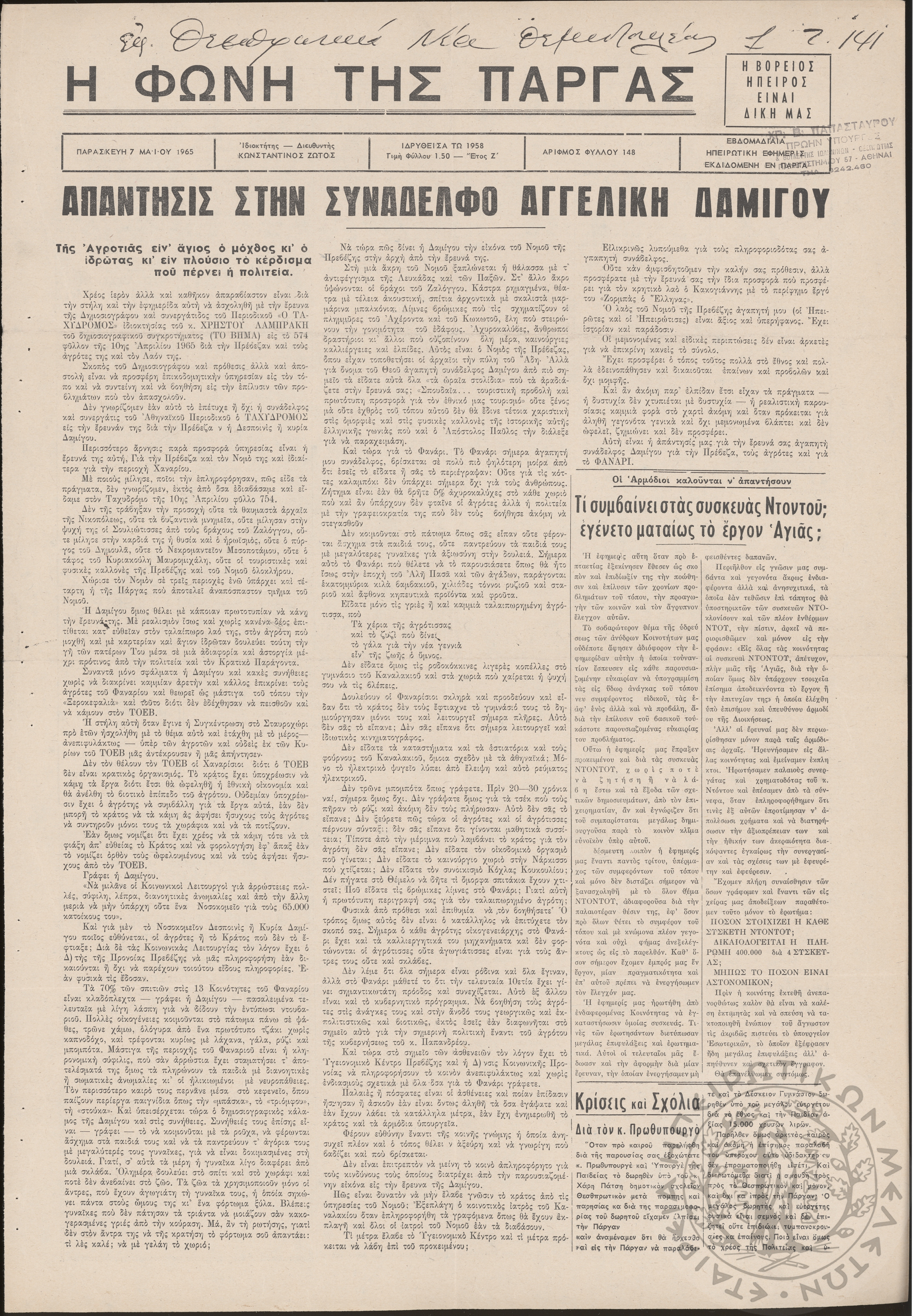 Η Φωνή της Πάργας: εβδομαδιαία Ηπειρωτική εφημερίς εκδιδομένη εν Πάργα, 1965, φ. 148Έτος Ζ΄, φ. 148...