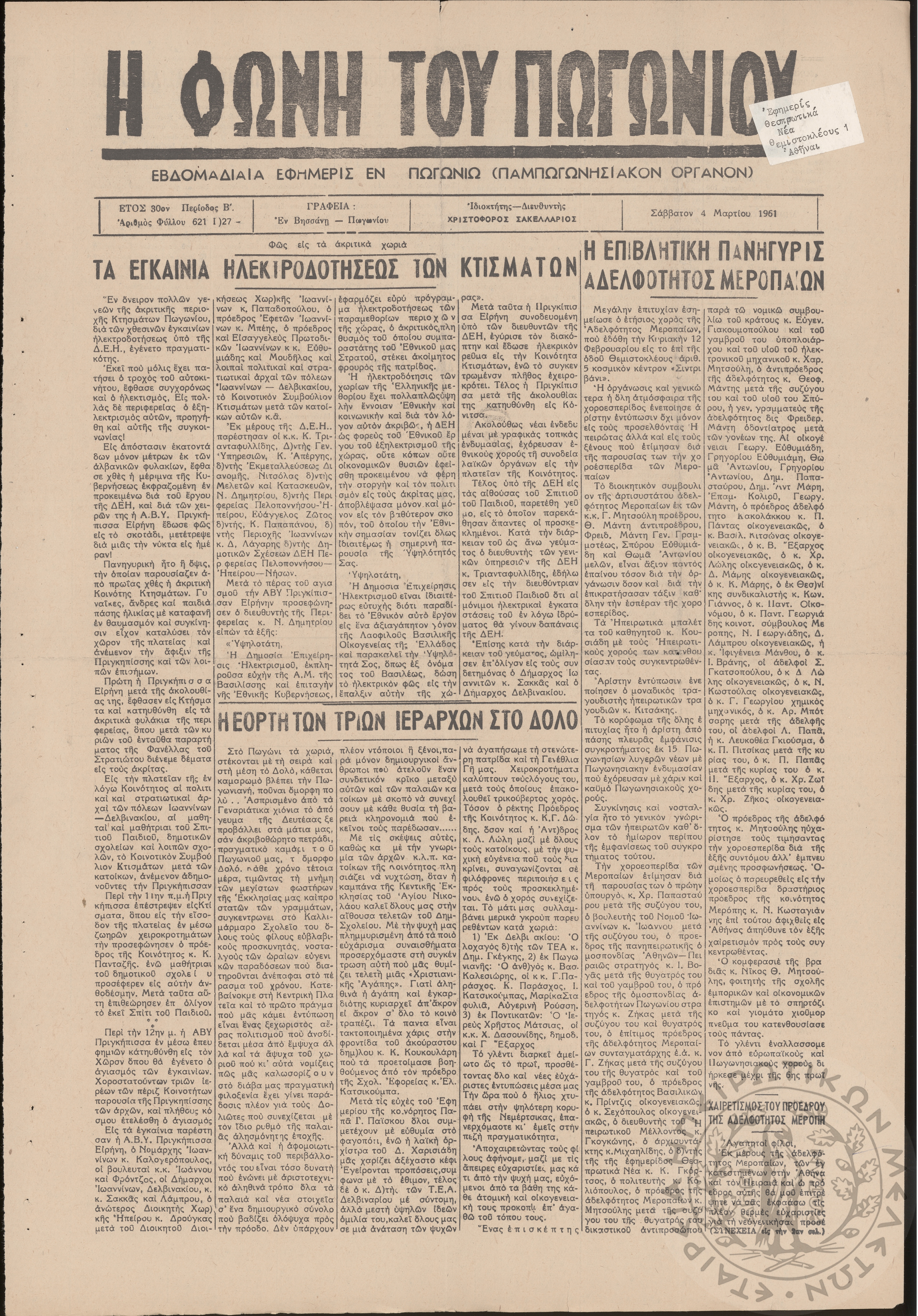 Η φωνή του Πωγωνίου: εβδομαδιαία εφημερίς εν Πωγωνίω (Παμπωγωνησιακόν όργανον), 1961, φ. 621Έτος 30, φ. 621...