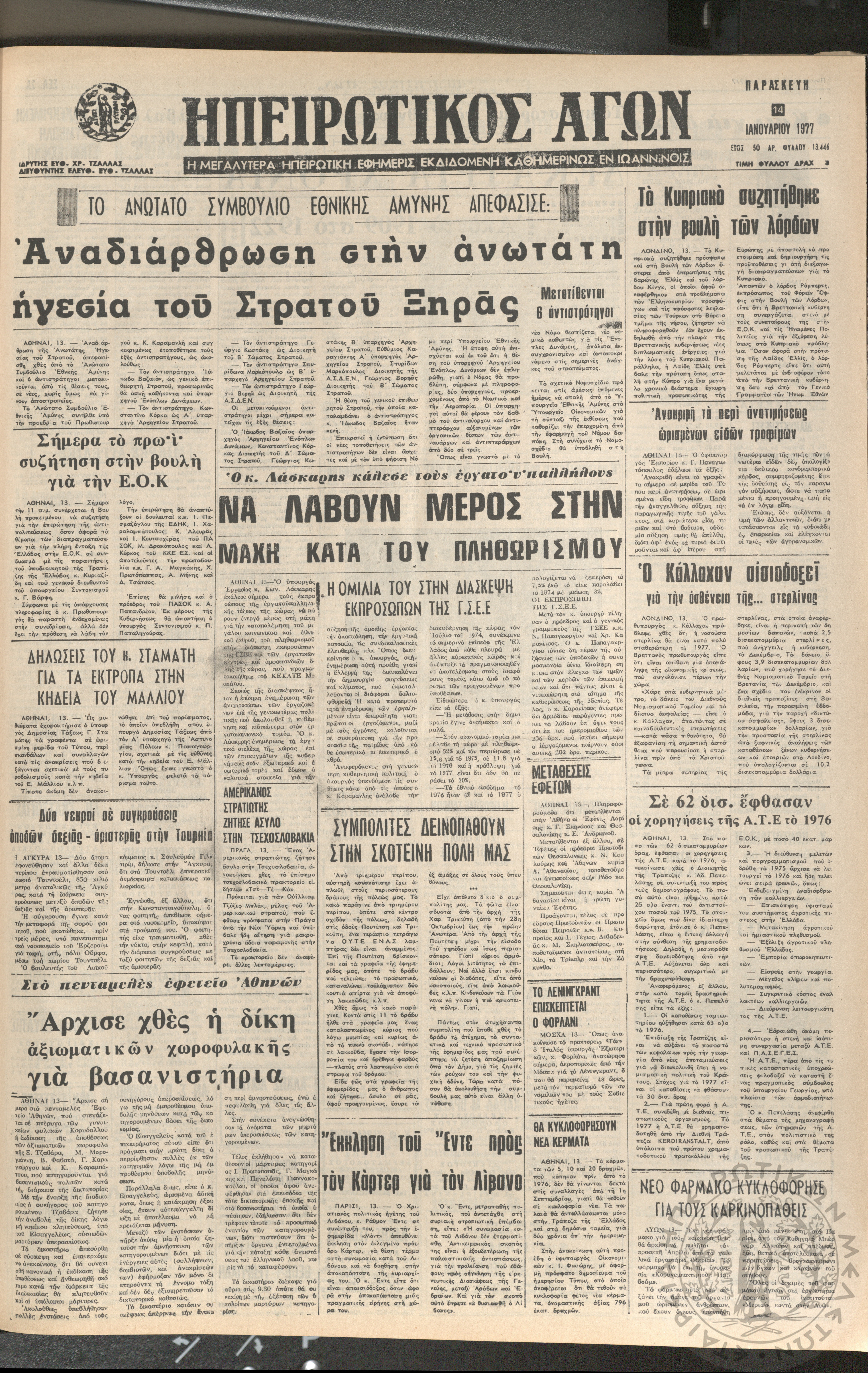 Ηπειρωτικός Αγών: η μεγαλυτέρα ηπειρωτική εφημερίς εκδιδόμενη καθημερινώς εν Ιωαννίνοις 1977 (φ. 13446)Έτος 50, φ. 13446...