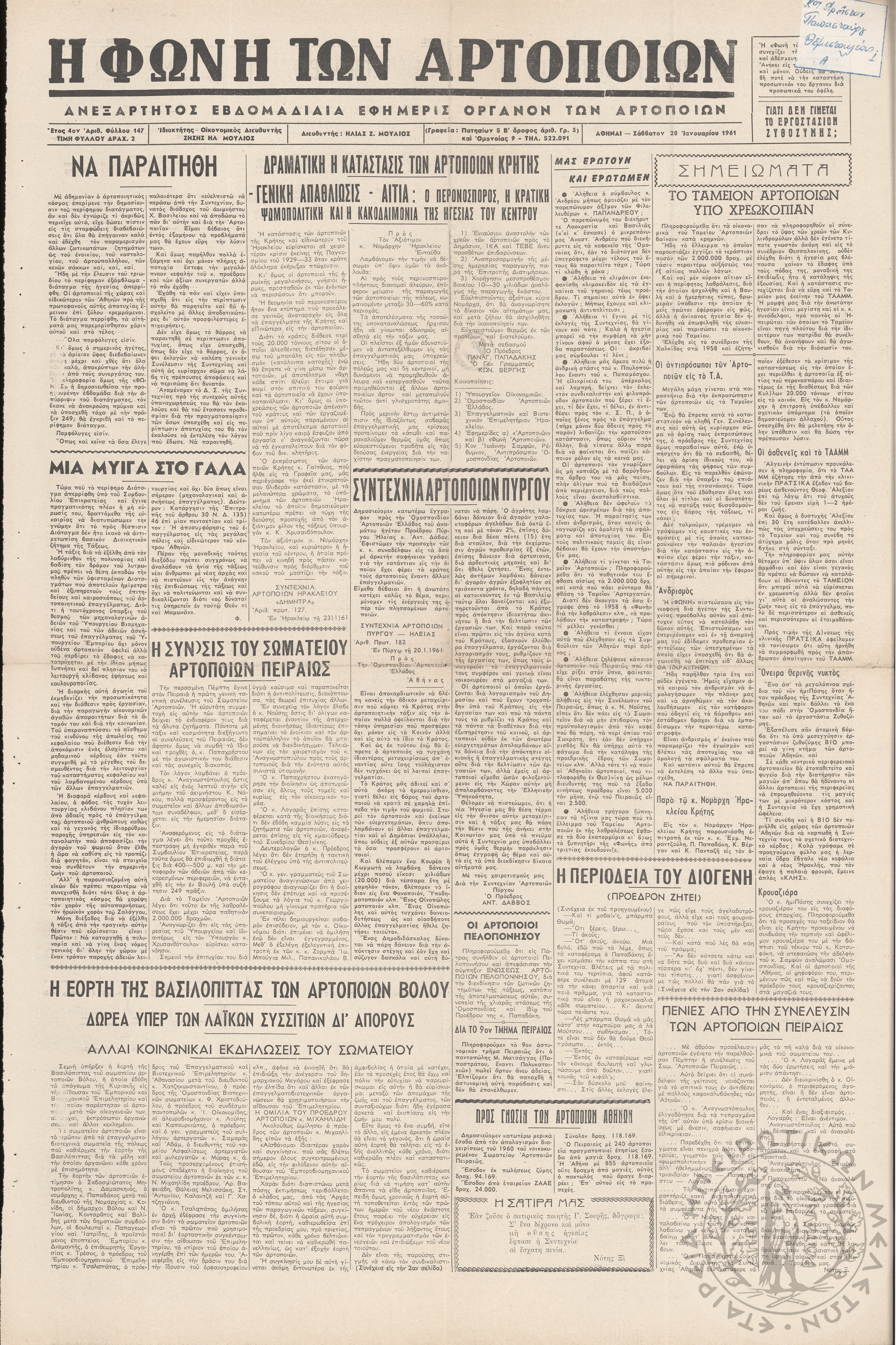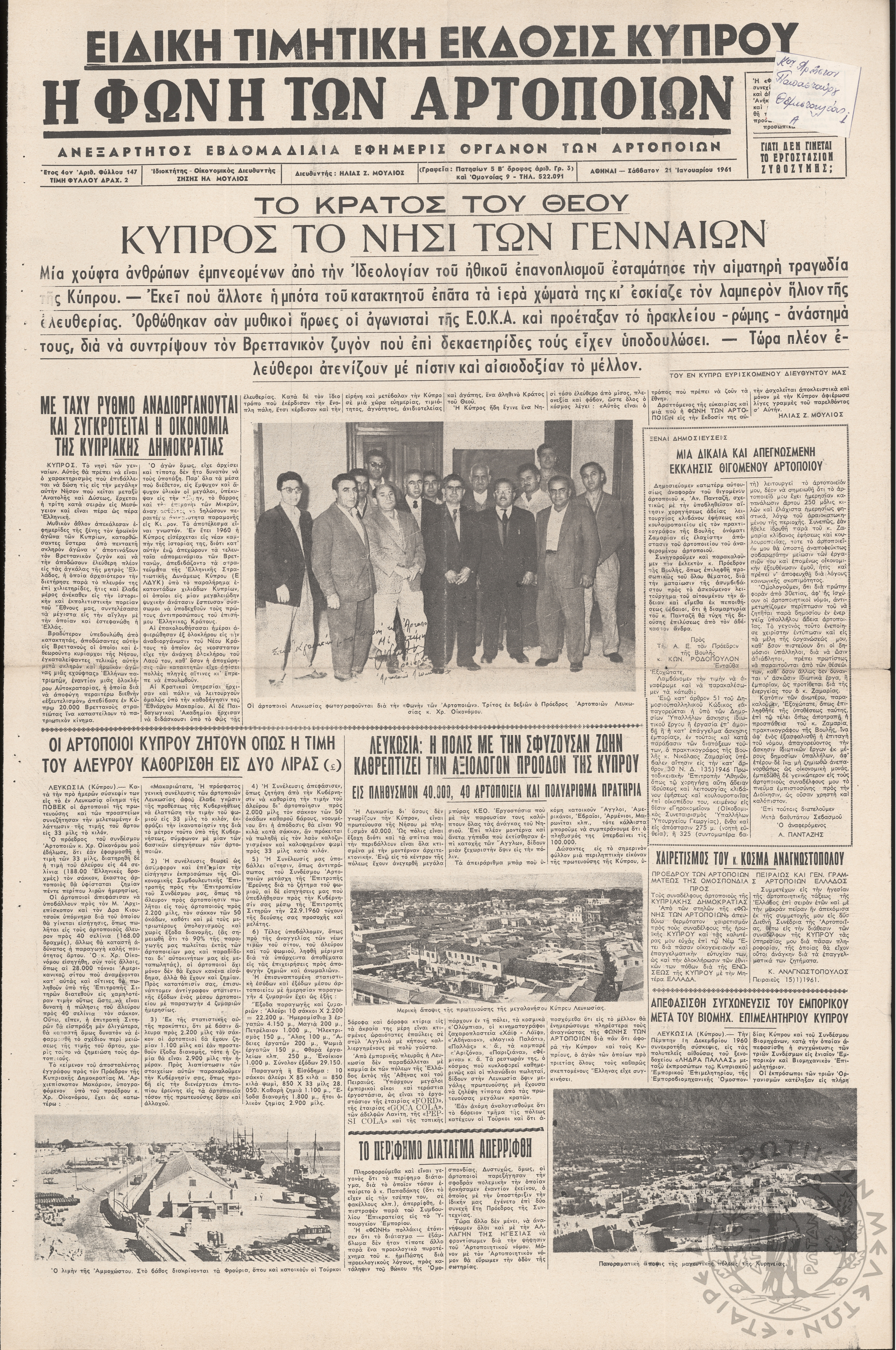 Η φωνή των αρτοποιών: Ανεξάρτητος εβδομαδιαία εφημερίς όργανον των αρτοποιών (τευχ. 147 - τιμητική έκδ. Κύπρου)Έτος 4, φ. 147...