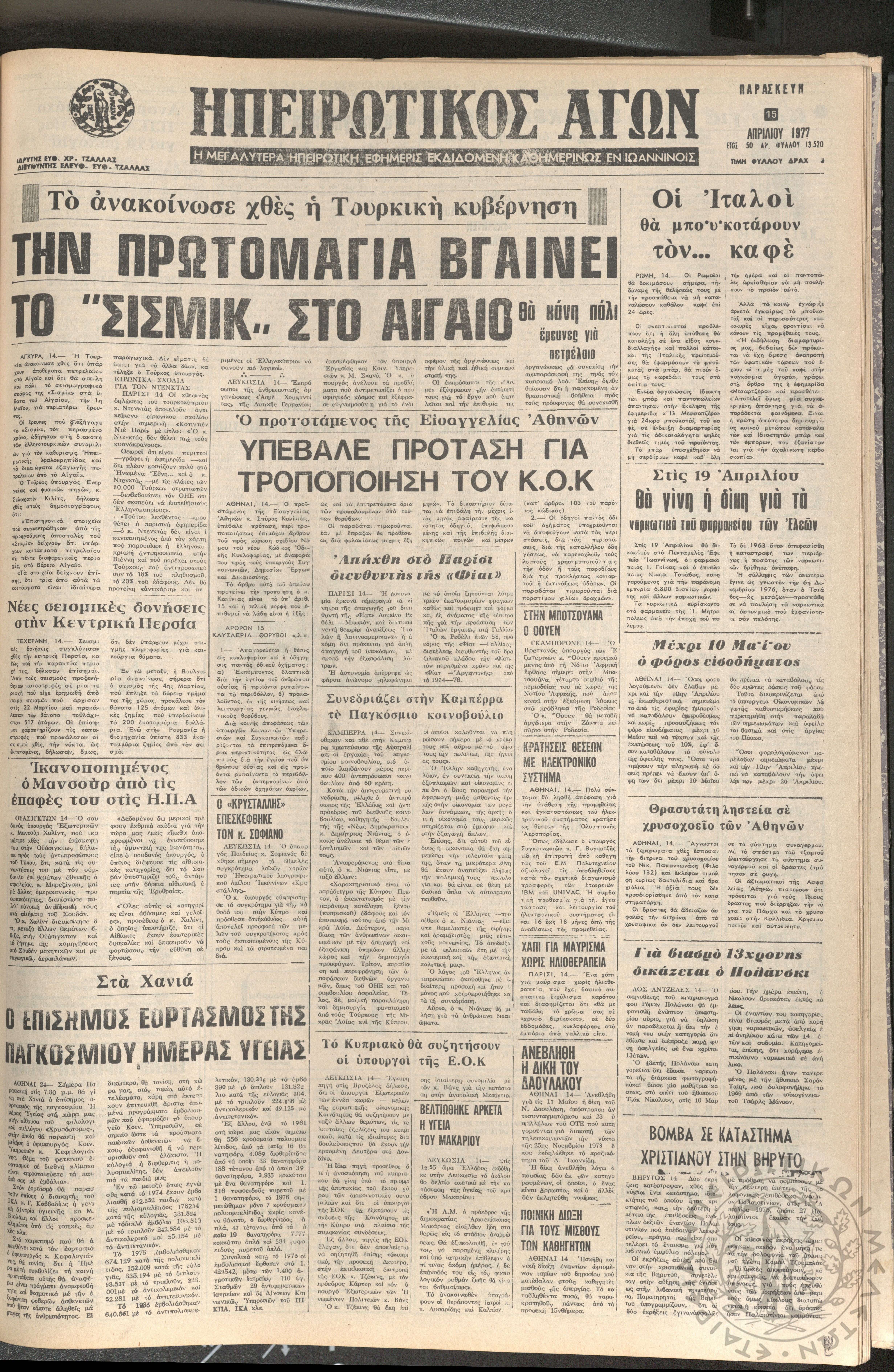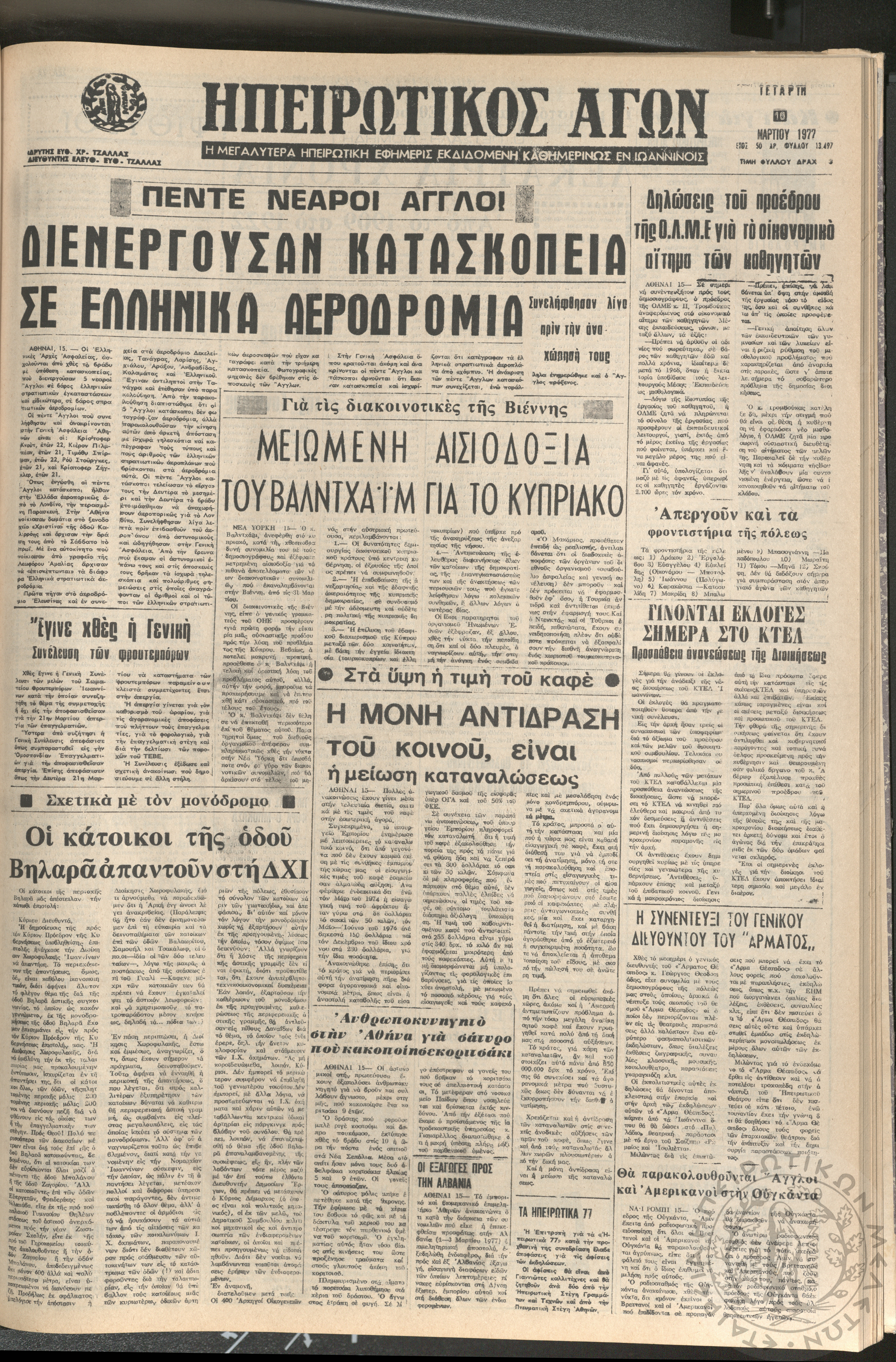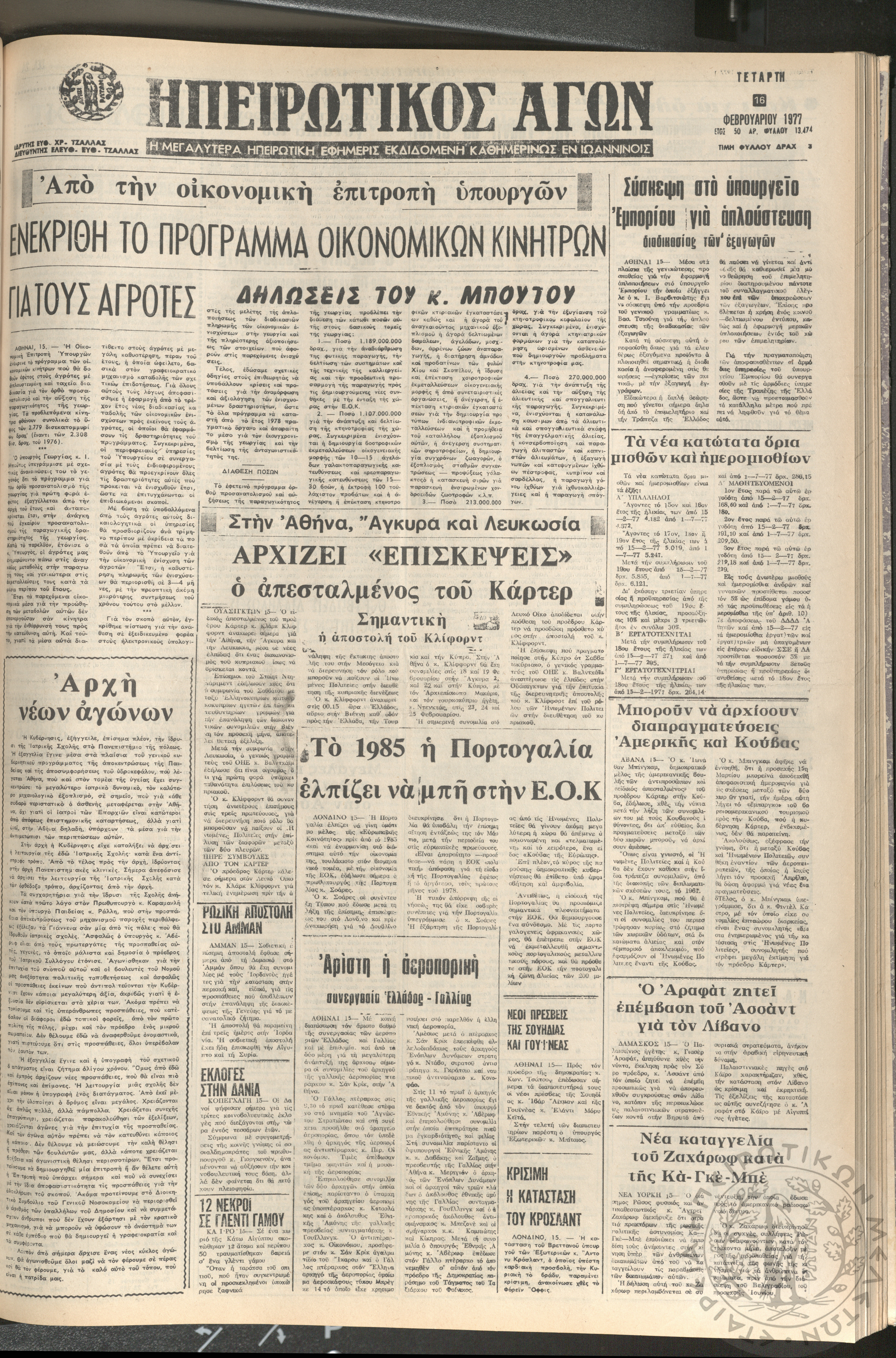Ηπειρωτικός Αγών: η μεγαλυτέρα ηπειρωτική εφημερίς εκδιδόμενη καθημερινώς εν Ιωαννίνοις 1977 (φ. 13474)Έτος 50, φ. 13474...