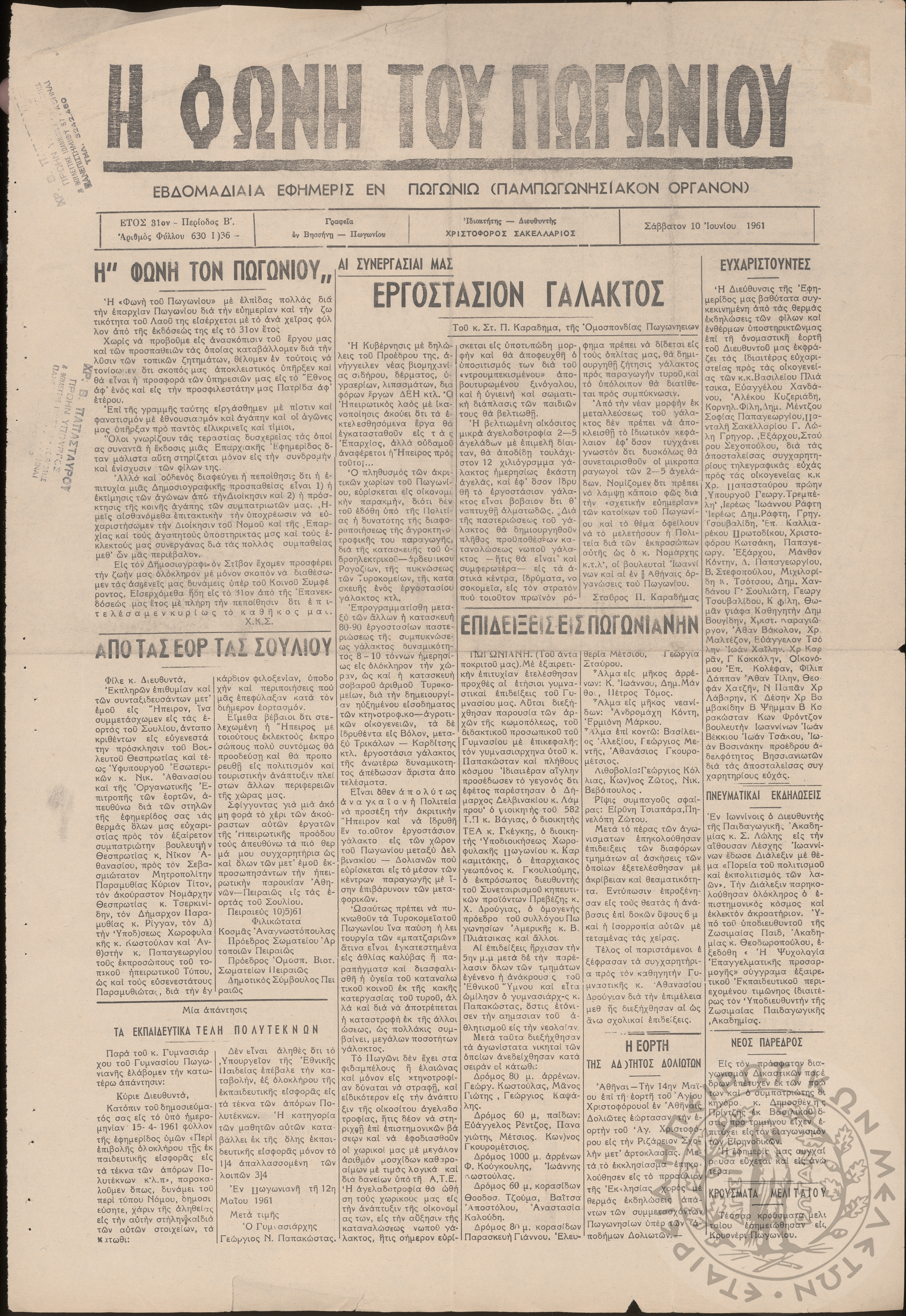 Η φωνή του Πωγωνίου: εβδομαδιαία εφημερίς εν Πωγωνίω (Παμπωγωνησιακόν όργανον), 1961, φ. 630Έτος 31, φ. 630...