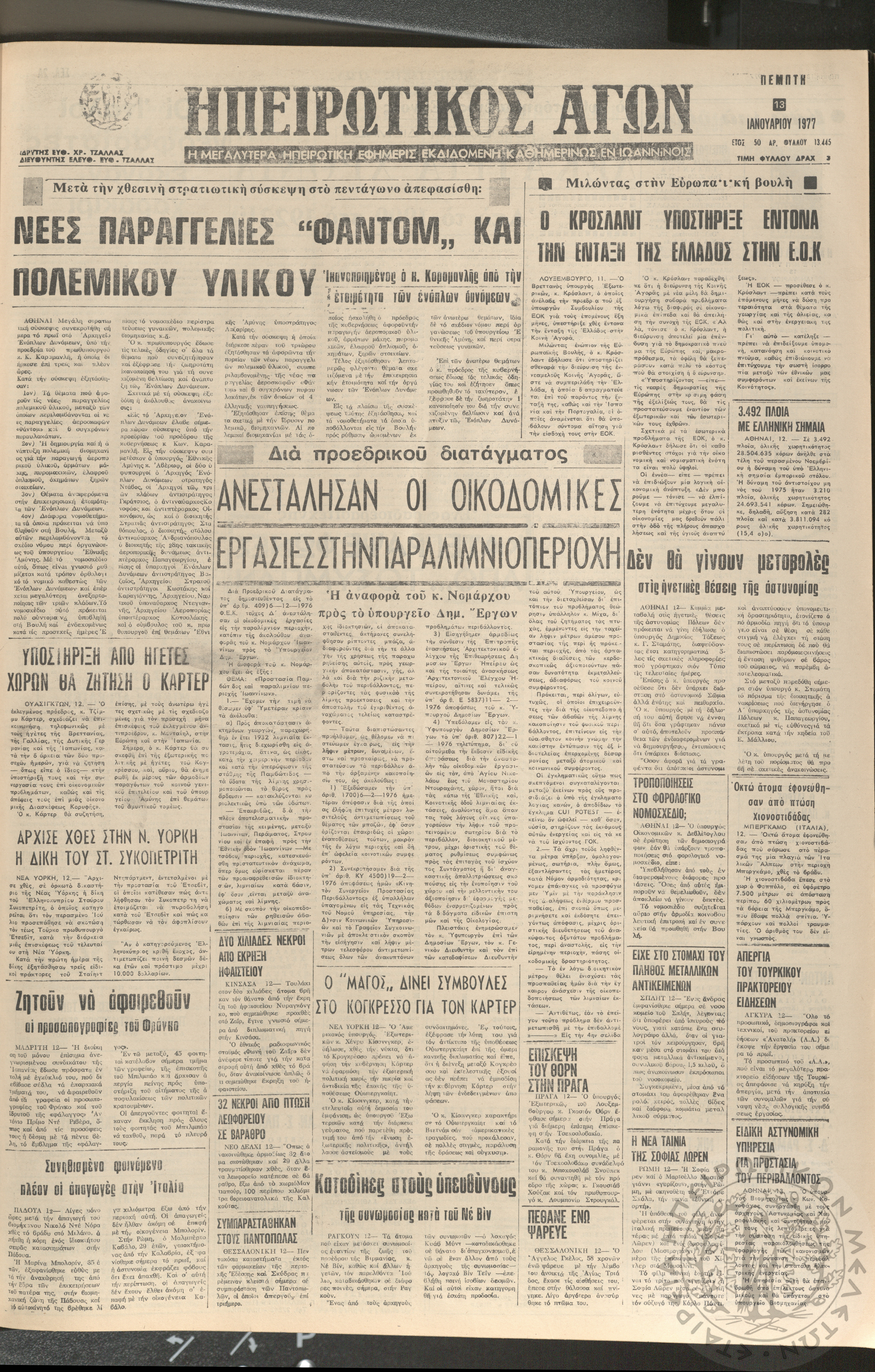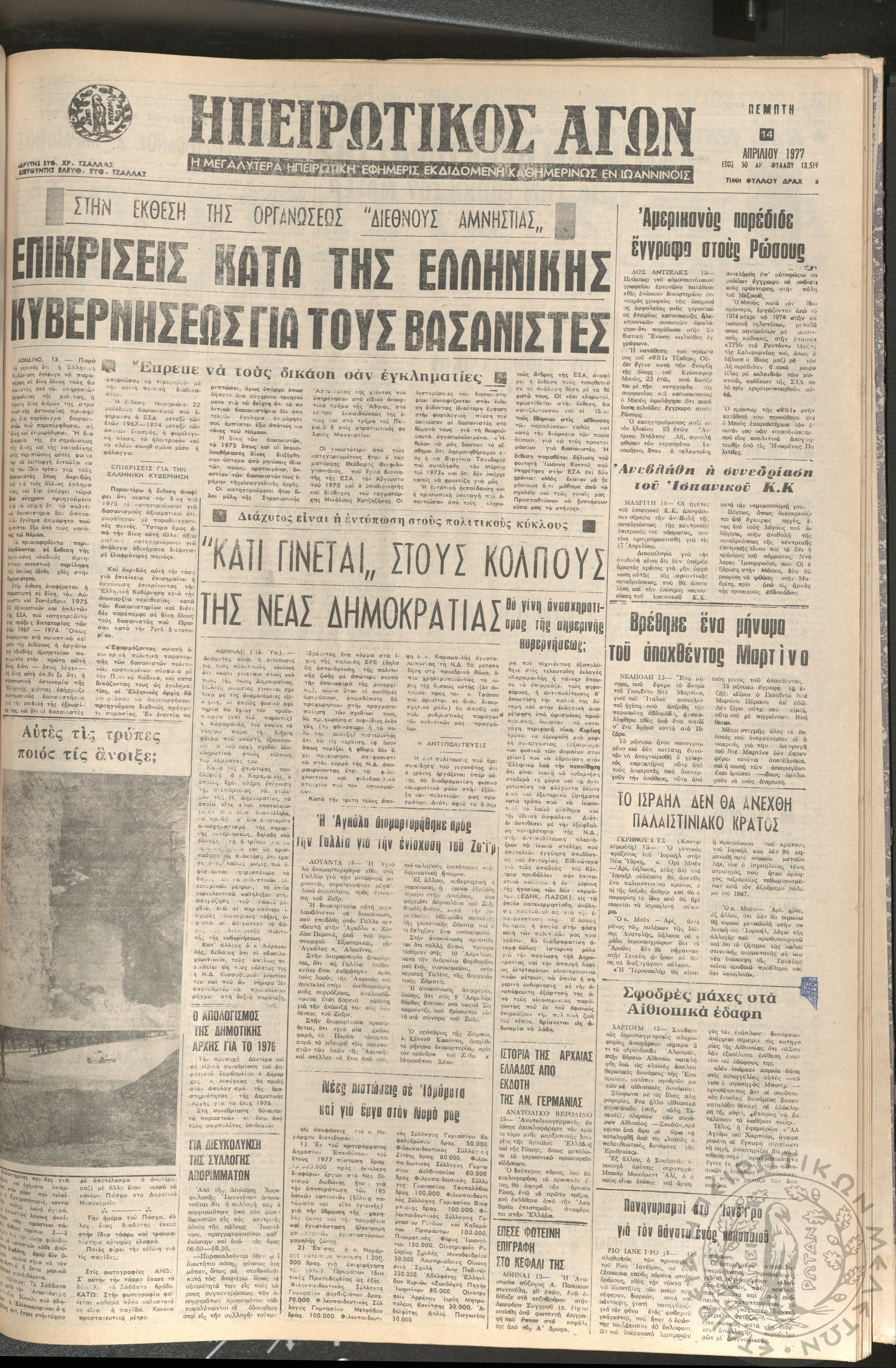 Ηπειρωτικός Αγών: η μεγαλυτέρα ηπειρωτική εφημερίς εκδιδόμενη καθημερινώς εν Ιωαννίνοις 1977 (φ. 13519)Έτος 50, φ. 13519...