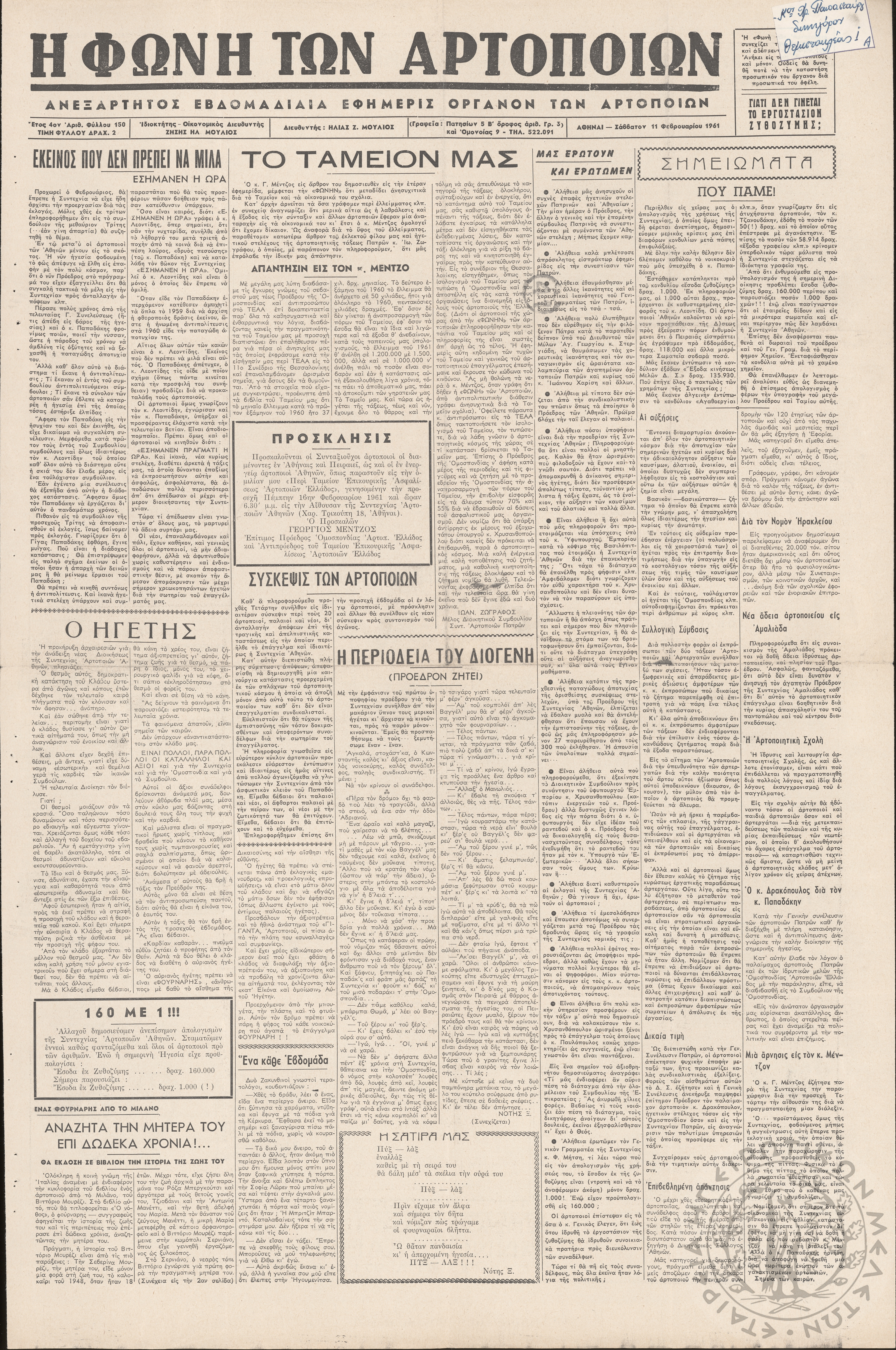 Η φωνή των αρτοποιών: Ανεξάρτητος εβδομαδιαία εφημερίς όργανον των αρτοποιών (τευχ. 150)Έτος 4, φ. 150...