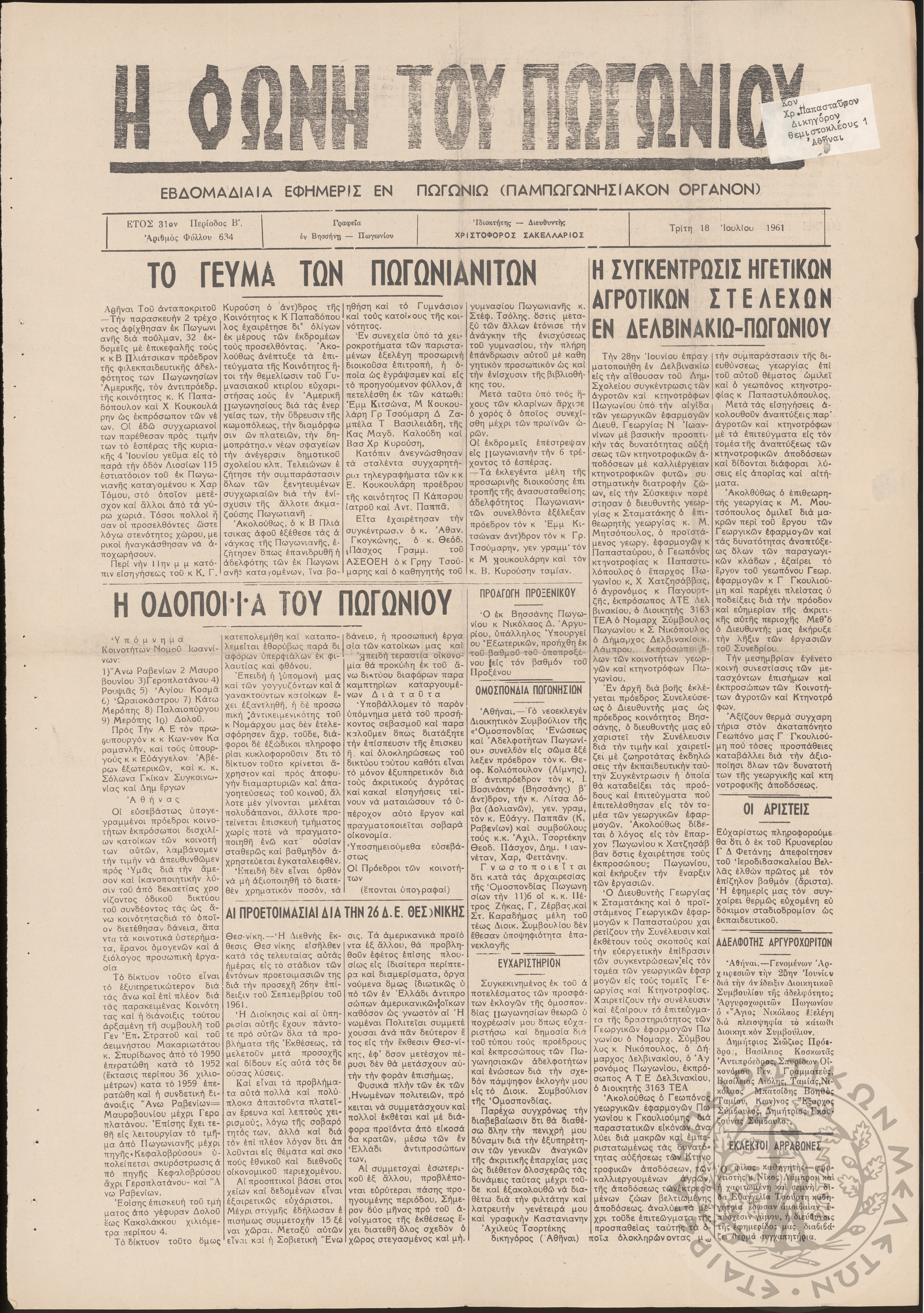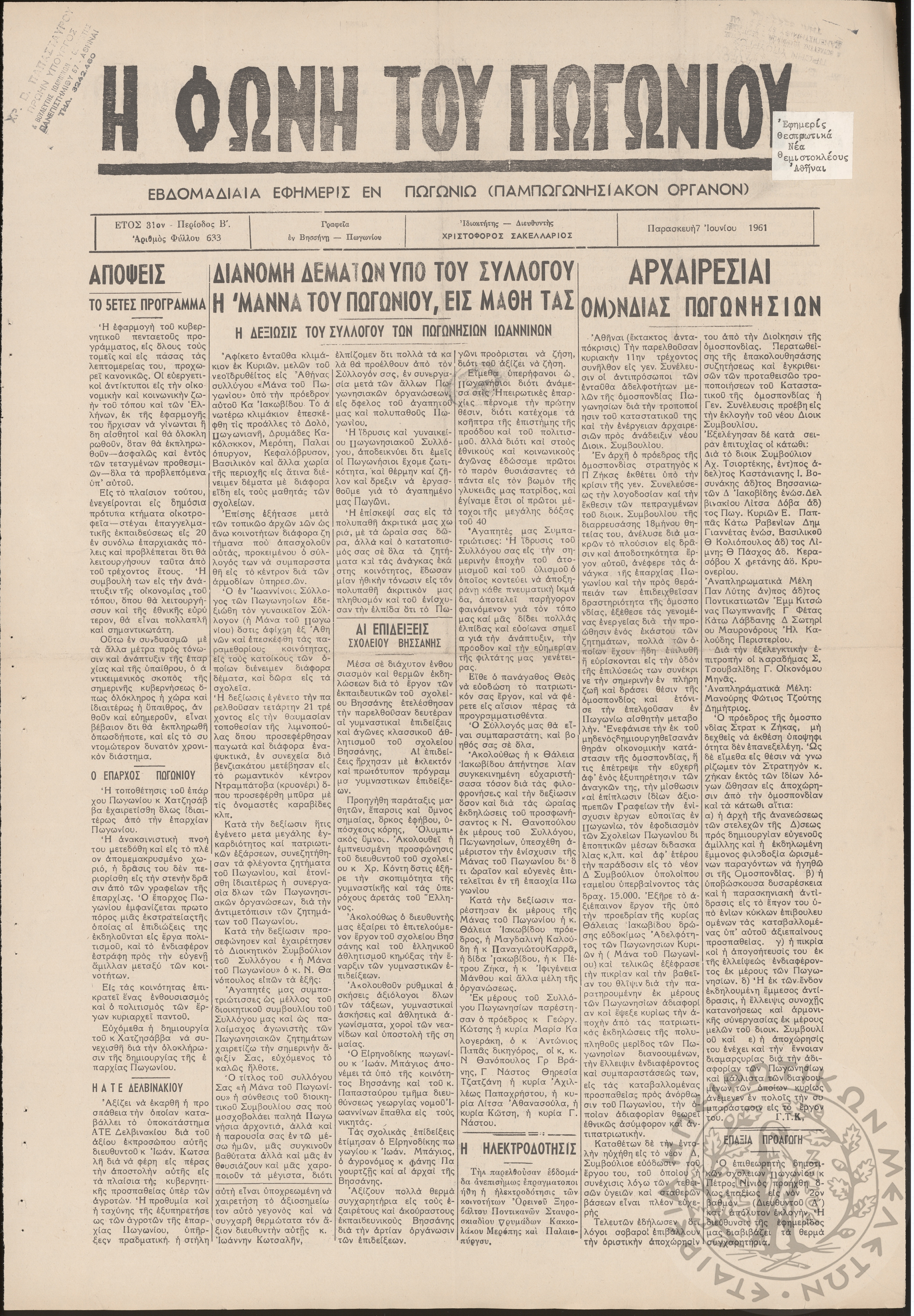Η φωνή του Πωγωνίου: εβδομαδιαία εφημερίς εν Πωγωνίω (Παμπωγωνησιακόν όργανον), 1961, φ. 633Έτος 31, φ. 633...