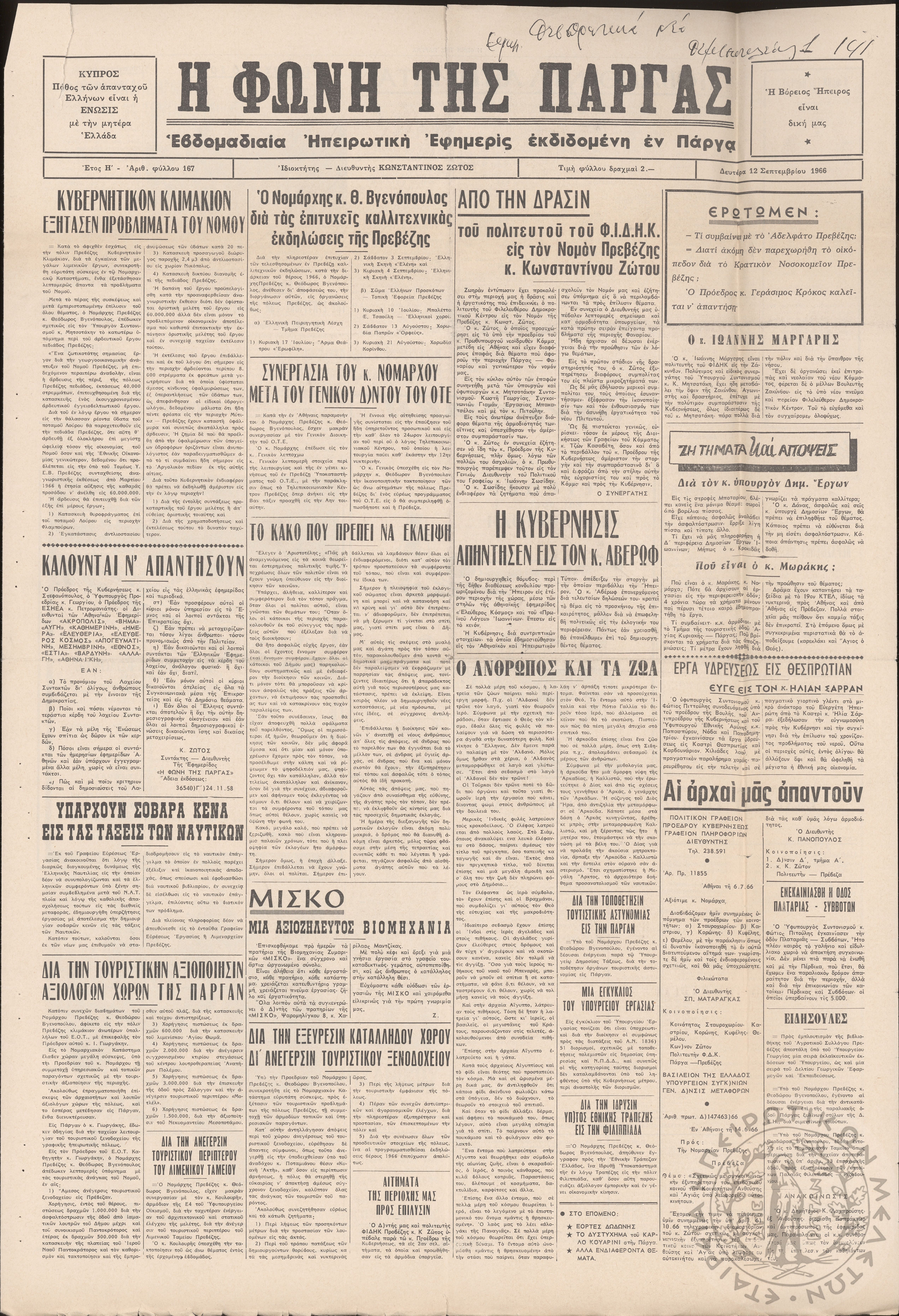 Η Φωνή της Πάργας: εβδομαδιαία Ηπειρωτική εφημερίς εκδιδομένη εν Πάργα, 1966, φ. 167Έτος H΄, φ. 167...